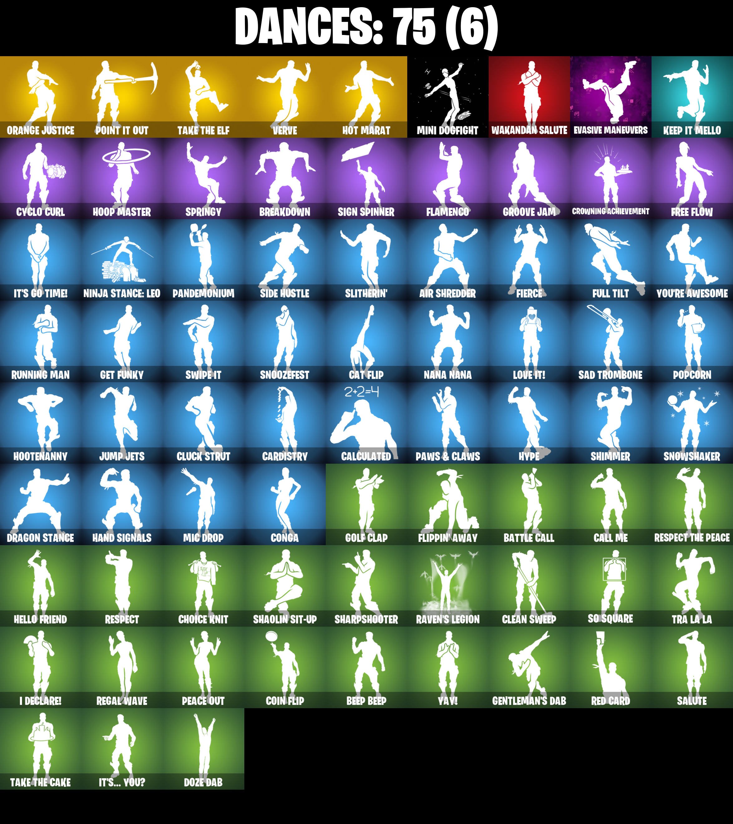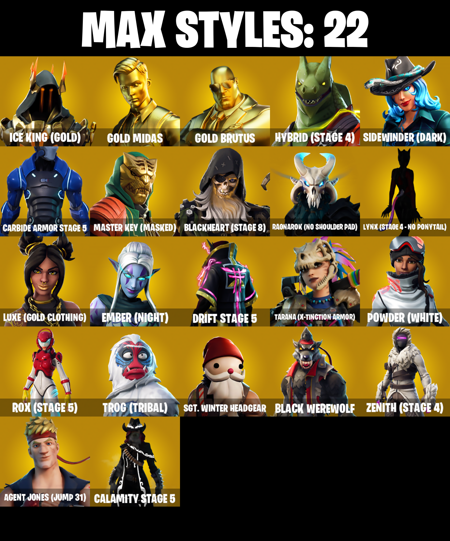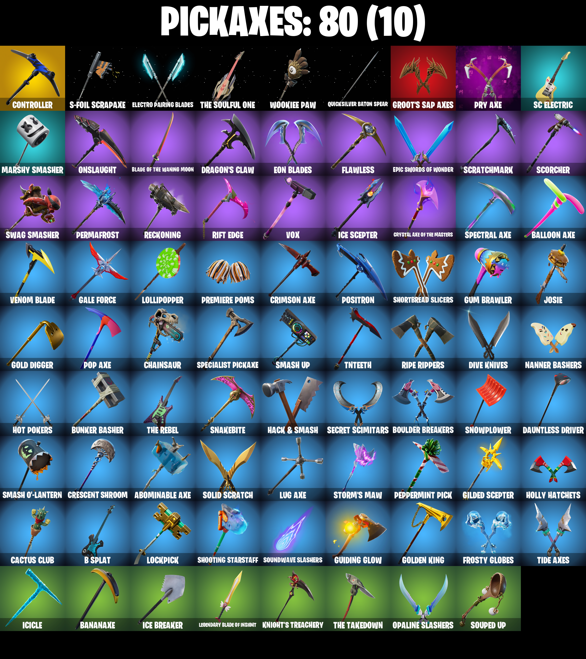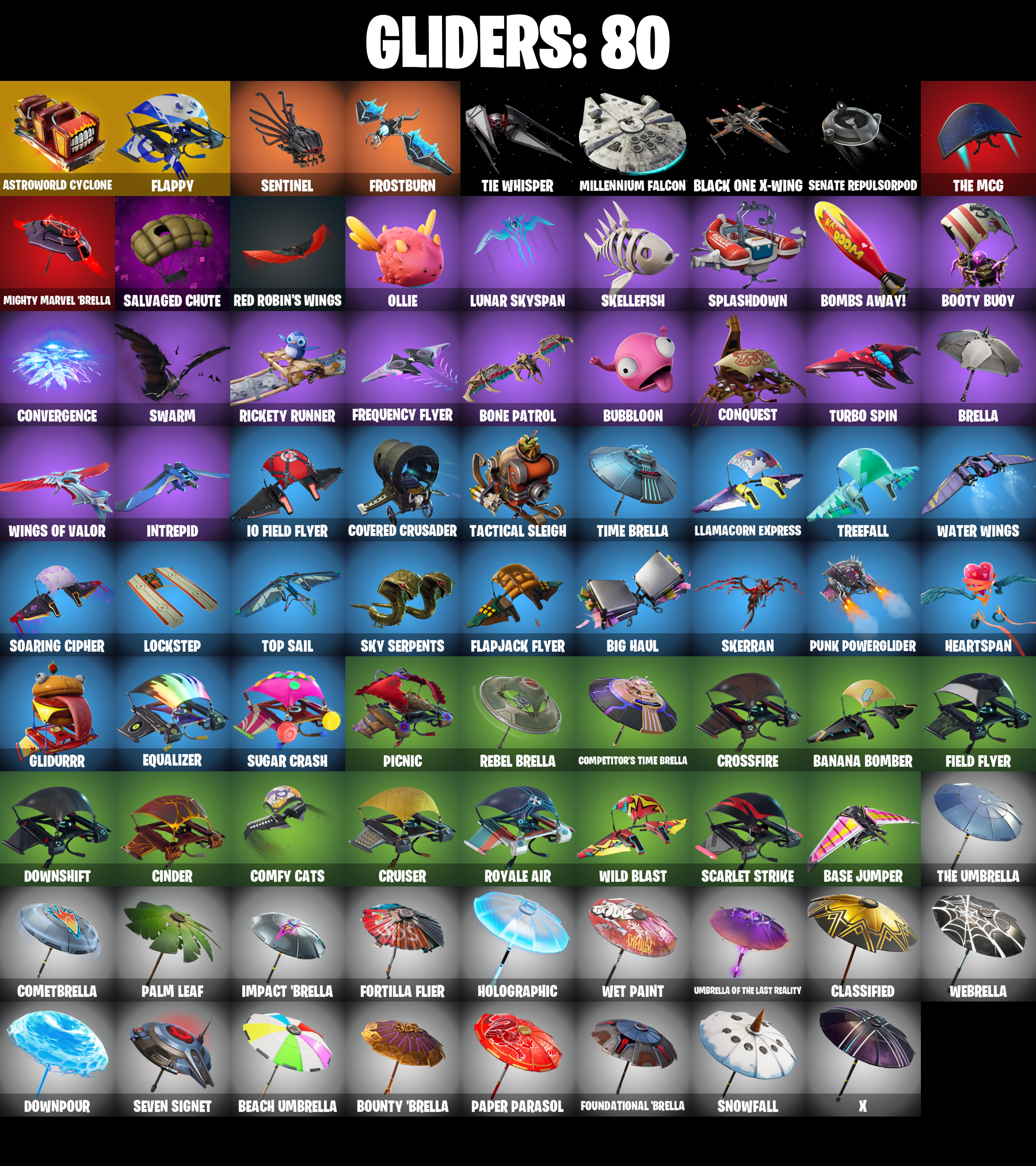 2020 Kickflip, Abominable Axe, Adventure Pack, Agent Jones, Agent Jones (Jump 31), Agent Peely, Air Shredder, Altitude, Ancestral Bloom, Apocalypse Shroud, Arroyo Pack, Astroworld Cyclone, Aura, B Splat, Back Board, Backstabber, Balloon Axe, Banana Bomber, Banana Briefcase, Bananaxe, Base Jumper, Basecamp Bag, Battle Call, Battlehawk, Beach Umbrella, Beachcomber, Beep Beep, Big Haul, Birdie, Black One X-Wing, Black Werewolf, Blackheart, Blackheart (Stage 8), Blade Of The Waning Moon, Bobo, Bogey Bag, Bombs Away!, Bone Patrol, Booty Buoy, Boulder Breakers, Bounty 'Brella, Breakdown, Brella, Bubloon, Bunker Basher, Bunker Jonesy, Cactus Club, Calamity, Calamity Stage 5, Calculated, Call Me, Carbide, Carbide Armor Stage 5, Cardistry, Cat Flip, Chainsaur, Choice Knit, Cinder, Classified, Clawz Retro, Clean Sweep, Cluck Strut, Cobalt, Cobra, Coin Flip, Cometbrella, Comfy Cats, Competitor's Time Brella, Conga, Conquest, Controller, Convergence, Covered Crusader, Crescent Shroom, Crimson Axe, Crossfire, Crowning Achievement, Cruiser, Crystal Axe Of The Masters, Cyclo Curl, DJ Yonder, Dauntless Driver, Deadpool, Deep Dive, Dino Deck, Dire, Dive Knives, Downpour, Downshift, Doze Dab, Dragon Stance, Dragon's Claw, Drift, Drift Stage 5, Dusk, Dusk Knight, Dusk Wings, Electro Pairing Blades, Ember, Ember (Night), Endless Scroll, Eon Blades, Epic Swords Of Wonder, Equalizer, Evasive Maneuvers, Fable, Fabled Cape, Fade, Feline Fun, Field Flyer, Fierce, Fishstick Janky, Flamenco, Flapjack Flyer, Flappy, Flawless, Flippin' Away, Fortilla Flier, Foundational 'Brella, Free Flow, Frequency Flyer, Frostburn, Frosty Globes, Frozen Shroud, Full Tilt, Gale Force, Gear Specialist Maya, Gentleman's Dab, Get Funky, Giddy-Up, Gilded Scepter, Glidurr, Go Bag, Gold Brutus, Gold Dagger Pack, Gold Digger, Gold Midas, Gold Token, Golden King, Golf Clap, Goodie Bag, Groot's Sap Axes, Groove Jam, Guiding Glow, Gum Brawler, Hack & Smash, Hadean Gate, Hand Signals, Heartspan, Hello Friend, Hench Hauler, High Caliber, Holly Hatchets, Holographic, Hoop Master, Hootenanny, Hot Marat, Hot Pokers, Hot Wings, Huntress, Hybrid, Hybrid (Stage 4), Hype, I Declare!, Ice Breaker, Ice Cube, Ice King (Gold), Ice Mantle, Ice Scepter, Icicle, Impact 'Brella, Intrepid, Io Field Flyer, Iris, It's Go Time!, It's... You?, Jones' Field Pack, Josie, Jules, Jump Jets, Kabag!, Kata-Pack, Keep It Mello, Knight's Treachery, Krisabelle, Kymera, Kymera's Plasma Pak, Laguna, Lane Splitter, Lara Croft, Legendary Blade Of Insight, Lil Quill, Lil' Black Heart, Lil' Kev, Llamacorn Express, Lockpick, Lockstep, Lollipopper, Love It!, Lt. Evergreen, Lug Axe, Lunar Hyperjet, Lunar Skyspan, Lunarios, Luxe, Luxe (Gold Clothing), Lynx, Lynx (Stage 4 - No Ponytail), Marshy Smasher, Master Key, Master Key (Masked), Master Portal, Mechafusion Interface, Meowscles, Mic Drop, Mighty Marvel 'Brella, Millennium Falcon, Mini Dogfight, Mutiny, Nana Nana, Nanner Bashers, Neon Wings, Night Cloak, Nightshade, Ninja Stance: Leo, Ocean, Ollie, Omega, Onesie, Onslaught, Opaline Slashers, Orange Justice, Overtaker, Palm Leaf, Pandemonium, Paper Parasol, Paws & Claws, Peace Out, Peely, Peely Whip, Peppermint Pick, Perfect Present, Permafrost, Picnic, Pineapple Strummer, Point It Out, Polar Peely, Pool Party, Pop Axe, Popcorn, Positron, Powder, Powder (White), Precision, Premiere Poms, Prized Llama, Pry Axe, Punk Powerglider, Quicksilver Baton Spear, R3X Tail, Ragnarok, Ranker's Tags, Raonarok (No Shoulder Pad), Raven's Legion, Raz, Re-Gifter, Rearguard, Rebel Brella, Reckoning, Red Card, Red Robin's Wings, Redline, Regal Wave, Reinforced Backplate, Respect, Respect The Peace, Rickety Runner, Rift Edge, Ripe Rippers, Rook, Roundabout, Rox, Rox (Stage 5), Royale Air, Running Man, Rust Bucket, S-Foil Scrapaxe, SC Electric, Sad Trombone, Salute, Salvaged Chute, Scales of Justice, Scarlet Strike, Scorcher, Scratchmark, Scuba Jonesy, Secret Scimitars, Senate Repulsorpod, Sentinel, Separatist Cape, Seven Signet, Sgt. Winter, Sgt. Winter Headgear, Shaolin Sit-Up, Sharpshooter, Shimmer, Shooting Starstaff, Shortbread Slicers, Side Hustle, Sidewinder, Sidewinder (Dark), Sign Spinner, Skellefish, Skerran, Sky Serpents, Skye, Sledgehammer, Slitherin', Smash O'-Lantern, Smash Up, Snakebite, Snoozefest, Snowfall, Snowplower, Snowshaker, So Square, Soaring Cipher, Society Emblem Ranker, Solid Scratch, Soundwave Slashers, Souped Up, Specialist Pickaxe, Spectra Protector, Spectral Axe, Splashdown, Springy, Squad Leader, Standard Issue, Star Surge, Storm's Maw, Sugar Crash, Summit Striker, Sun Strider, Survivor's Pack, Swag Bag, Swag Smasher, Swarm, Swipe It, TNTina, Tactical Sleigh, Take The Cake, Take The Elf, Tarana, Tarana (X-Tinction Armor), Teknique, The Ace, The Bestiary Chest, The Ice King, The Mcg, The Rebel, The Sith, The Soulful One, The Takedown, The Umbrella, The Ziggboard, Tide Axes, Tie Whisper, Time Brella, Tnteeth, Top Notch, Top Sail, Tra La La, Trail Tote, Treefall, Trog, Trog (Tribal), Turbo Spin, Twin Blasters, Umbrella of the Last Reality, Uplink, Valor, Vega, Venom Blade, Verve, Vox, Wakandan Salute, Water Wings, Waveform, Webrella, Wet Paint, Wild Blast, Wingman, Wings of Valor, Wolfpack, Wookiee Paw, Wooly Warrior, X, Yay!, Yellowjacket, You're Awesome, Zenith, Zenith (Stage 4), Zoey