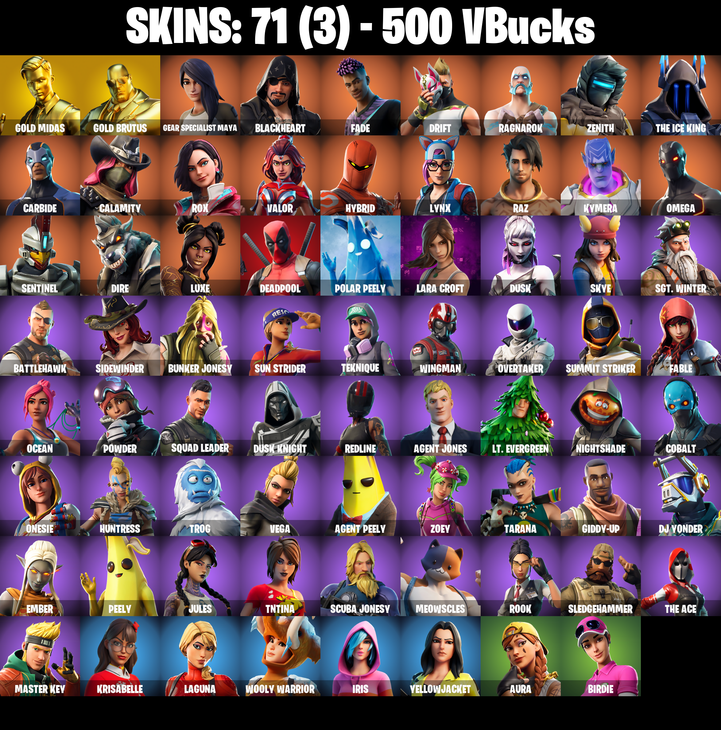 PC/PSN/XBOX |71 skins | Lara Croft | Deadpool | Gold Midas | Gold Brutus | Omega | Orange Justice | Drift | Carbide | Ragnarok | Dire | #B1198