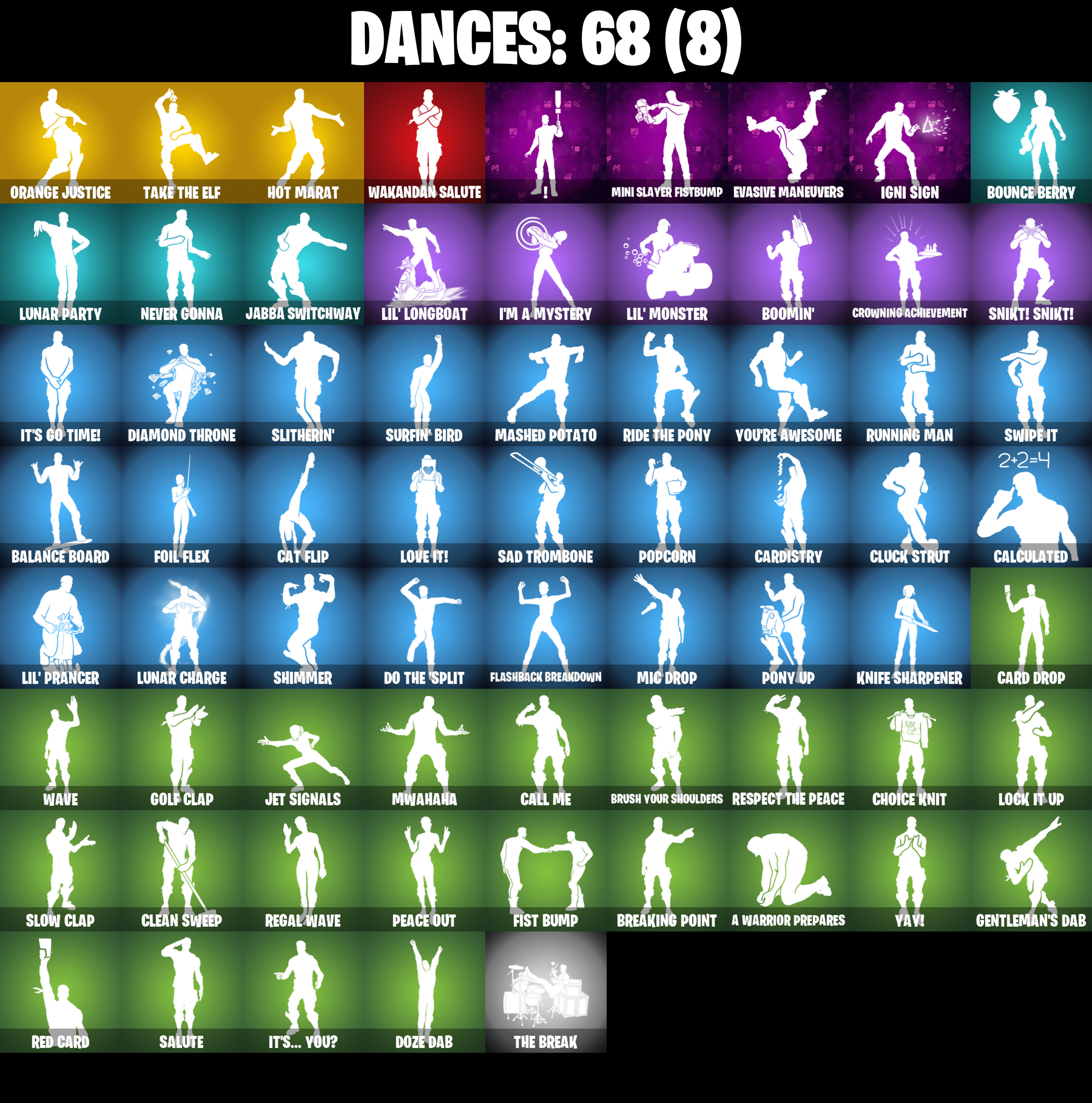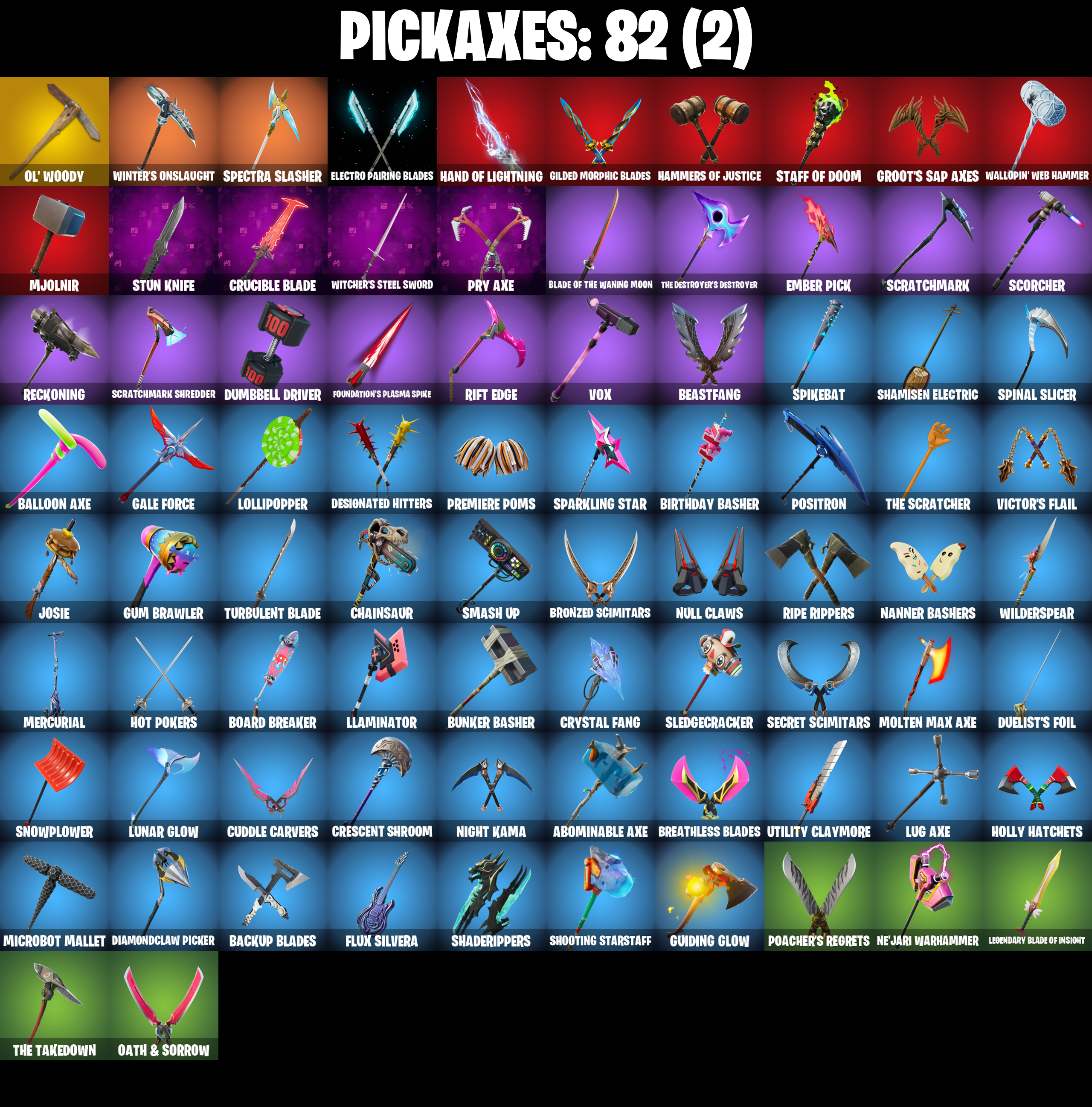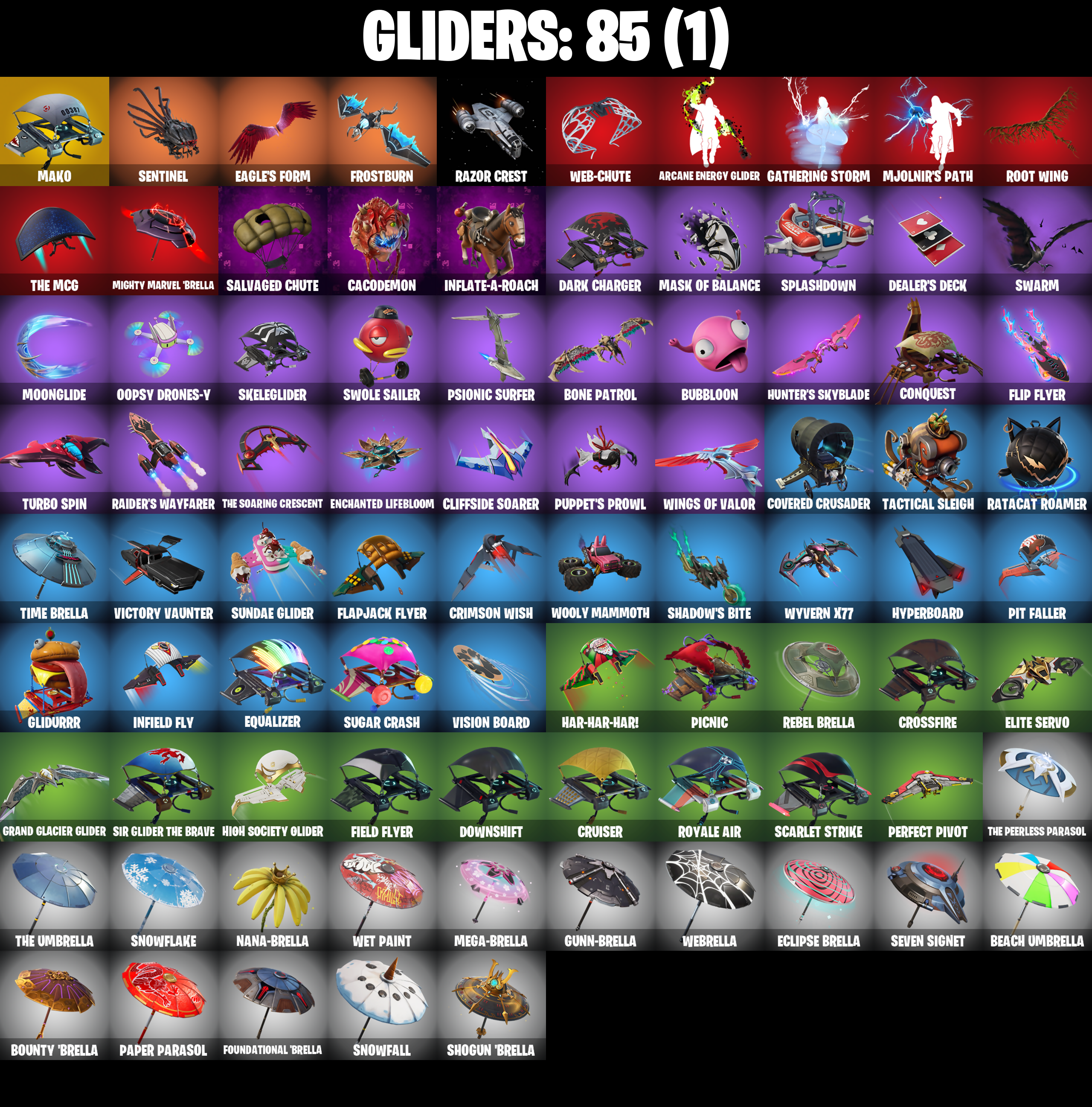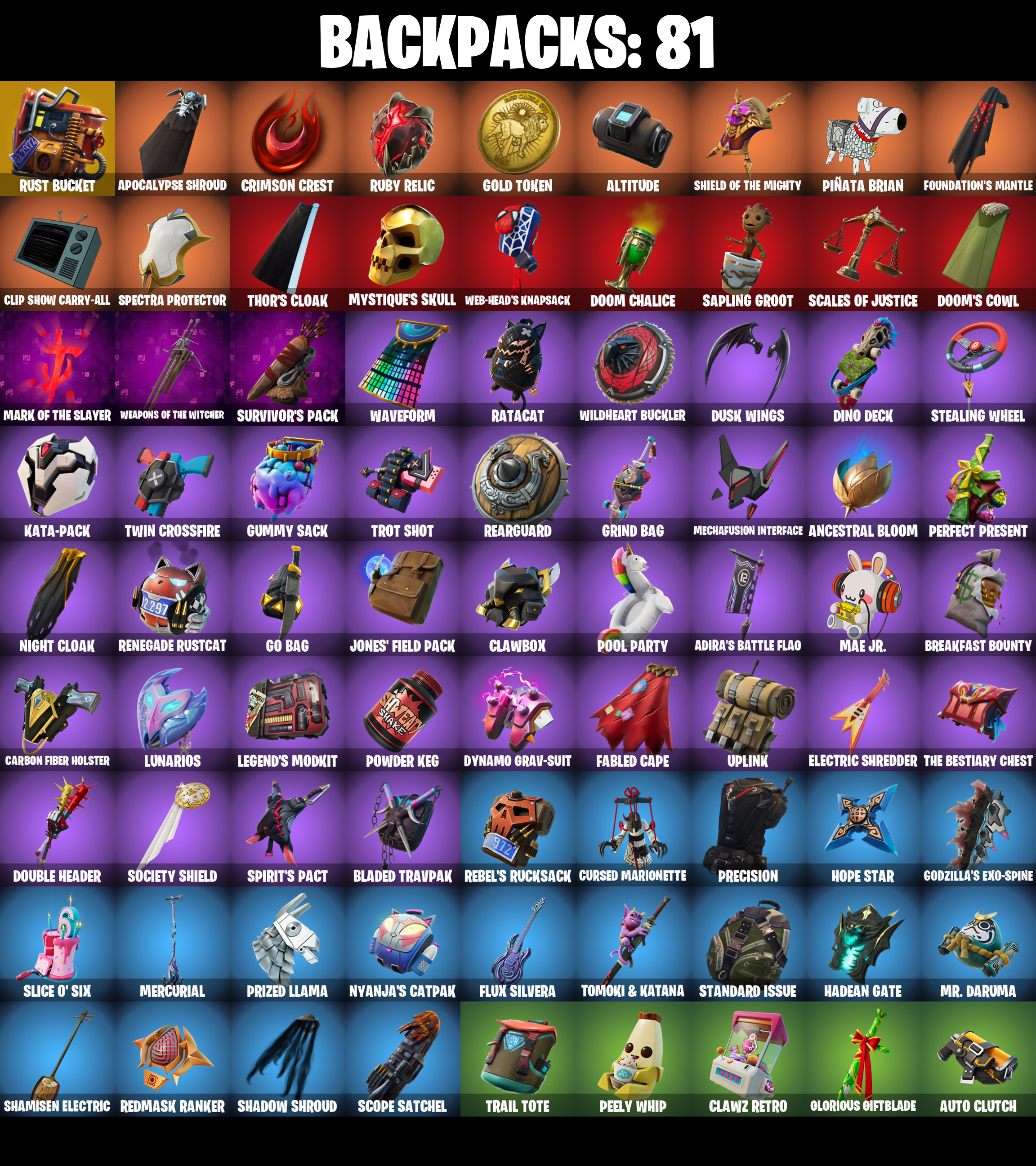 A Warrior Prepares, Abominable Axe, Adira's Battle Flag, Agent Jones, Altitude, Ancestral Bloom, Apocalypse Shroud, Arcane Energy Glider, Astro Armor, Auto Clutch, Backup Blades, Balance Board, Balloon Axe, Battlehawk, Beach Umbrella, Beastfang, Birthday Basher, Blade Of The Waning Moon, Bladed Travpak, Board Breaker, Bone Patrol, Boomin', Bounce Berry, Bounty 'Brella, Breakfast Bounty, Breaking Point, Breathless Blades, Bronzed Scimitars, Brush Your Shoulders, Bubbloon, Bunker Basher, Bunker Jonesy, Burning Ambition Valeria, Cacodemon, Calamity, Calamity Stage 5, Calculated, Call Me, Carbide, Carbon Fiber Holster, Card Drop, Cardistry, Cat Flip, Cerberus, Chainsaur, Choice Knit, Clawbox, Clawz Retro, Clean Sweep, Cliffside Soarer, Clip Show Carry-All, Cluck Strut, Conquest, Covered Crusader, Crescent Shroom, Crimson Crest, Crimson Wish, Crossfire, Crowning Achievement, Crucible Blade, Cruiser, Crystal Fang, Cuddle Carvers, Cursed Marionette, DJ Yonder, Dark Charger, Dealer's Deck, Designated Hitters, Diamond Throne, Diamondclaw Picker, Dino Deck, Do The 'Split, Doctor Doom, Doom Chalice, Doom Slayer, Doom's Cowl, Double Header, Downshift, Doze Dab, Drift, Drift Stage 5, Duelist's Foil, Dumbbell Driver, Dusk, Dusk Wings, Dusty, Dynamo Grav-Suit, Eagle's Form, Eclipse Brella, Electric Shredder, Electro Pairing Blades, Elite Servo, Ember Pick, Enchanted Lifebloom, Equalizer, Evasive Maneuvers, Fable, Fabled Cape, Fancy Peter Griffin, Field Flyer, Fist Bump, Flapjack Flyer, Flashback Breakdown, Flip Flyer, Flux Silvera, Foil Flex, Foundation's Mantle, Foundation's Plasma Spike, Foundational 'Brella, Frostburn, Gale Force, Gathering Storm, Gentleman's Dab, Geralt of Rivia, Giddy-Up, Gilded Morphic Blades, Glidurr, Glorious Giftblade, Go Bag, Godzilla's Exo-Spine, Gold Token, Golf Clap, Grand Glacier Glider, Grind Bag, Groot, Groot's Sap Axes, Guiding Glow, Gum Brawler, Gumbo, Gumbo (Sour), Gummy Sack, Gunn-Brella, Hadean Gate, Hammers Of Justice, Hand Of Lightning, Har-Har-Har!, Harbinger Armor Omegarok, Harlowe, Harlowe (Helmet), Haven, High Society Glider, Holiday Boxy, Holly Hatchets, Hope, Hope Star, Hot Marat, Hot Pokers, Hunter's Skyblade, Huntress, Hyperboard, I'm A Mystery, Igni Sign, Infield Fly, Inflate-A-Roach, It's Go Time!, It's... You?, Jabba Switchway, Jennifer Walters, Jet Signals, Jones' Field Pack, Josie, Kata-Pack, Knife Sharpener, Kondor, Krisabelle, Lara Croft, Legend's Modkit, Legendary Blade Of Insight, Lexa, Lexa (Warstrike), Lil Split, Lil' Longboat, Lil' Monster, Lil' Prancer, Llaminator, Lock It Up, Lollipopper, Longshot, Love It!, Lt. John Llama, Lug Axe, Lunar Charge, Lunar Glow, Lunar Party, Lunarios, Lynx, Lynx (Stage 4 - No Ponytail), M-Jolnir, Mae Jr., Mako, Mancake, Mandalorian, Mark of the Slayer, Mashed Potato, Mask of Balance, Massai, Mave, Mave (Reactive Hair Off), Mechafusion Interface, Mega-Brella, Menace, Menace (Challenge Menace - Flame), Mercurial, Mic Drop, Microbot Mallet, Mighty Marvel 'Brella, Mini Slayer Fistbump, Mjolnir's Path, Molten Max Axe, Montague, Moonglide, Mr. Daruma, Mwahaha, Mystique, Mystique's Skull, Nana-Brella, Nanner Bashers, Ne'Jari Warhammer, Never Gonna, Night Cloak, Night Kama, Nightshade, Nisha, Null Claws, Nyanja's Catpak, Oath & Sorrow, Ol' Woody, Omegarok, Oopsy Drones-Y, Orange Justice, Oscar, Paper Parasol, Peace Out, Peely Whip, Perfect Pivot, Perfect Present, Peter Griffin, Picnic, Pit Faller, Piñata Brian, Poacher's Regrets, Polar Peely, Pony Up, Pool Party, Popcorn, Positron, Powder, Powder Keg, Precision, Predator, Premiere Poms, Prized Llama, Pry Axe, Psionic Surfer, Puppet's Prowl, Raider's Wayfarer, Ratacat, Ratacat Roamer, Razor Crest, Rearguard, Rebel Brella, Rebel's Rucksack, Reckoning, Red Card, Redline, Redmask Ranker, Reese, Regal Wave, Renegade Lynx, Renegade Rustcat, Respect The Peace, Ride The Pony, Rift Edge, Ripe Rippers, Ronin, Ronin (Cape), Root Wing, Rough Cut Montague, Rox, Rox (Stage 5), Royale Air, Ruby Relic, Running Man, Runway Racer, Rust Bucket, Sad Trombone, Salute, Salvaged Chute, Sapling Groot, Scales of Justice, Scarlet Strike, Scope Satchel, Scorcher, Scratchmark, Scratchmark Shredder, Secret Scimitars, Selene, Sentinel, Seven Signet, Sgt. Winter, Sgt. Winter Headgear, Shaderippers, Shadow Shroud, Shadow's Bite, Shamisen Electric, Shanta, Shanta (Headpiece), Shield of the Mighty, Shimmer, Shock Brawler Oscar, Shogun 'Brella, Shooting Starstaff, Sir Glider The Brave, Skeleglider, Sledgecracker, Sledgehammer, Slice O' Six, Slitherin', Slow Clap, Smash Up, Snikt! Snikt!, Snowfall, Snowflake, Snowplower, Society Shield, Sparkling Star, Spectra Knight, Spectra Protector, Spectra Slasher, Spider-Man, Spikebat, Spinal Slicer, Spirit's Pact, Splashdown, Staff Of Doom, Standard Issue, Stealing Wheel, Storm, Stun Knife, Sugar Crash, Sun Strider, Sundae Glider, Surfin' Bird, Survivor's Pack, Swarm, Swipe It, Swole Sailer, Tactical Sleigh, Take The Elf, Tarana, Tarana (X-Tinction Armor), Teknique, The Bestiary Chest, The Break, The Destroyer's Destroyer, The Foundation, The McG, The Peerless Parasol, The Scratcher, The Soaring Crescent, The Takedown, The Umbrella, Thor, Thor's Cloak, Time Breaker Lil Split, Time Breaker Renegade Lynx, Time Brella, Tomoki & Katana, Trail Tote, Trot Shot, Turbo Spin, Turbulent Blade, Twin Crossfire, Uplink, Utility Claymore, Valeria, Vega, Vengeance Jones, Victor's Flail, Victory Vaunter, Viper School, Vision Board, Vox, Wakandan Salute, Wallopin' Web Hammer, Wave, Waveform, Weapons of The Witcher, Web-Chute, Web-Head's Knapsack, Webrella, Wet Paint, Wilderspear, Wildheart Buckler, Wings of Valor, Winter's Onslaught, Witcher's Steel Sword, Wolverine, Wooly Mammoth, Wyvern X77, Yay!, You're Awesome, Zenith, Zenith (Stage 4), Zoey