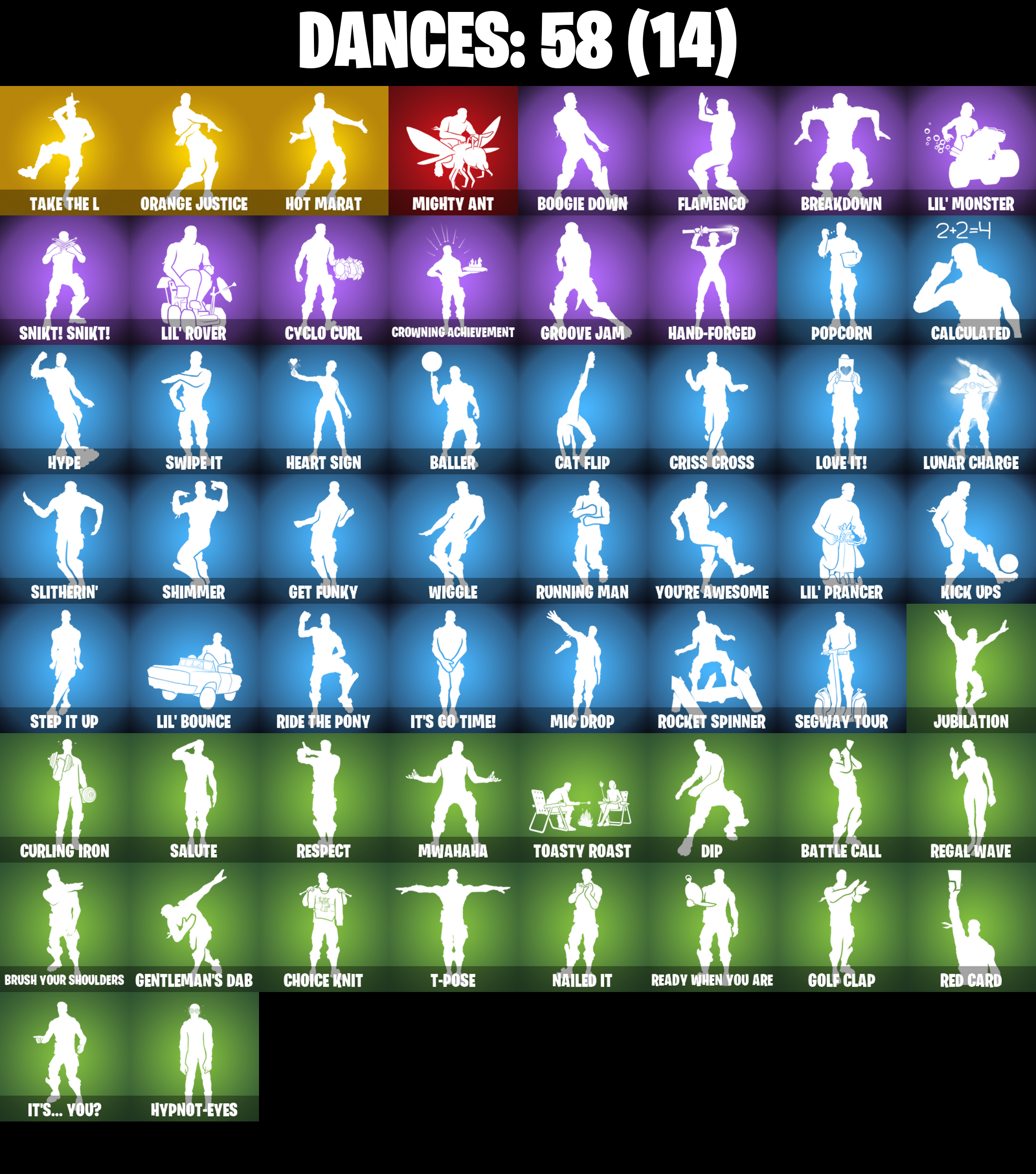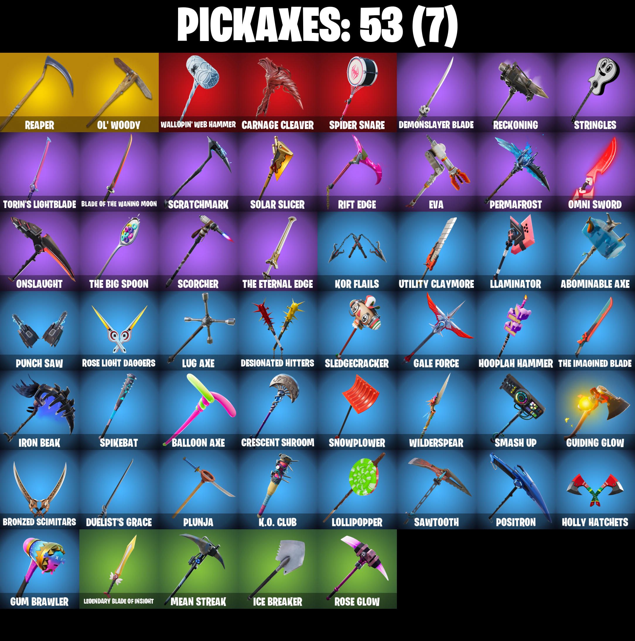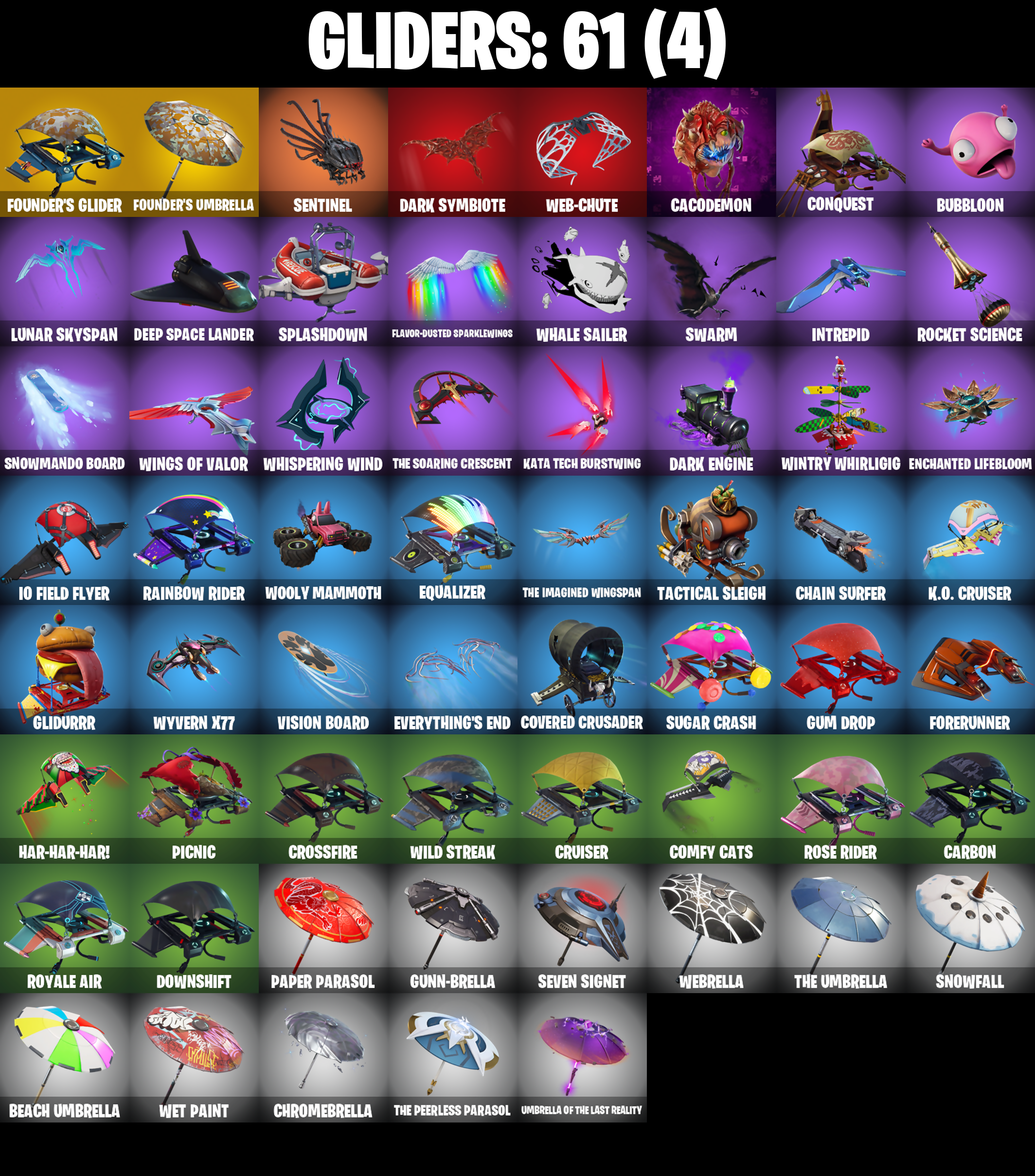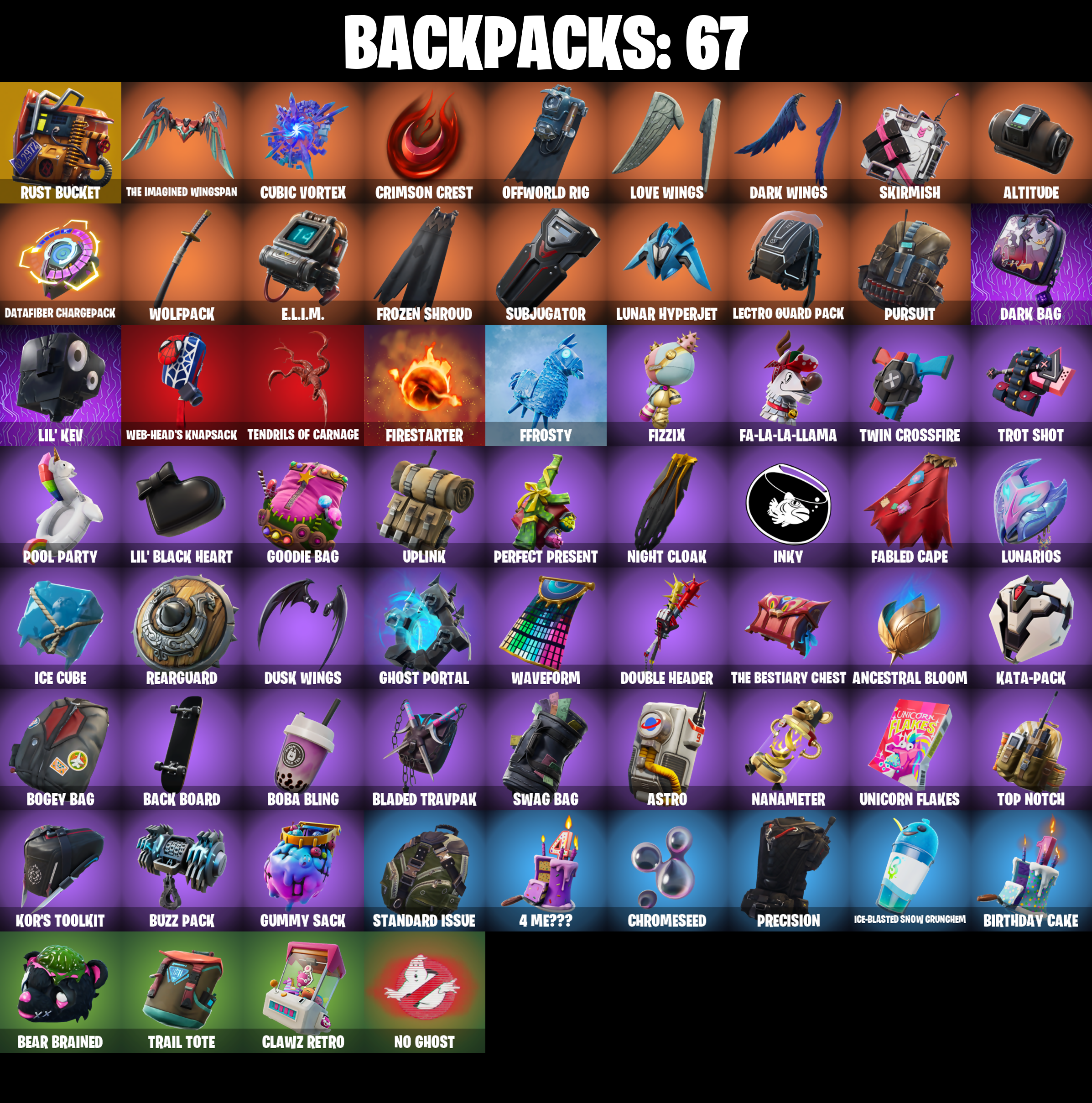 4 Me???, A.I.M., Abominable Axe, Altitude, Ancestral Bloom, Arctic Adeline, Astro, Back Board, Baller, Balloon Axe, Battle Call, Battlehawk, Beach Umbrella, Bear Brained, Birthday Cake, Black Werewolf, Blade Of The Waning Moon, Bladed Travpak, Blaze, Blizzabelle, Boba Bling, Bogey Bag, Boogie Down, Breakdown, Bronzed Scimitars, Brush Your Shoulders, Bubbloon, Buzz Pack, Cacodemon, Calamity, Calamity Stage 5, Calculated, Carbide, Carbide Armor Stage 5, Carbon, Carnage, Carnage (Maximum), Carnage Cleaver, Cat Flip, Chain Surfer, Charlotte, Choice Knit, Chrome Punk, Chromebrella, Chromeseed, Clawz Retro, Comfy Cats, Conquest, Covered Crusader, Crescent Shroom, Crimson Crest, Criss Cross, Crossfire, Crowning Achievement, Cruiser, Cubic Vortex, Curling Iron, Cyclo Curl, DJ Yonder, Dark Bag, Dark Bomber, Dark Engine, Dark Symbiote, Dark Wings, Datafiber Chargepack, Deep Space Lander, Demonslayer Blade, Designated Hitters, Dip, Dire, Double Header, Downshift, Drift, Drift Stage 5, Duelist's Grace, Dusk, Dusk Wings, E.L.I.M., Enchanted Lifebloom, Enforcer, Equalizer, Eva, Everything's End, Fa-La-La-Llama, Fabio Sparklemane, Fable, Fabled Cape, Firestarter, Fizzix, Flamenco, Flavor-Dusted Sparklewings, Forerunner, Founder's Glider, Founder's Umbrella, Frosty, Frozen Shroud, Gale Force, Gentleman's Dab, Get Funky, Ghost Portal, Ghoul Trooper, Giddy-Up, Glidurr, Golf Clap, Goodie Bag, Groove Jam, Guiding Glow, Gum Brawler, Gum Drop, Gumbo, Gumbo (Sour), Gummy Sack, Gunn-Brella, Gunnar, Hand-Forged, Har-Har-Har!, Harlowe, Harlowe (Helmet), Haven, Heart Sign, Holly Hatchets, Hooplah Hammer, Hot Marat, Huntress, Hype, Hypnot-Eyes, IO Field Flyer, Ice Breaker, Ice Cube, Ice-Blasted Snow Crunchem, Inky, Intrepid, Iron Beak, It's Go Time!, It's... You?, J.B. Chimpanski, J.B. Chimpanski (Helmet), Joltara, Jubilation, K.O. Club, K.O. Cruiser, Kata Tech Burstwing, Kata-Pack, Kiara K.O., Kiara K.O. (Captain's Bomber), Kick Ups, Kor, Kor (Trenchcoat), Kor Flails, Kor's Toolkit, Krisabelle, Lectro Guard Pack, Legendary Blade Of Insight, Lil' Black Heart, Lil' Bounce, Lil' Kev, Lil' Monster, Lil' Prancer, Lil' Rover, Llaminator, Lollipopper, Love It!, Love Ranger, Love Wings, Lt. John Llama, Lt. John Llama (Gilded Reality), Lug Axe, Lunar Charge, Lunar Hyperjet, Lunar Skyspan, Lunarios, Lynx, Lynx (Stage 4 - No Ponytail), Mean Streak, Mic Drop, Midfield Maestro, Mighty Ant, Mission Specialist, Moonwalker, Mwahaha, Nailed It, Nanameter, Night Cloak, Nightshade, No Ghost, Nog Ops, Offworld Rig, Ol' Woody, Omega, Omni Sword, Onslaught, Orange Justice, Paper Parasol, Perfect Present, Permafrost, Picnic, Plunja, Polar Peely, Pool Party, Popcorn, Positron, Powder, Precision, Punch Saw, Pursuit, Ragnarok, Rainbow Rider, Raonarok (No Shoulder Pad), Ravage, Ready When You Are, Reaper, Rearguard, Reckoning, Red Card, Redline, Regal Wave, Respect, Ride The Pony, Rift Edge, Rocket Science, Rocket Spinner, Ronin, Ronin (Cape), Rook, Rose Glow, Rose Light Daggers, Rose Rider, Rose Team Leader, Royale Air, Running Man, Rust Bucket, Rust Lord, Salute, Sawtooth, Scarlet Commander, Scorcher, Scratchmark, Segway Tour, Sentinel, Seven Signet, Sgt. Winter, Sgt. Winter Headgear, Shanta, Shanta (Headpiece), Shimmer, Skirmish, Skull Trooper, Sled Ready Guff, Sledgecracker, Sledgehammer, Slitherin', Smash Up, Snikt! Snikt!, Snowfall, Snowmando Board, Snowplower, Solar Slicer, Spider Snare, Spider-Man, Spider-Man (Gilded Reality), Spikebat, Splashdown, Squad Leader, Standard Issue, Step It Up, Stringles, Subjugator, Sugar Crash, Summit Striker, Sun Strider, Swag Bag, Swarm, Swipe It, T-Pose, Tactical Sleigh, Take The L, Teknique, Tendrils of Carnage, The Ace, The Bestiary Chest, The Big Spoon, The Eternal Edge, The Imagined, The Imagined (Combat Elite), The Imagined Blade, The Imagined Wingspan, The Peerless Parasol, The Soaring Crescent, The Umbrella, The Visitor, Toasty Roast, Toona Fish, Top Notch, Torin, Torin (Sideways Warrior), Torin's Lightblade, Trail Tote, Trog, Trot Shot, Tsuki 2.0, Twin Crossfire, Umbrella of the Last Reality, Unicorn Flakes, Uplink, Utility Claymore, Valor, Vision Board, Wallopin' Web Hammer, Warpaint, Waveform, Web-Chute, Web-Head's Knapsack, Webrella, Wet Paint, Whale Sailer, Whispering Wind, Wiggle, Wild Streak, Wilderspear, Wingman, Wings of Valor, Wintry Whirligig, Wolfpack, Wooly Mammoth, Wyvern X77, You're Awesome, Zenith, Zenith (Stage 4), Zoey