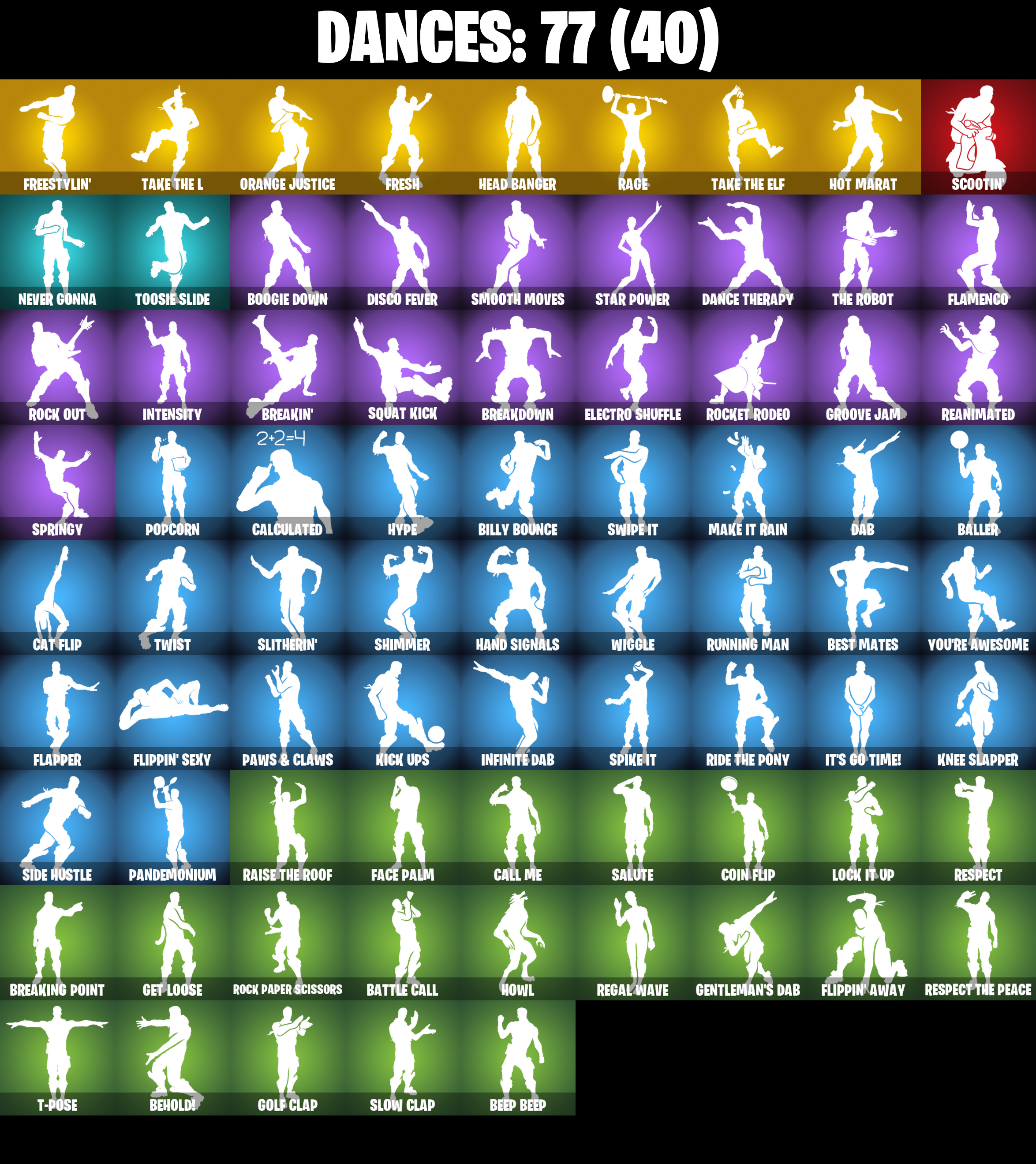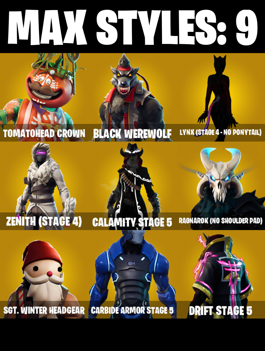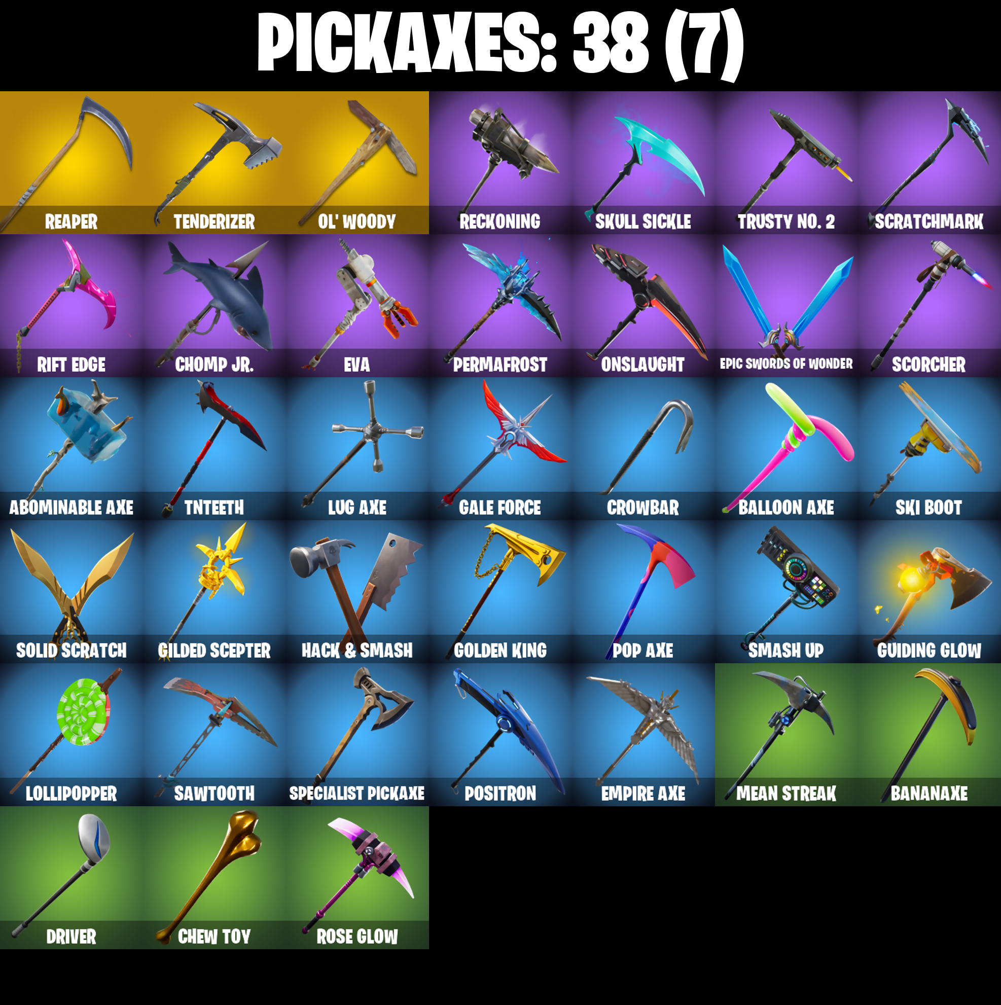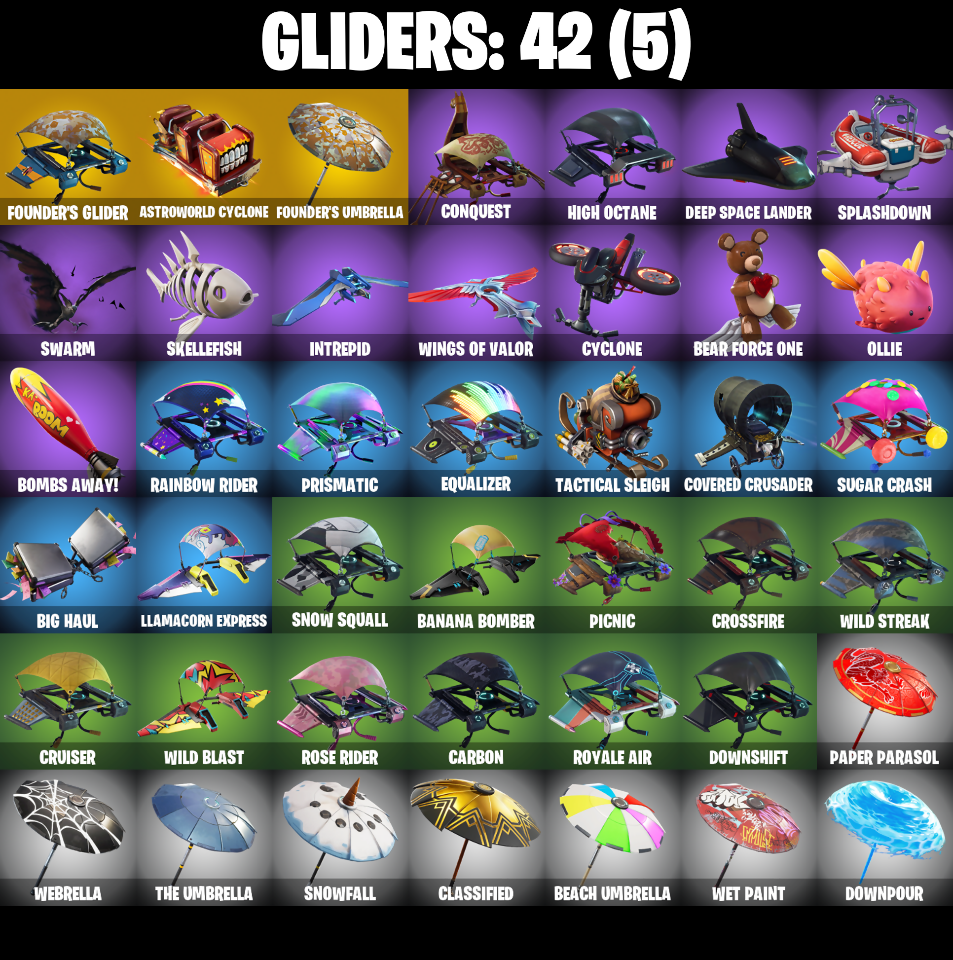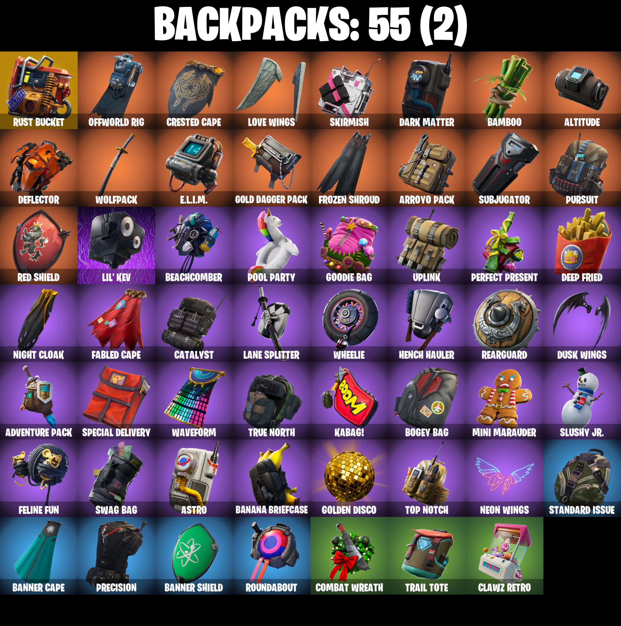 A.I.M., Abominable Axe, Absolute Zero, Adventure Pack, Agent Peely, Altitude, Arroyo Pack, Astro, Astroworld Cyclone, Baller, Balloon Axe, Bamboo, Banana Bomber, Banana Briefcase, Bananaxe, Banner Cape, Banner Shield, Banner Trooper, Battle Call, Battle Hound, Battlehawk, Beach Umbrella, Beachcomber, Bear Force One, Beef Boss, Beep Beep, Behold!, Best Mates, Big Haul, Billy Bounce, Black Werewolf, Bogey Bag, Bombs Away!, Boogie Down, Breakdown, Breakin', Breaking Point, Brutus, Burnout, Calamity, Calamity Stage 5, Calculated, Call Me, Carbide, Carbide Armor Stage 5, Carbon, Cat Flip, Catalyst, Chew Toy, Chomp Jr., Classified, Clawz Retro, Coin Flip, Combat Wreath, Conquest, Covered Crusader, Crested Cape, Crossfire, Crowbar, Cruiser, Cyclone, DJ Yonder, Dab, Dance Therapy, Dark Matter, Dark Voyager, Deadpool, Deep Fried, Deep Space Lander, Deflector, Dire, Disco Fever, Downpour, Downshift, Drift, Drift Stage 5, Driver, Dusk, Dusk Wings, E.L.I.M., Electro Shuffle, Elite Agent, Empire Axe, Enforcer, Epic Swords of Wonder, Equalizer, Eva, Fable, Fabled Cape, Face Palm, Feline Fun, Flamenco, Flapper, Flippin' Away, Flippin' Sexy, Founder's Glider, Founder's Umbrella, Freestylin', Fresh, Frozen Shroud, Funk Ops, Gale Force, Gear Specialist Maya, Gentleman's Dab, Get Loose, Giddy-Up, Gilded Scepter, Gold Dagger Pack, Golden Disco, Golden King, Golf Clap, Goodie Bag, Groove Jam, Guiding Glow, Hack & Smash, Hand Signals, Head Banger, Hench Hauler, High Octane, Hot Marat, Howl, Huntress, Hype, Infinite Dab, Intensity, Intrepid, Iris, It's Go Time!, Jumpshot, Kabag!, Kick Ups, Knee Slapper, Lane Splitter, Lil' Kev, Liteshow, Llamacorn Express, Lock It Up, Lollipopper, Love Ranger, Love Wings, Lug Axe, Lynx, Lynx (Stage 4 - No Ponytail), Make It Rain, Mean Streak, Meowscles, Merry Marauder, Midas, Mini Marauder, Mission Specialist, Moonwalker, Neon Wings, Never Gonna, Night Cloak, Nightshade, Nog Ops, Offworld Rig, Ol' Woody, Ollie, Omega, Onslaught, Orange Justice, Overtaker, P.A.N.D.A Team Leader, Pandemonium, Paper Parasol, Paws & Claws, Perfect Present, Permafrost, Picnic, Pool Party, Pop Axe, Popcorn, Positron, Precision, Prismatic, Pursuit, Quackling, Rage, Ragnarok, Ragnarok (No Shoulder Pad), Rainbow Rider, Raise The Roof, Reanimated, Reaper, Rearguard, Reckoning, Red Knight, Red Shield, Redline, Regal Wave, Respect, Respect The Peace, Ride The Pony, Rift Edge, Rock Out, Rock Paper Scissors, Rocket Rodeo, Rogue Agent, Rook, Rose Glow, Rose Rider, Rose Team Leader, Roundabout, Royale Air, Running Man, Rust Bucket, Rust Lord, Salute, Sawtooth, Scootin', Scorcher, Scratchmark, Sgt. Winter, Sgt. Winter Headgear, Shimmer, Side Hustle, Skellefish, Ski Boot, Skirmish, Skull Ranger, Skull Sickle, Skye, Sledgehammer, Slingshot, Slitherin', Slow Clap, Slushy Jr., Slushy Soldier, Smash Up, Smooth Moves, Snow Squall, Snowfall, Solid Scratch, Special Delivery, Specialist Pickaxe, Spike It, Splashdown, Springy, Squad Leader, Squat Kick, Standard Issue, Star Power, Strong Guard, Subjugator, Sugar Crash, Summit Striker, Sun Strider, Super Striker, Swag Bag, Swarm, Swipe It, T-Pose, Tactical Sleigh, Take The Elf, Take The L, Teknique, Tenderizer, The Ace, The Reaper, The Robot, The Umbrella, The Visitor, Tnteeth, Tntina, Tomatohead, Tomatohead Crown, Toosie Slide, Top Notch, Trail Tote, Trailblazer, True North, Trusty No. 2, Twist, Uplink, Valor, Vertex, Warpaint, Waveform, Webrella, Wet Paint, Wheelie, Whiplash, Wiggle, Wild Blast, Wild Streak, Wingman, Wings Of Valor, Wolfpack, You're Awesome, Zenith, Zenith (Stage 4), Zoey