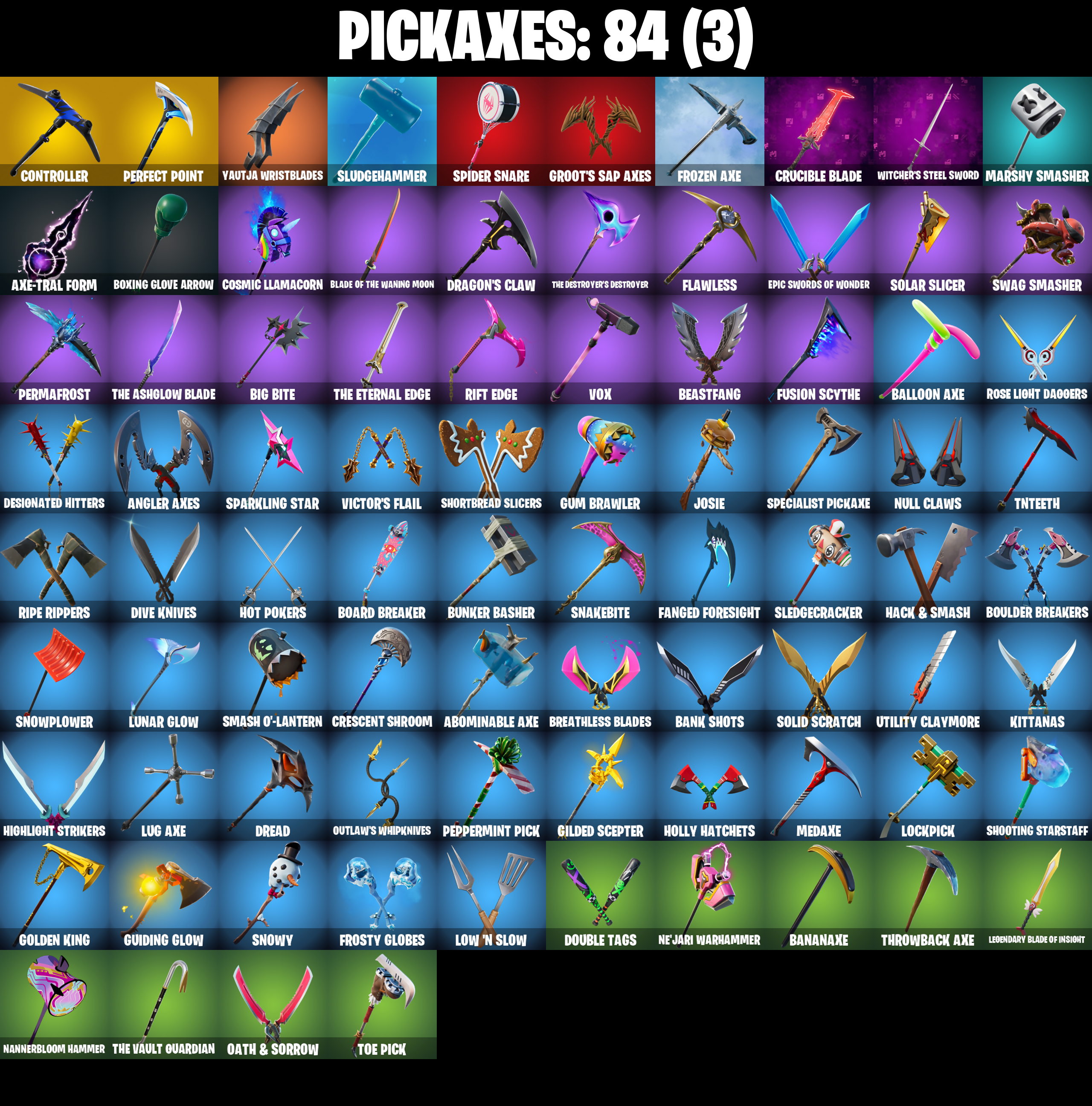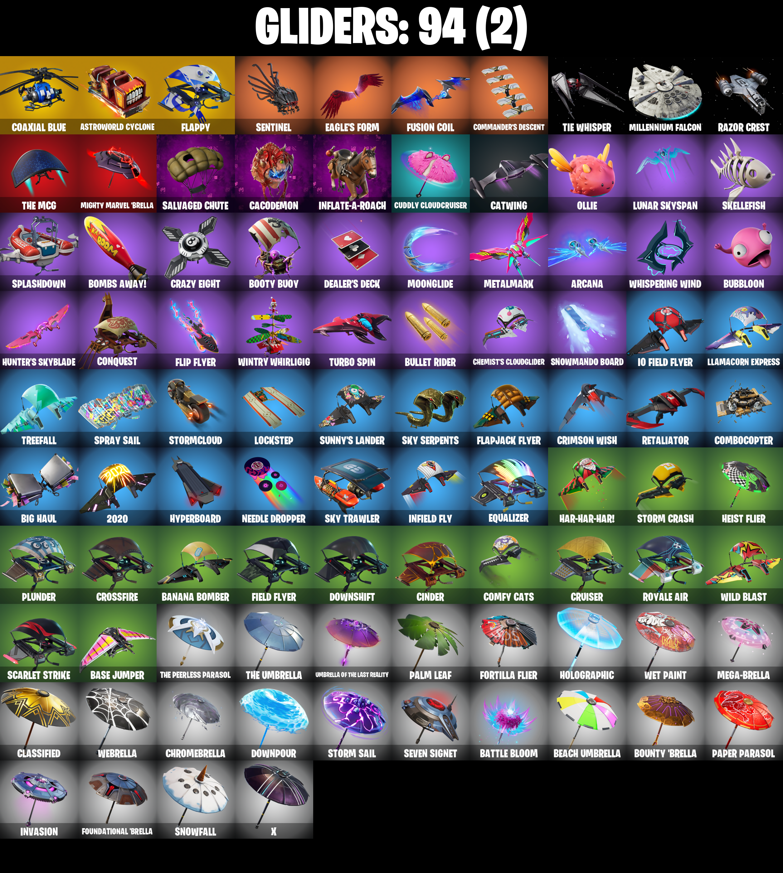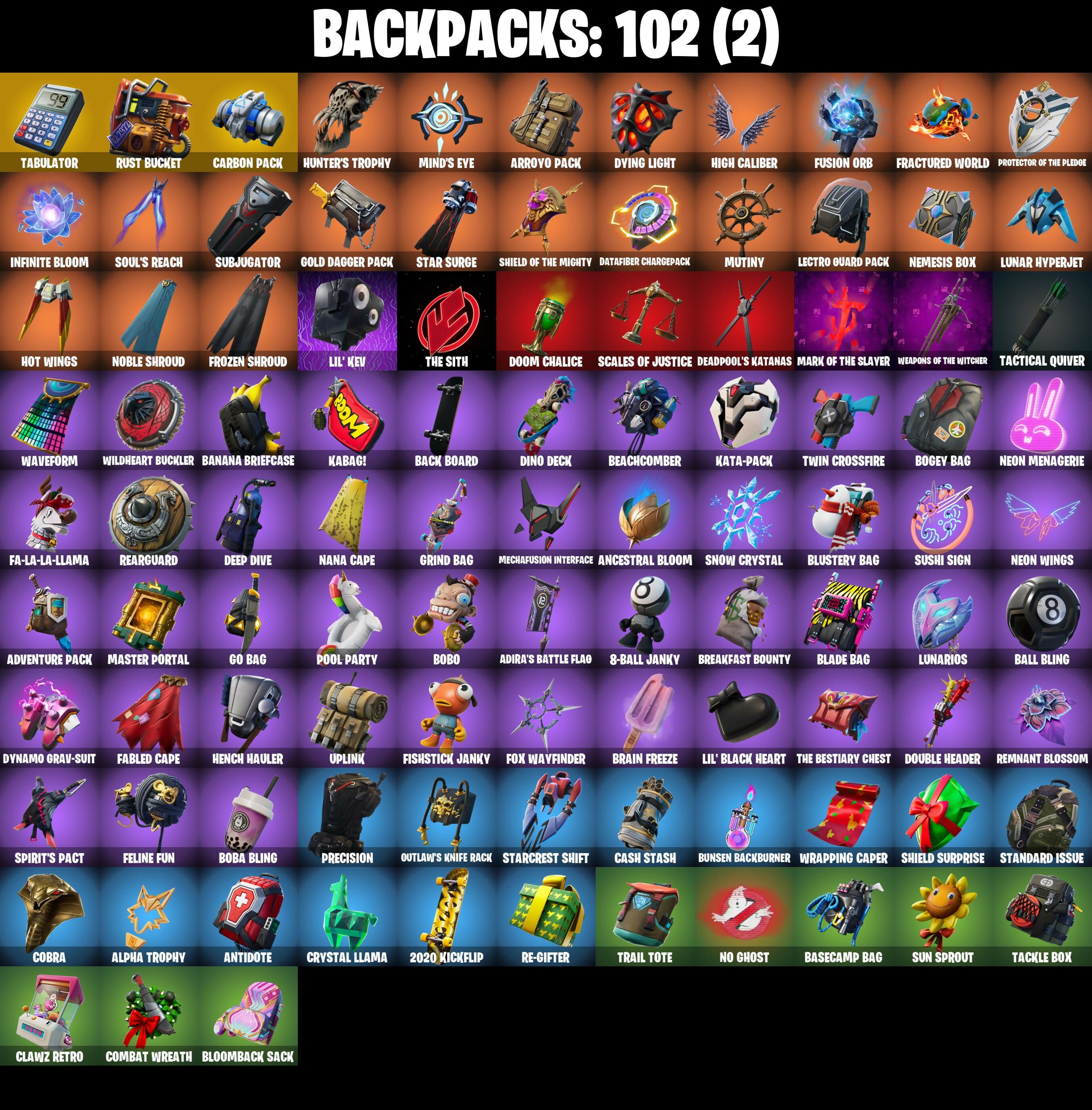 2020, 2020 Kickflip, 8-Ball Janky, 8-Ball Vs Scratch, A Warrior Prepares, Abominable Axe, Adira's Battle Flag, Adventure Pack, Agent Peely, Alpha Trophy, Ancestral Bloom, Angler Axes, Antidote, Arcana, Arctic Adeline, Arroyo Pack, Ascension Nezumi, Astro Armor, Astroworld Cyclone, Aura, Axe-tral Form, Back Board, Balance Board, Ball Bling, Balloon Axe, Banana Bomber, Banana Briefcase, Bananaxe, Bank Shots, Base Jumper, Basecamp Bag, Battle Bloom, Beach Umbrella, Beachcomber, Beastfang, Beep Beep, Big Bite, Big Haul, Blackheart, Blackheart (Stage 8), Blade Bag, Blade Of The Waning Moon, Bloomback Sack, Blustery Bag, Board Breaker, Boba Bling, Boba Snack, Bobo, Bogey Bag, Boing!, Bombs Away!, Boobytrapped, Boomin', Booty Buoy, Boulder Breakers, Bounty 'Brella, Boxing Glove Arrow, Brain Freeze, Breakdown, Breakfast Bounty, Breathless Blades, Breezy, Bubbloon, Buckets, Bullet Rider, Bullpen Brawler Dusty, Bunker Basher, Bunker Jonesy, Bunsen Backburner, Cacodemon, Calculated, Call Me, Called Shot, Cameo Vs Chic, Cap Kick, Carbon Commando, Carbon Pack, Cash Stash, Catwing, Chemist's Cloudglider, Choice Knit, Chromebrella, Cinder, Classified, Clawz Retro, Clean Sweep, Club President Helsie, Cluck Strut, Coaxial Blue, Cobra, Coin Flip, Combat Wreath, Combocopter, Comfy Cats, Commander's Descent, Commando, Conga, Conquest, Controller, Cosmic Llamacorn, Crazy Eight, Crescent Shroom, Crimson Wish, Crossfire, Crowning Achievement, Crucible Blade, Cruiser, Crystal Llama, Cuddly Cloudcruiser, Datafiber Chargepack, Deadpool, Deadpool Unmasked, Deadpool's Katanas, Dealer's Deck, Deep Dive, Demi, Denied, Designated Hitters, Dino Deck, Dive Knives, Doom Chalice, Doom Slayer, Double Header, Double Tags, Downpour, Downshift, Dragon Stance, Dragon's Claw, Dread, Drift, Drift Stage 5, Droop, Dusty, Dying Light, Dynamo Grav-Suit, Eagle's Form, Ember, Ember (Night), Enforcer, Epic Swords Of Wonder, Equalizer, Fa-La-La-Llama, Fabled Cape, Fanged Foresight, Feline Fun, Field Flyer, Fierce, Fishstick Janky, Fist Pump, Flapjack Flyer, Flappy, Flawless, Flip Flyer, Flippin' Away, Fortilla Flier, Foundational 'Brella, Fox Wayfinder, Fractured World, Frost Squad, Frosty Globes, Frozen Axe, Frozen Shroud, Fusion, Fusion Coil, Fusion Orb, Fusion Scythe, Galaxia, Gear Specialist Maya, Gentleman's Dab, Geralt Of Rivia, Gilded Scepter, Go Bag, Gold Blooded Ace, Gold Blooded Ace (Cold Blooded Ace), Gold Brutus, Gold Dagger Pack, Gold Meowscles, Gold Midas, Golden King, Golf Clap, Good Guy, Green Arrow, Grind Bag, Groot's Sap Axes, Ground Pound, Guiding Glow, Gum Brawler, Hack & Smash, Har-Har-Har!, Heart Sign, Heist Flier, Hello Friend, Helsie, Hench Hauler, High Caliber, High Five, Highlight Strikers, Hit It, Holly Hatchets, Holographic, Hoop Master, Hot Marat, Hot Pokers, Hot Stuff, Hot Wings, Hula Hoopin', Hunter's Skyblade, Hunter's Trophy, Huntress, Hybrid, Hybrid (Stage 4), Hyperboard, Hypnot-Eyes, I Declare!, I Need You To Concentrate, Igni Sign, Infield Fly, Infinite Bloom, Inflate-A-Roach, Invasion, Io Field Flyer, It Is Finished, It's Go Time!, It's... You?, Jazz Hands, Josie, Journey Vs Hazard, Jump Jets, Kabag!, Kata-Pack, Keep It Mello, Kittanas, Kondor, Krisabelle, Lectro Guard Pack, Legendary Blade Of Insight, Lexa, Lexa (Warstrike), Lil' Black Heart, Lil' Kev, Lil' Prancer, Llamacorn Express, Lockpick, Lockstep, Love It!, Low 'N Slow, Lt. Evergreen, Lug Axe, Lunar Glow, Lunar Hyperjet, Lunar Party, Lunar Skyspan, Lunarios, Luxe, Luxe (Gold Clothing), Mancake, Mandalorian, Manic, Mark Of The Slayer, Marshy Smasher, Mashed Potato, Massai, Master Key, Master Key (Masked), Master Portal, Mave, Mave (Reactive Hair Off), Mechafusion Interface, Medaxe, Mega-Brella, Members Only, Menace, Menace (Challenger Menace - Flame), Metalmark, Mic Drop, Mighty Marvel 'Brella, Millennium Falcon, Mind's Eye, Mini Slayer Fistbump, Moonglide, Mutiny, Nailed It, Nana Cape, Nana Nana, Nannerbloom Hammer, Ne'Jari Warhammer, Needle Dropper, Nemesis Box, Neon Menagerie, Neon Wings, Nezumi, Ninja Style, No Ghost, No Sweat, Noble Shroud, Nog Ops, Null Claws, Oath & Sorrow, Ollie, Outlaw's Knife Rack, Outlaw's Whipknives, Palm Leaf, Pandemonium, Paper Parasol, Party Whips, Paws & Claws, Peace Out, Peely, Peppermint Pick, Perfect Point, Permafrost, Plunder, Polar Peely, Pool Party, Precision, Predator, Prickly Pose, Prodigy, Protector Of The Pledge, Pull Up, Rage, Ragnarok, Raonarok (No Shoulder Pad), Razor Crest, Re-Gifter, Rearguard, Redline, Reese, Regal Wave, Remedy (Purple), Remedy Vs Toxin, Remnant Blossom, Respect The Peace, Retaliator, Rift Edge, Ripe Rippers, Rippley Vs Sludge, Rock Paper Scissors, Rollie, Rook, Rose Light Daggers, Rox, Rox (Stage 5), Royale Air, Ruin, Rust Bucket, Sad Trombone, Salute, Salvaged Chute, Scales Of Justice, Scarlet Strike, Scratch (Virus), Selene, Sentinel, Seven Signet, Shadow Spar, Shaolin Sip, Shaolin Sit-Up, Sharpshooter, Shield Of The Mighty, Shield Surprise, Shooting Starstaff, Shortbread Slicers, Side Hustle, Sidewinder, Sidewinder (Dark), Sign Spinner, Signature Sniper, Sing Along, Skellefish, Sky Serpents, Sky Trawler, Skye, Sled Ready Guff, Sledgecracker, Sledgehammer, Slick, Slow Clap, Sludgehammer, Smash O'-Lantern, Snakebite, Snoozefest, Snow Crystal, Snowfall, Snowmando, Snowmando Board, Snowplower, Snowshaker, Snowy, So Square, Solar Slicer, Solid Scratch, Soul's Reach, Sparkling Star, Specialist Pickaxe, Spider Snare, Spirit's Pact, Splashdown, Spray Sail, Springy, Standard Issue, Standing Bow, Star Surge, Starcrest Shift, Steamed, Storm Crash, Storm Sail, Stormcloud, Stratus, Stratus (Red), Subjugator, Sun Sprout, Sun Strider, Sunlit Selene, Sunny's Lander, Survivorsault, Sushi Sign, Swag Smasher, Swipe It, T-Pose, Tabulator, Tackle Box, Tactical Quiver, Take A Bow, Take The Cake, Take The Elf, Team Burger, Team Mech, Team Monster, The Ageless, The Ageless Champion, The Ashglow Blade, The Bestiary Chest, The Destroyer's Destroyer, The Eternal Edge, The Mcg, The Peerless Parasol, Th