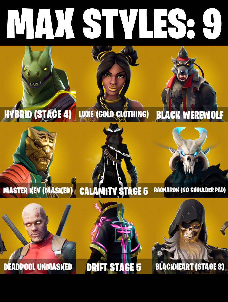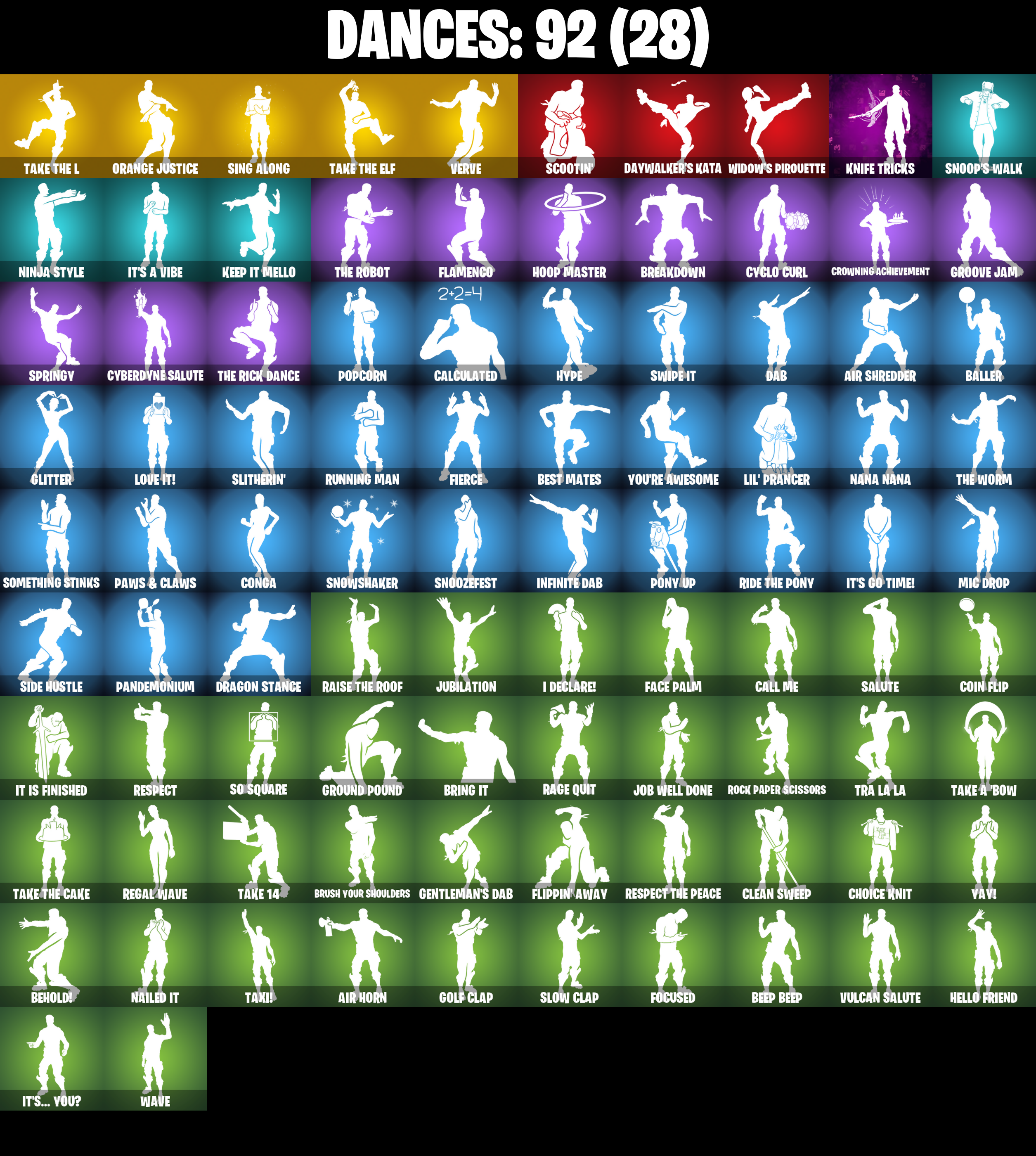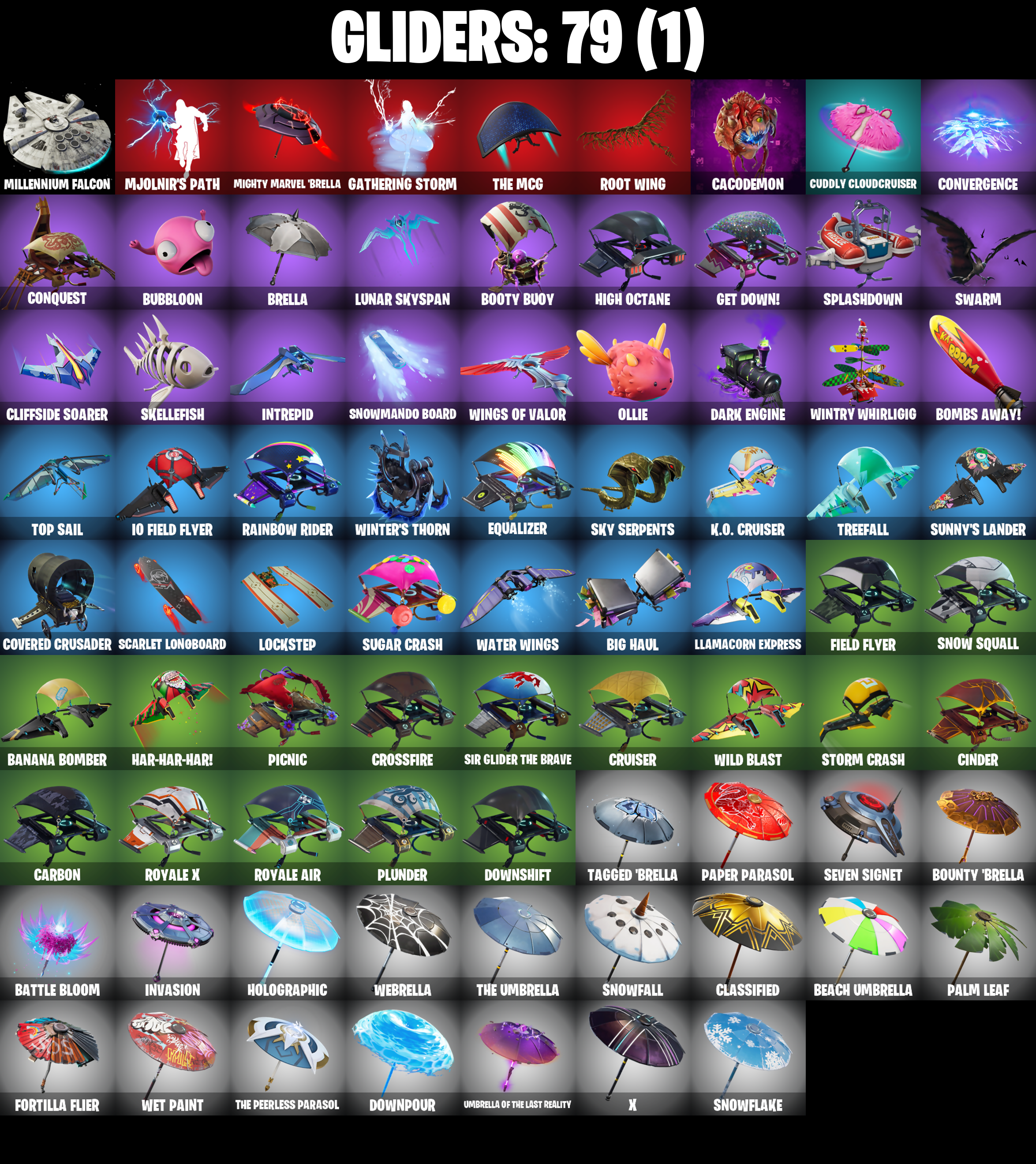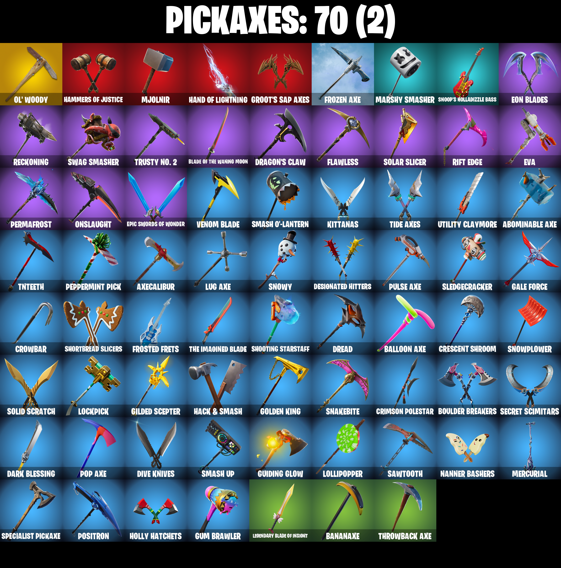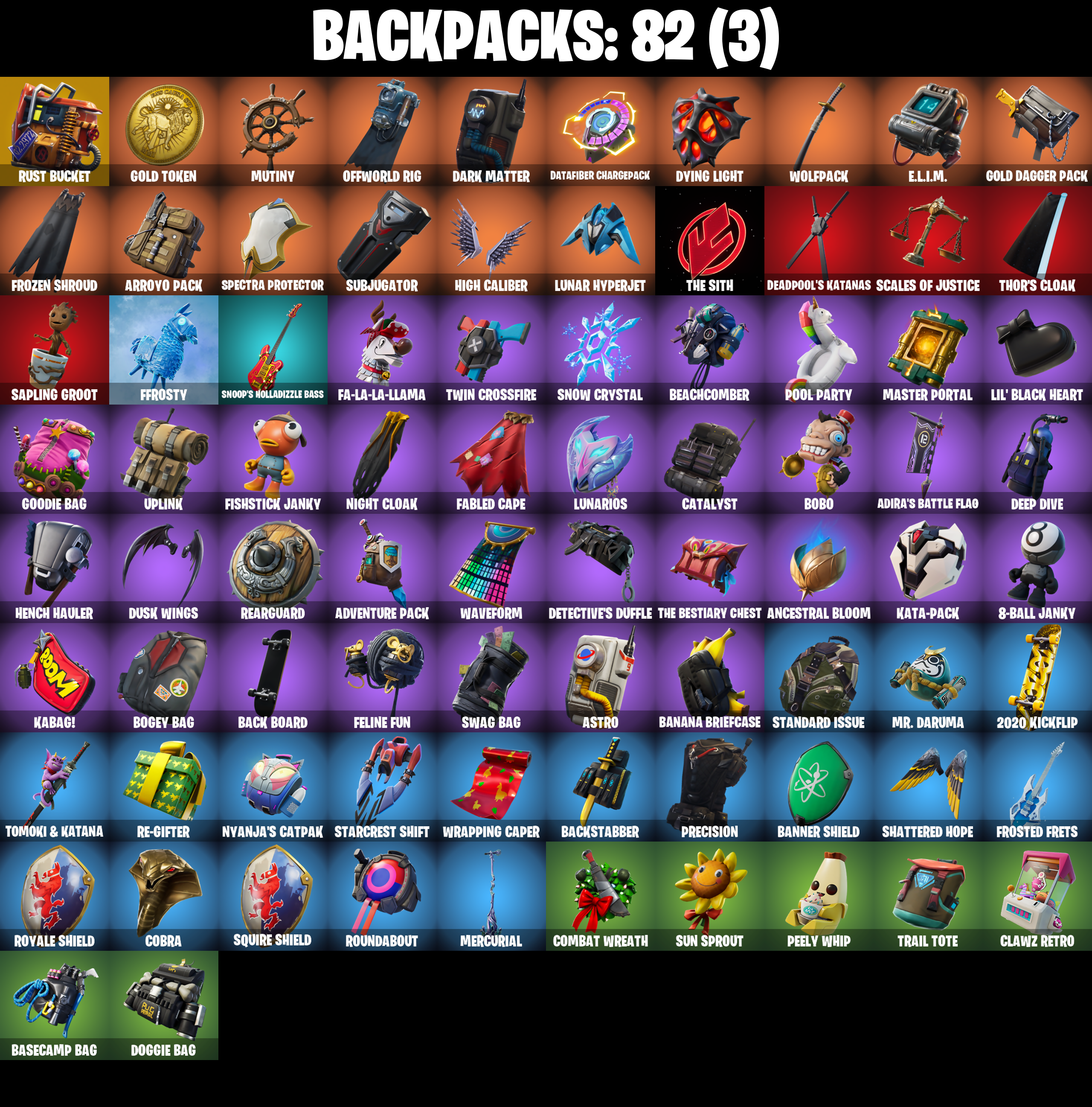 2020 Kickflip, 8-Ball Janky, A.I.M., Abominable Axe, Adira's Battle Flag, Adventure Pack, Agent Peely, Air Horn, Air Shredder, Ancestral Bloom, Arctic Adeline, Arroyo Pack, Astro, Axecalibur, Back Board, Backstabber, Baller, Balloon Axe, Banana Bomber, Banana Briefcase, Bananaxe, Banner Shield, Basecamp Bag, Battle Bloom, Battlehawk, Beach Umbrella, Beachcomber, Beep Beep, Behold!, Best Mates, Big Haul, Birdie, Black Werewolf, Blackheart, Blackheart (Stage 8), Blade Of The Waning Moon, Blue Squire, Bobo, Bogey Bag, Bombs Away!, Booty Buoy, Boulder Breakers, Bounty 'Brella, Breakdown, Brella, Bring It, Brush Your Shoulders, Brutus, Bubbloon, Bullseye, Cacodemon, Calamity, Calamity Stage 5, Calculated, Call Me, Carbide, Carbon, Catalyst, Choice Knit, Cinder, Classified, Clawz Retro, Clean Sweep, Cliffside Soarer, Cobra, Coin Flip, Combat Wreath, Commando, Conga, Conquest, Convergence, Covered Crusader, Crescent Shroom, Crimson Polestar, Crossfire, Crowbar, Crowning Achievement, Cruiser, Cuddly Cloudcruiser, Cyberdyne Salute, Cyclo Curl, D'ark, DJ Yonder, Dab, Dark Blessing, Dark Engine, Dark Matter, Dark Voyager, Datafiber Chargepack, Daywalker's Kata, Deadpool, Deadpool Unmasked, Deadpool's Katanas, Deep Dive, Designated Hitters, Detective's Duffle, Dire, Dive Knives, Doggie Bag, Downpour, Downshift, Dragon Stance, Dragon's Claw, Dread, Drift, Drift Stage 5, Dusk, Dusk Wings, Dying Light, E.L.I.M., Elite Agent, Ember, Enforcer, Eon Blades, Epic Swords Of Wonder, Equalizer, Eva, Fa-La-La-Llama, Fable, Fabled Cape, Face Palm, Fade, Feline Fun, Ffrosty, Field Flyer, Fierce, Fishstick Janky, Flamenco, Flawless, Flippin' Away, Focused, Fortilla Flier, Frosted Frets, Frozen Axe, Frozen Shroud, Gale Force, Gathering Storm, Gear Specialist Maya, Gentleman's Dab, Get Down!, Giddy-Up, Gilded Scepter, Glitter, Gold Dagger Pack, Gold Token, Golden King, Golf Clap, Goodie Bag, Groot, Groot's Sap Axes, Groove Jam, Ground Pound, Guiding Glow, Gum Brawler, Hack & Smash, Hammers Of Justice, Hand Of Lightning, Har-Har-Har!, Hello Friend, Hench Hauler, High Caliber, High Octane, Holly Hatchets, Holographic, Hoop Master, Huntress, Hybrid, Hybrid (Stage 4), Hype, I Declare!, Infinite Dab, Intrepid, Invasion, Io Field Flyer, Iris, It Is Finished, It's A Vibe, It's Go Time!, It's... You?, Jennifer Walters, Job Well Done, Jubilation, Jules, K.O. Cruiser, Kabag!, Kata-Pack, Keep It Mello, Kittanas, Knife Tricks, Krisabelle, Legendary Blade Of Insight, Lil' Black Heart, Lil' Prancer, Llamacorn Express, Lockpick, Lockstep, Lollipopper, Love It!, Lt. Evergreen, Lug Axe, Lunar Hyperjet, Lunar Skyspan, Lunarios, Luxe, Luxe (Gold Clothing), Marshmello, Marshy Smasher, Master Key, Master Key (Masked), Master Portal, Meowscles, Mercurial, Mic Drop, Midas, Mighty Marvel 'Brella, Mike Lowrey, Millennium Falcon, Mission Specialist, Mjolnir, Mjolnir's Path, Moonwalker, Mr. Daruma, Mutiny, Nailed It, Nana Nana, Nanner Bashers, Night Cloak, Nightshade, Ninja Style, Nyanja's Catpak, Ocean, Offworld Rig, Ol' Woody, Ollie, Omega, Onslaught, Orange Justice, Palm Leaf, Pandemonium, Paper Parasol, Paws & Claws, Peely, Peely Whip, Peppermint Pick, Permafrost, Picnic, Plunder, Polar Peely, Pony Up, Pool Party, Pop Axe, Popcorn, Positron, Precision, Pulse Axe, Rage Quit, Ragnarok, Ragnarok (No Shoulder Pad), Rainbow Rider, Raise The Roof, Re-Gifter, Rearguard, Reckoning, Redline, Regal Wave, Respect, Respect The Peace, Ride The Pony, Rift Edge, Rock Paper Scissors, Rogue Agent, Rook, Root Wing, Roundabout, Royale Air, Royale Knight, Royale Shield, Royale X, Ruin, Running Man, Rust Bucket, Rust Lord, Salute, Sapling Groot, Sawtooth, Scales Of Justice, Scarlet Lonoboard, Scootin', Scuba Jonesy, Secret Scimitars, Seven Signet, Sgt. Green Clover, Shattered Hope, Shooting Starstaff, Shortbread Slicers, Side Hustle, Sidewinder, Sing Along, Sir Glider The Brave, Skellefish, Sky Serpents, Skye, Sledgecracker, Sledgehammer, Slitherin', Slow Clap, Smash O'-Lantern, Smash Up, Snakebite, Snoop's Holladizzle Bass, Snoop's Walk, Snoozefest, Snow Crystal, Snow Squall, Snowfall, Snowflake, Snowmando Board, Snowplower, Snowshaker, Snowy, So Square, Solar Slicer, Solid Scratch, Something Stinks, Specialist Pickaxe, Spectra Protector, Splashdown, Springy, Squad Leader, Squire Shield, Standard Issue, Starcrest Shift, Storm, Storm Crash, Subjugator, Sugar Crash, Sun Sprout, Sun Strider, Sunny's Lander, Swag Bag, Swag Smasher, Swarm, Swipe It, Tagged 'Brella, Take 14, Take A'Bow, Take The Cake, Take The Elf, Take The L, Taxi!, Teknique, The Ace, The Bestiary Chest, The Imagined Blade, The Mcg, The Peerless Parasol, The Reaper, The Rick Dance, The Robot, The Sith, The Umbrella, The Visitor, The Worm, Thor, Thor's Cloak, Throwback Axe, Tide Axes, Tnteeth, Tntina, Tomoki & Katana, Top Sail, Tra La La, Trail Tote, Treefall, Trusty No. 2, Twin Crossfire, Umbrella Of The Last Reality, Uplink, Utility Claymore, Valor, Venom Blade, Verve, Vulcan Salute, Water Wings, Wave, Waveform, Webrella, Wet Paint, Widow's Pirouette, Wild Blast, Wingman, Wings Of Valor, Winter's Thorn, Wintry Whirligig, Wolfpack, Wooly Warrior, Wrapping Caper, X, Yay!, Yellowjacket, You're Awesome, Zoey