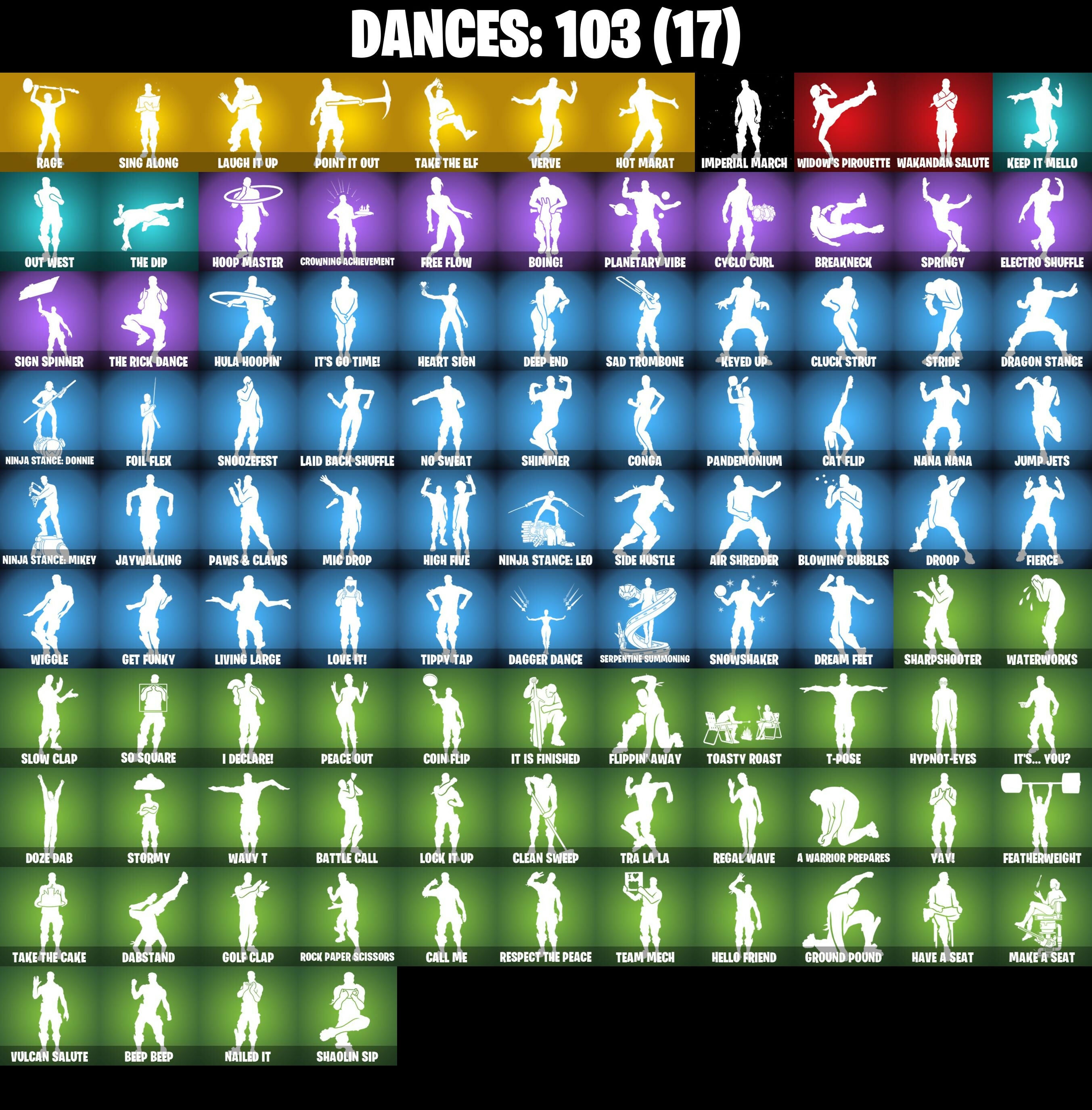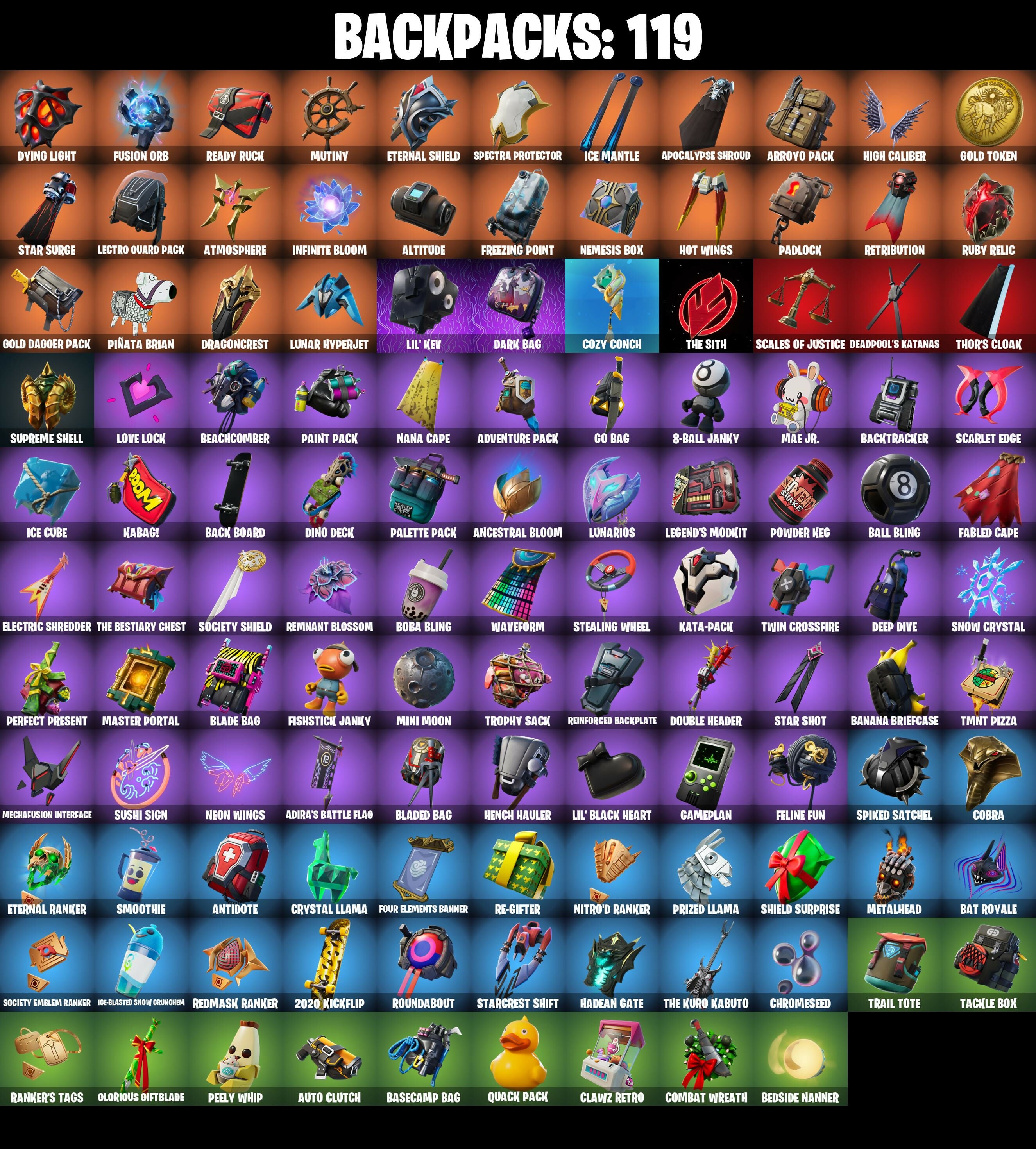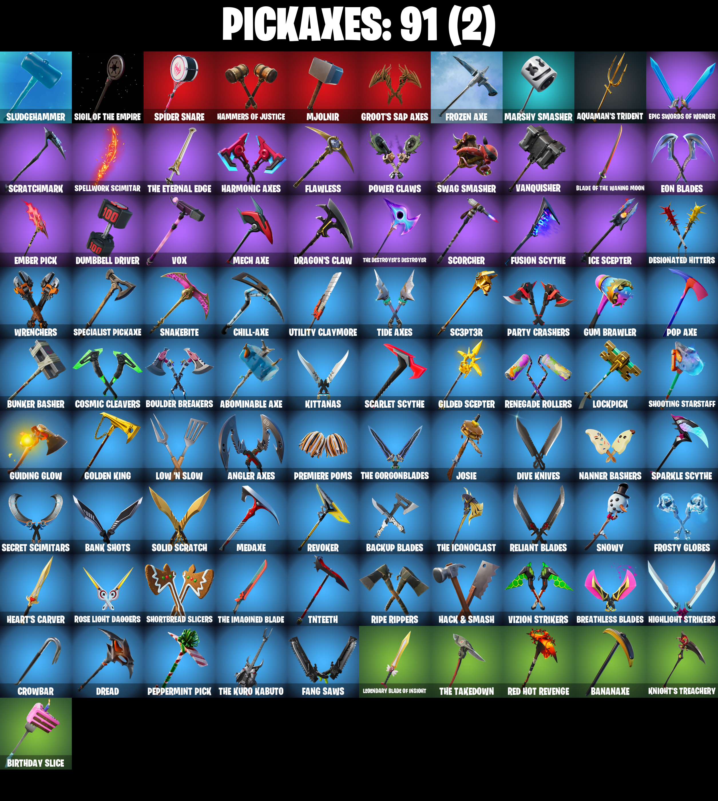 2020 Kickflip, 8-Ball Janky, 8-Ball Vs Scratch, A Warrior Prepares, Abominable Axe, Adira's Battle Flag, Adventure Pack, Agent Peely, Air Shredder, Altitude, Ancestral Bloom, Angler Axes, Antidote, Apocalypse Shroud, Aquaman, Aquaman's Trident, Arroyo Pack, Arthur Curry, Assault Trooper, Atmosphere, Aura, Auto Clutch, Back Board, Backtracker, Backup Blades, Ball Bling, Banana Briefcase, Bananaxe, Bank Shots, Basecamp Bag, Bat Royale, Battle Call, Beachcomber, Bedside Nanner, Beep Beep, Birthday Slice, Blackheart, Blackheart (Stage 8), Blade Bag, Blade Of The Waning Moon, Bladed Bag, Blowing Bubbles, Boba Bling, Boing!, Boulder Breakers, Breakneck, Breathless Blades, Bunker Basher, Bunker Jonesy, Call Me, Cameo Vs Chic, Cat Flip, Catalyst, Catalyst (Overcharged), Chill-Axe, Chrome Punk, Chromeseed, Clawz Retro, Clean Sweep, Cluck Strut, Cobalt, Cobra, Coin Flip, Combat Wreath, Conga, Cosmic Cleavers, Cozy Conch, Crowbar, Crowning Achievement, Crystal Llama, Cyclo Curl, Dabstand, Dagger Dance, Dark Bag, Dark Bomber, Deadpool, Deadpool Unmasked, Deadpool's Katanas, Deep Dive, Deep End, Demi, Designated Hitters, Dino Deck, Dive Knives, Double Header, Doze Dab, Dragon Stance, Dragon's Claw, Dragoncrest, Dread, Dream Feet, Droop, Dumbbell Driver, Dying Light, Electric Shredder, Electro Shuffle, Ember, Ember (Night), Ember Pick, Eon Blades, Epic Swords Of Wonder, Eternal Knight, Eternal Ranker, Eternal Shield, Eternal Voyager, Eternal Voyager (Eternal), Fabled Cape, Fade, Fang Saws, Featherweight, Feline Fun, Fierce, Fishstick Janky, Flawless, Flippin' Away, Foil Flex, Four Elements Banner, Free Flow, Freezing Point, Frostbite, Frosty Globes, Frozen Axe, Fusion, Fusion Orb, Fusion Scythe, Gameplan, Gear Specialist Maya, Get Funky, Gilded Scepter, Glorious Giftblade, Go Bag, Gold Brutus, Gold Dagger Pack, Gold Midas, Gold Token, Golden King, Golf Clap, Groot's Sap Axes, Ground Pound, Guiding Glow, Gum Brawler, Hack & Smash, Hadean Gate, Hammers Of Justice, Happy, Harmonic Axes, Have A Seat, Hazard, Heart Sign, Heart's Carver, Hello Friend, Hench Hauler, High Caliber, High Five, Highlight Strikers, Holiday Boxy, Hoop Master, Hot Marat, Hot Wings, Hula Hoopin', Hybrid, Hybrid (Stage 4), Hypnot-Eyes, I Declare!, Ice Cube, Ice King (Gold), Ice Mantle, Ice Scepter, Ice-Blasted Snow Crunch'em, Imperial March, Infinite Bloom, Iris, It Is Finished, It's Go Time!, It's... You?, Jaywalking, Jennifer Walters, Josie, Journey Vs Hazard, Jules, Jump Jets, Kabag!, Kata-Pack, Keep It Mello, Keyed Up, Kit, Kittanas, Knight's Treachery, Laid Back Shuffle, Laugh It Up, Lectro Guard Pack, Legend's Modkit, Legendary Blade Of Insight, Lil' Black Heart, Lil' Kev, Living Large, Lock It Up, Lockpick, Love It!, Love Lock, Low 'N Slow, Lt. Evergreen, Lunar Hyperjet, Lunarios, Luxe, Luxe (Gold Clothing), Lynx, Lynx (Stage 4 - No Ponytail), Mae Jr., Make A Seat, Marshy Smasher, Masked, Master Key, Master Key (Masked), Master Portal, Mech Axe, Mechafusion Interface, Medaxe, Meowscles, Metalhead, Mic Drop, Mini Moon, Mjolnir, Mutiny, Nailed It, Nana Cape, Nana Nana, Nanner Bashers, Nemesis Box, Neon Wings, Ninja Stance: Donnie, Ninja Stance: Leo, Ninja Stance: Mikey, Nitro'd Ranker, No Sweat, Nog Ops, Ocean, Onesie, Onesie (Winter), Out West, Padlock, Paint Pack, Palette Pack, Pandemonium, Party Crashers, Paws & Claws, Peace Out, Peely, Peely Whip, Peppermint Pick, Perfect Present, Piñata Brian, Planetary Vibe, Point It Out, Pop Axe, Powder, Powder (White), Powder Keg, Power Claws, Premiere Poms, Prized Llama, Quack Pack, Rage, Ranker's Tags, Re-Gifter, Ready Ruck, Red Hot Revenge, Red Strike, Redmask Ranker, Regal Wave, Reinforced Backplate, Reliant Blades, Remedy (Purple), Remedy Vs Toxin, Remnant Blossom, Renegade Rollers, Respect The Peace, Retribution, Revoker, Ripe Rippers, Rippley (Purple), Rippley Vs Sludge, Riptide, Rock Paper Scissors, Rose Light Daggers, Roundabout, Rox, Rox (Stage 5), Ruby Relic, Ruin, Runway Racer, SC3PT3R, Sad Trombone, Scales of Justice, Scarlet Edge, Scarlet Scythe, Scorcher, Scratch (Virus), Scratchmark, Scuba Jonesy, Secret Scimitars, Sentinel, Sentinel (Dark), Serpentine Summoning, Sgt. Winter, Sgt. Winter Headgear, Shaolin Sip, Sharpshooter, Shield Surprise, Shimmer, Shooting Starstaff, Shortbread Slicers, Side Hustle, Sidewinder, Sidewinder (Dark), Sigil Of The Empire, Sign Spinner, Sing Along, Singularity, Singularity (Stage 3), Siona, Skull Ranger, Skye, Slow Clap, Sludgehammer, Smoothie, Snakebite, Snoozefest, Snow Crystal, Snowshaker, Snowy, So Square, Society Emblem Ranker, Society Shield, Solid Scratch, Sorana, Sorana (Grey), Sparkle Scythe, Sparkle Supreme, Sparkle Supreme (Bob Cut), Specialist Pickaxe, Spectra Protector, Spellwork Scimitar, Spider Snare, Spiked Satchel, Springy, Stage 4, Star Shot, Star Surge, Starcrest Shift, Stealing Wheel, Stormy, Stratus, Stratus (Red), Stride, Supreme Shell, Sushi Sign, Swag Smasher, T-Pose, TMNT Pizza, Tackle Box, Take The Cake, Take The Elf, Team Mech, The Bestiary Chest, The Destroyer's Destroyer, The Dip, The Eternal Edge, The Gorgonblades, The Ice King, The Iconoclast, The Imagined Blade, The Kuro Kabuto, The Prisoner, The Rick Dance, The Scientist, The Sith, The Takedown, Thor, Thor's Cloak, Tide Axes, Tilted Teknique, Tilted Teknique (Hoodie), Tippy Tap, Tnteeth, Tntina, Toasty Roast, Tra La La, Trail Tote, Trog, Trog (Tribal), Trophy Sack, Turk Vs Riptide, Twin Crossfire, Ultima Knight, Ultima Knight (Origin), Utility Claymore, Vanquisher, Vega, Vega (Teal), Vendetta, Vendetta (Stage 6), Verve, Vizion Strikers, Vox, Vulcan Salute, Wakandan Salute, Waterworks, Waveform, Wavy T, Welder, Widow's Pirouette, Wiggle, Wilde, Winterfest Bushranger, Wooly Warrior, Wrenchers, X-Lord, X-Lord (Scavenger), Xev, Yay!, Yond3r, Yond3r (Crown), Zenith, Zenith (Stage 4)