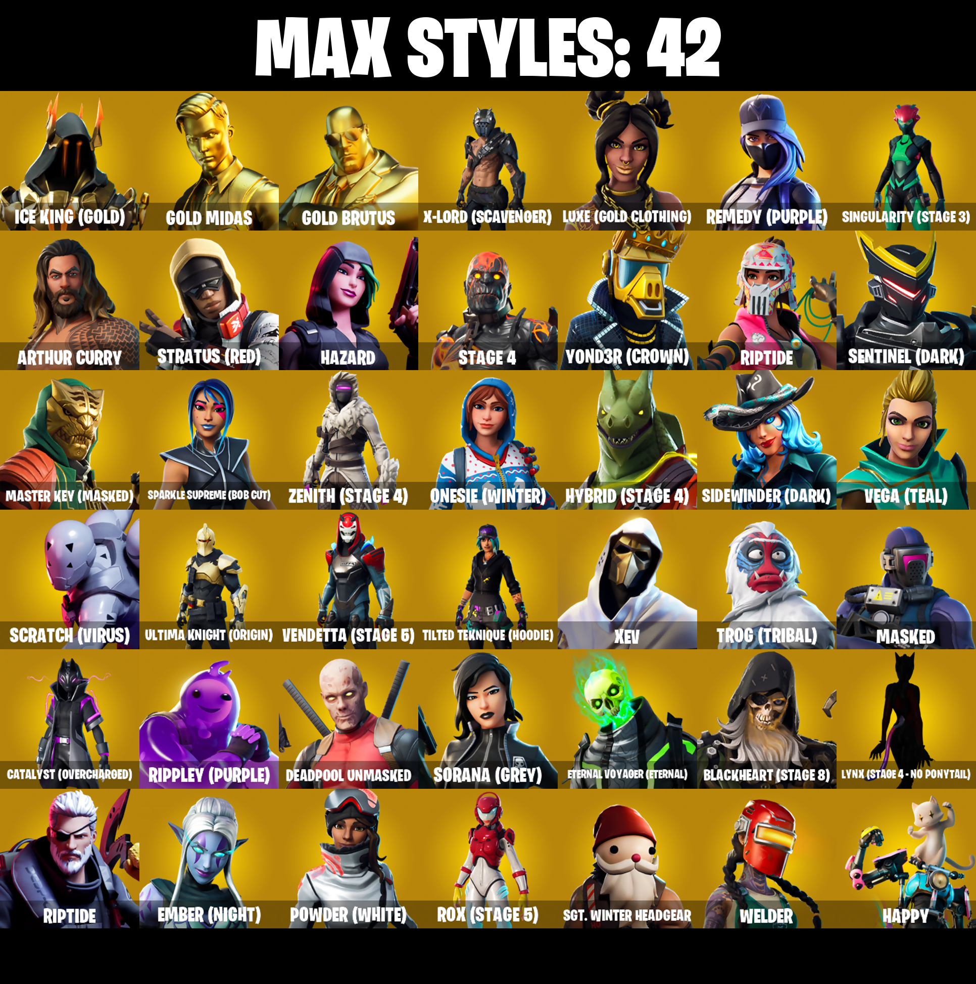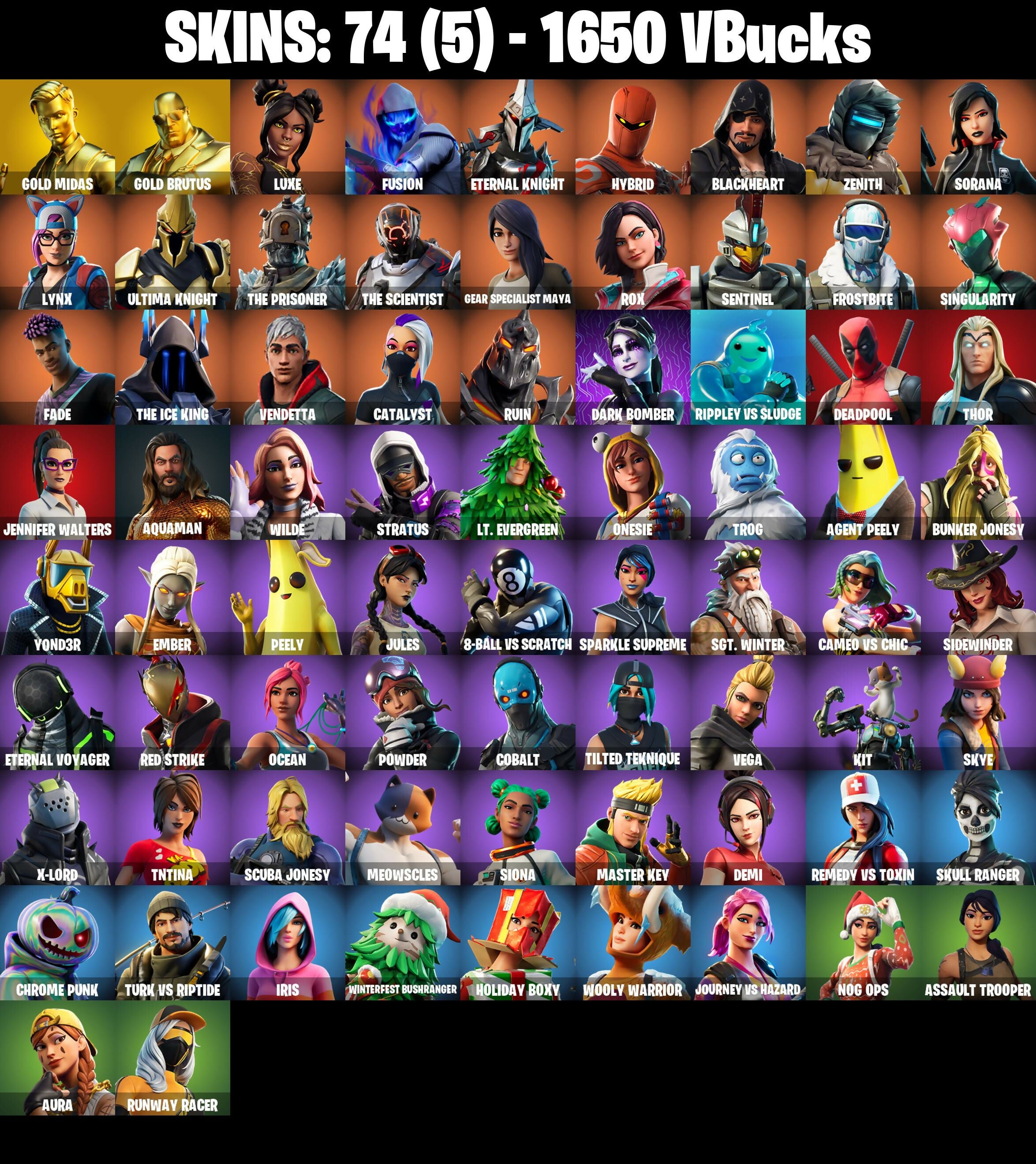 PC/PSN/XBOX |74 skins | Deadpool | Gold Midas | Gold Brutus | Rage | The Ice King | Luxe | Peely | Vendetta | Ultima Knight | Fusion | #B1183