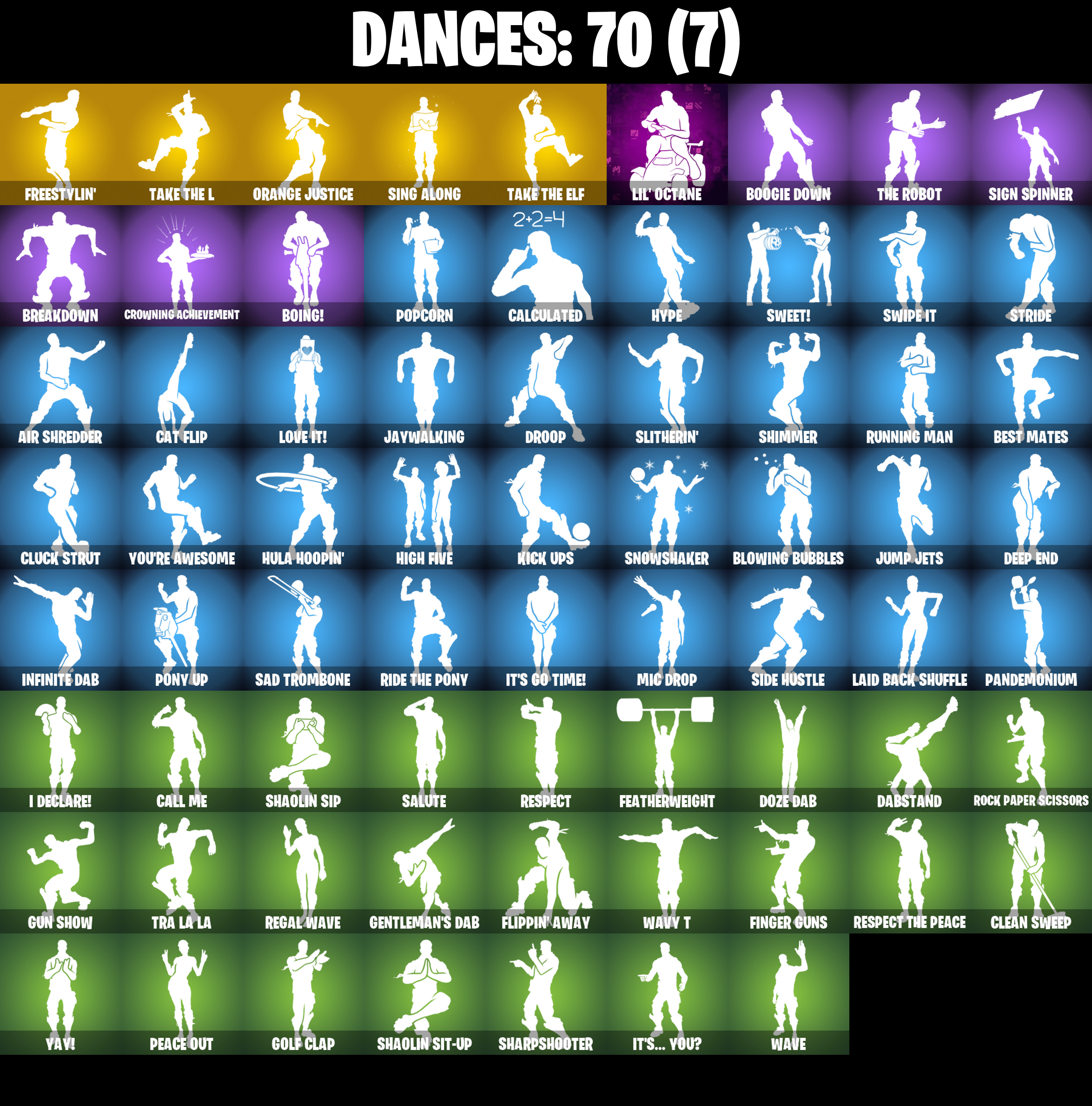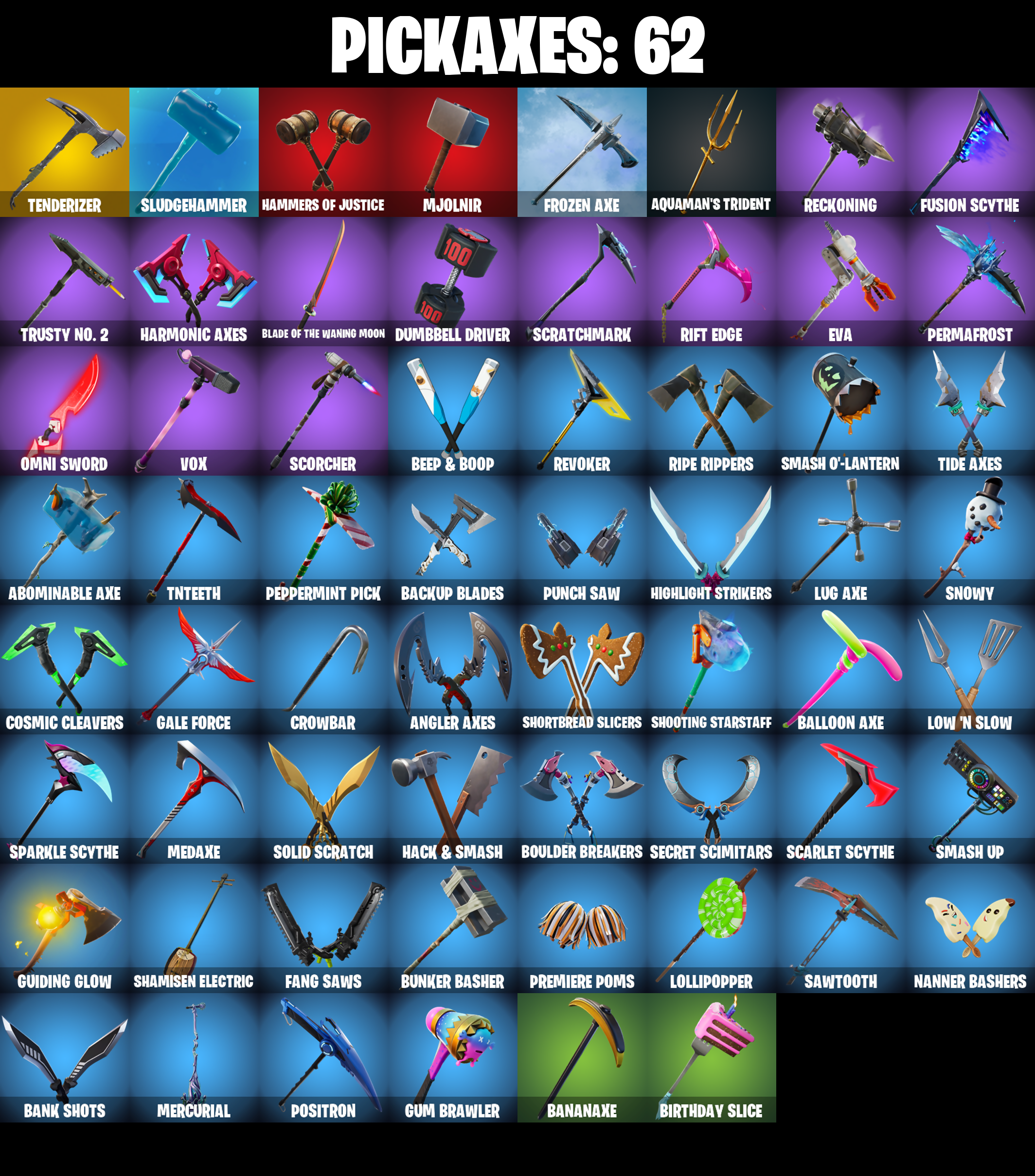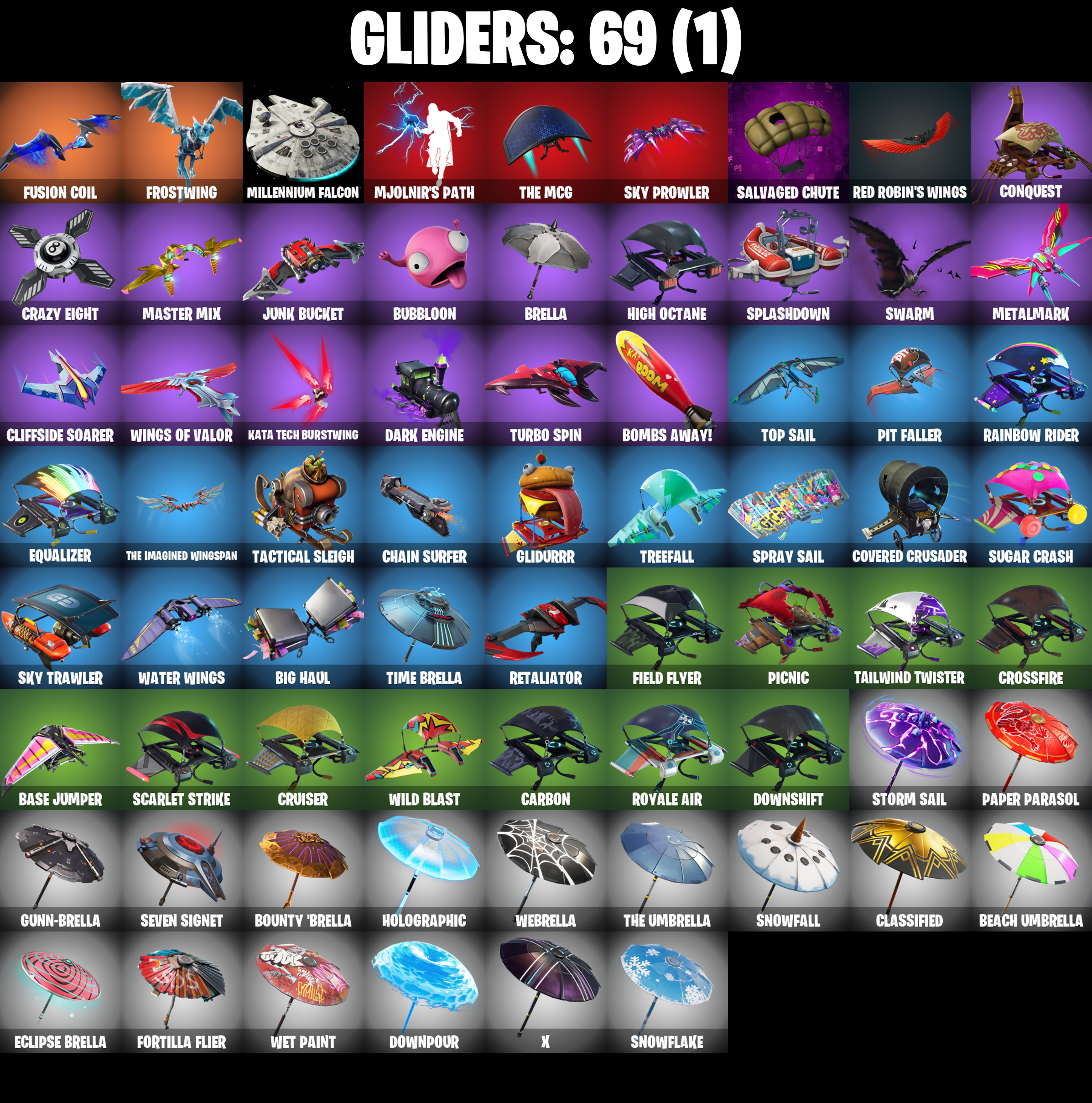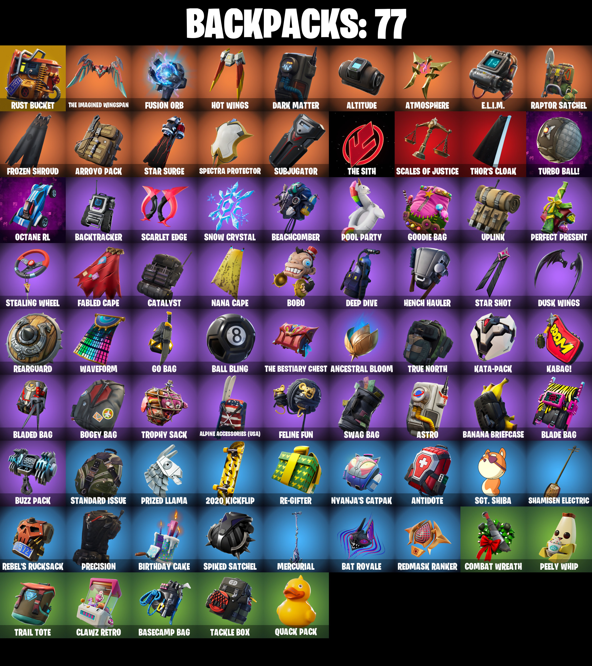 2020 Kickflip, 8-Ball Vs Scratch, A.I.M., Abominable Axe, Agent Peely, Air Shredder, Alpine Accessories (USA), Alpine Ace (USA), Altitude, Ancestral Bloom, Angler Axes, Antidote, Aquaman's Trident, Arroyo Pack, Astro, Atmosphere, Aura, Backtracker, Backup Blades, Ball Bling, Balloon Axe, Banana Briefcase, Bananaxe, Bank Shots, Base Jumper, Basecamp Bag, Bat Royale, Battlehawk, Beach Umbrella, Beachcomber, Beep & Boop, Best Mates, Big Haul, Birthday Cake, Birthday Slice, Blade Bag, Blade Of The Waning Moon, Bladed Bag, Blowing Bubbles, Bobo, Bogey Bag, Boing!, Bombs Away!, Boogie Down, Boulder Breakers, Bounty 'Brella, Breakdown, Brella, Brutus, Bubbloon, Bunker Basher, Bunker Jonesy, Buzz Pack, Calamity, Calamity Stage 5, Calculated, Call Me, Cameo Vs Chic, Carbide, Carbon, Cat Flip, Catalyst, Chain Surfer, Classified, Clawz Retro, Clean Sweep, Cliffside Soarer, Cluck Strut, Combat Wreath, Conquest, Cosmic Cleavers, Covered Crusader, Crazy Eight, Crossfire, Crowbar, Crowning Achievement, Cruiser, DJ Yonder, Dabstand, Dark Engine, Dark Matter, Dark Voyager, Deadpool, Deep Dive, Deep End, Demi, Downpour, Downshift, Doze Dab, Drift, Drift Stage 5, Droop, Dumbbell Driver, Dusk, Dusk Wings, E.L.I.M., Eclipse Brella, Elite Agent, Enforcer, Equalizer, Eva, Fable, Fabled Cape, Fade, Fang Saws, Featherweight, Feline Fun, Field Flyer, Finger Guns, Flippin' Away, Fortilla Flier, Freestylin', Frostwing, Frozen Axe, Frozen Shroud, Fusion, Fusion Coil, Fusion Orb, Fusion Scythe, Gale Force, Gear Specialist Maya, Gentleman's Dab, Giddy-Up, Glidurrr, Go Bag, Golf Clap, Goodie Bag, Guiding Glow, Gum Brawler, Gun Show, Gunn-Brella, Gunnar, Hack & Smash, Hammers Of Justice, Harmonic Axes, Hench Hauler, High Five, High Octane, Highlight Strikers, Holographic, Hot Wings, Hula Hoopin', Huntress, Hype, I Declare!, Infinite Dab, It's Go Time!, It's... You?, Jaywalking, Jennifer Walters, Journey Vs Hazard, Jump Jets, Junk Bucket, Kabag!, Kata Tech Burstwing, Kata-Pack, Kick Ups, Laid Back Shuffle, Lil' Octane, Lollipopper, Love It!, Low 'N Slow, Lt. Evergreen, Lug Axe, Lynx, Lynx (Stage 4 - No Ponytail), Master Mix, Medaxe, Mercurial, Metalmark, Mic Drop, Millennium Falcon, Mission Specialist, Mjolnir, Mjolnir's Path, Moonwalker, Nana Cape, Nanner Bashers, Nitelite, Nyanja's Catpak, Ocean, Octane RL, Omni Sword, Orange Justice, Pandemonium, Paper Parasol, Peace Out, Peely Whip, Peppermint Pick, Perfect Present, Permafrost, Picnic, Pit Faller, Poised Playmaker, Pony Up, Pool Party, Popcorn, Positron, Powder, Precision, Premiere Poms, Prized Llama, Punch Saw, Quack Pack, Ragnarok, Rainbow Rider, Raonarok (No Shoulder Pad), Raptor, Raptor Satchel, Re-Gifter, Rearguard, Rebel's Rucksack, Reckoning, Red Robin's Wings, Red Strike, Redline, Redmask Ranker, Regal Wave, Remedy (Purple), Remedy Vs Toxin, Respect, Respect The Peace, Retaliator, Revoker, Ride The Pony, Rift Edge, Ripe Rippers, Rippley vs Sludge, Rock Paper Scissors, Rogue Agent, Rook, Rox, Rox (Stage 5), Royale Air, Running Man, Rust Bucket, Rust Lord, Sad Trombone, Salute, Salvaged Chute, Sawtooth, Scales of Justice, Scarlet Edge, Scarlet Scythe, Scarlet Strike, Scorcher, Scratch (Virus), Scratchmark, Scuba Jonesy, Secret Scimitars, Sentinel, Seven Signet, Sgt. Shiba, Sgt. Winter, Sgt. Winter Headgear, Shamisen Electric, Shaolin Sip, Shaolin' Sit-Up, Sharpshooter, Shimmer, Shooting Starstaff, Shortbread Slicers, Side Hustle, Sign Spinner, Sing Along, Singularity, Sky Prowler, Sky Trawler, Sledgehammer, Slitherin', Sludgehammer, Smash O'-Lantern, Smash Up, Snow Crystal, Snowfall, Snowflake, Snowshaker, Snowy, Solid Scratch, Sparkle Scythe, Sparkle Supreme, Spectra Protector, Spiked Satchel, Splashdown, Spray Sail, Standard Issue, Star Shot, Star Surge, Stealing Wheel, Storm Sail, Stratus, Stride, Subjugator, Sugar Crash, Sun Strider, Swag Bag, Swarm, Sweet!, Swipe It, Tackle Box, Tactical Sleigh, Tailwind Twister, Take The Elf, Take The L, Teknique, Tenderizer, The Ace, The Bestiary Chest, The Imagined Wingspan, The Mcg, The Reaper, The Robot, The Sith, The Umbrella, Thor, Thor's Cloak, Tide Axes, Tilted Teknique, Tilted Teknique (Hoodie), Time Brella, Tnteeth, Tntina, Top Sail, Tra La La, Trail Tote, Trailblazer, Treefall, Trophy Sack, True North, Trusty No. 2, Tsuki 2.0, Turbo Ball!, Turbo Spin, Turk Vs Riptide, Uplink, Valor, Vega, Vega (Teal), Vox, Water Wings, Wave, Waveform, Wavy T, Webrella, Wet Paint, Whiplash, Wild Blast, Wingman, Wings Of Valor, Wooly Warrior, X, X-Lord, X-Lord (Scavenger), Yay!, Yond3r, You're Awesome, Zenith, Zenith (Stage 4), Zoe Clash, Zoey