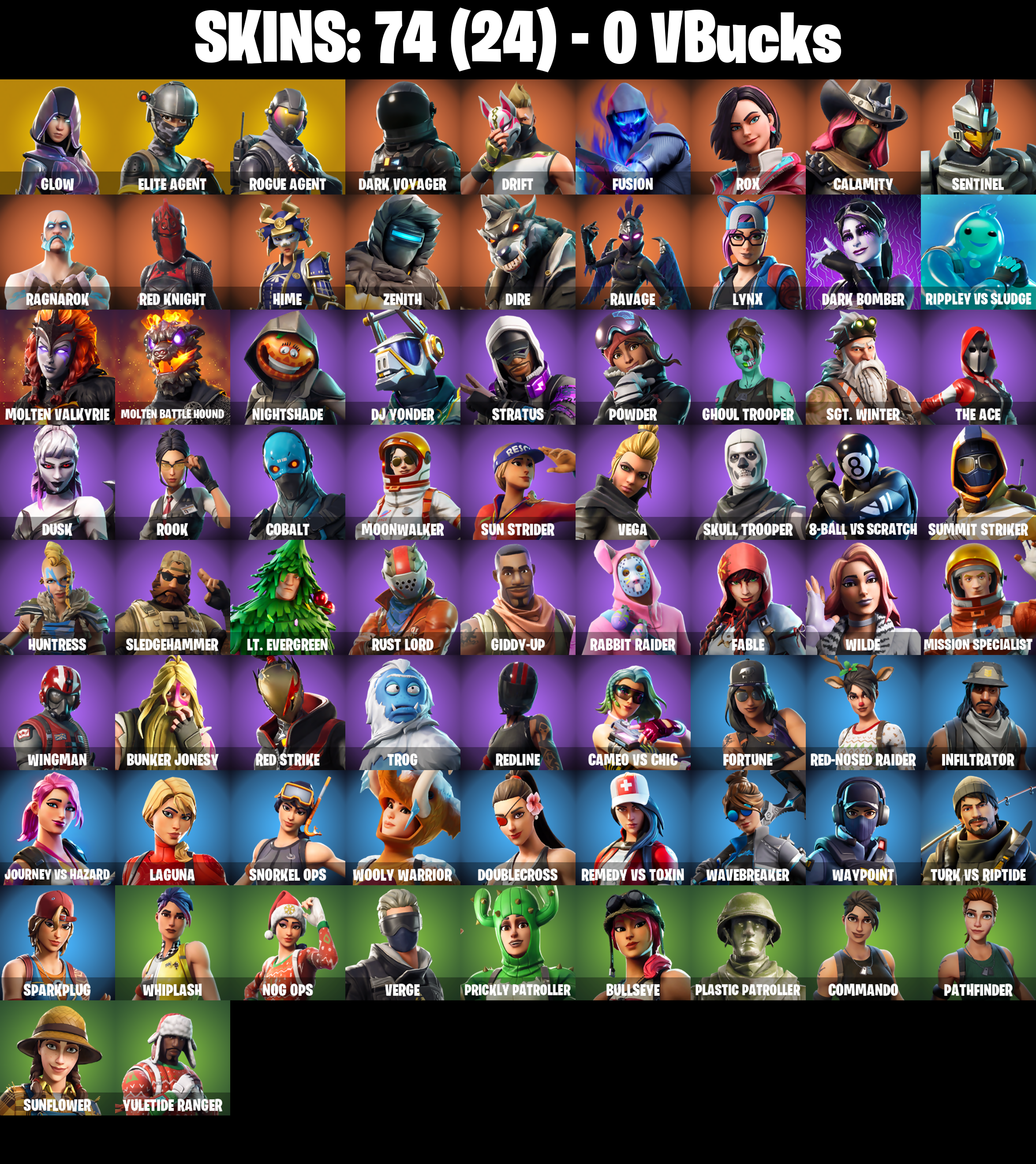 PC/PSN/XBOX |74 skins | Glow | Reaper | Elite Agent | Take The L | Orange Justice | Dark Voyager | Rogue Agent | Drift | Trusty No. 2 | #B996