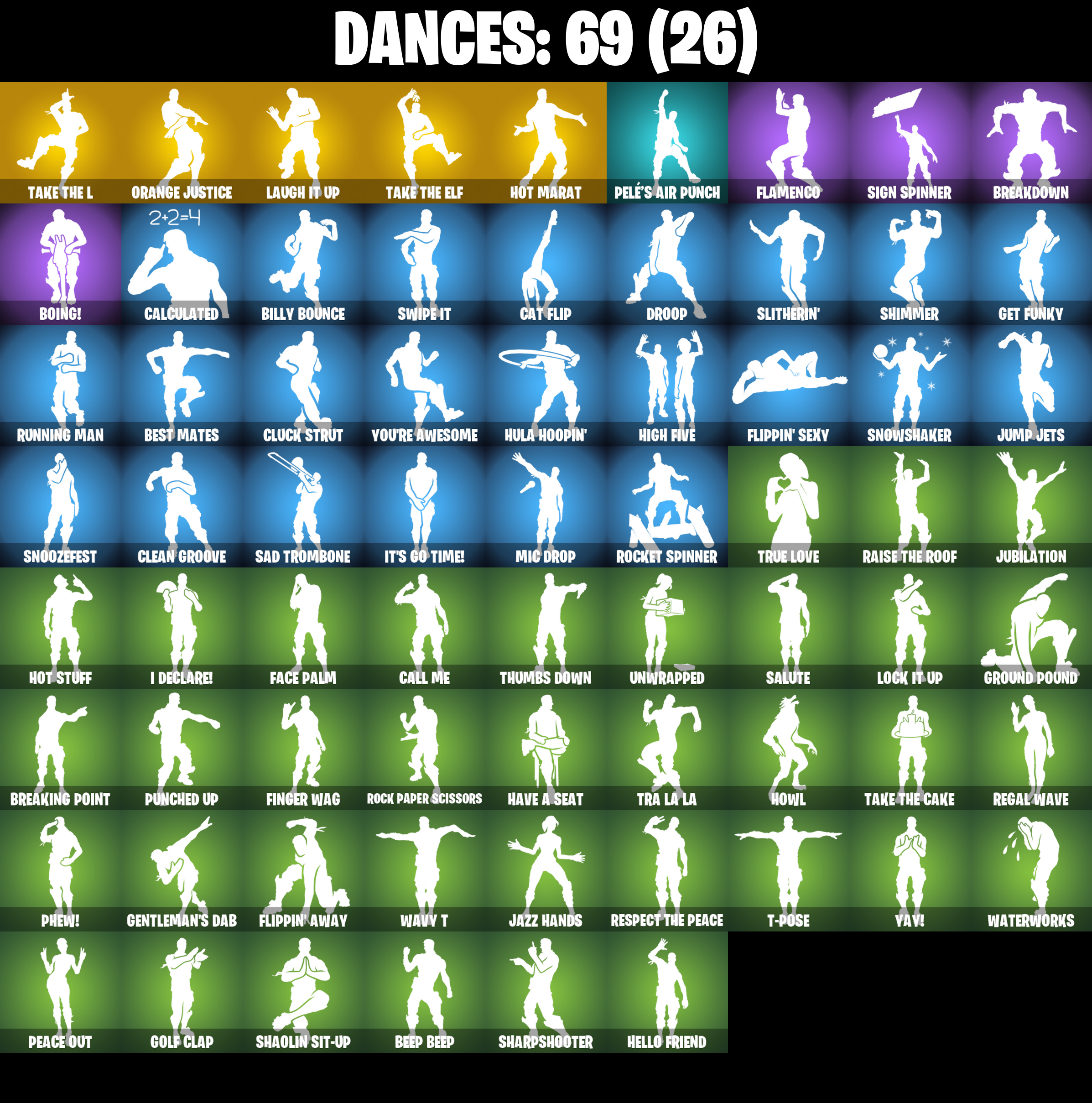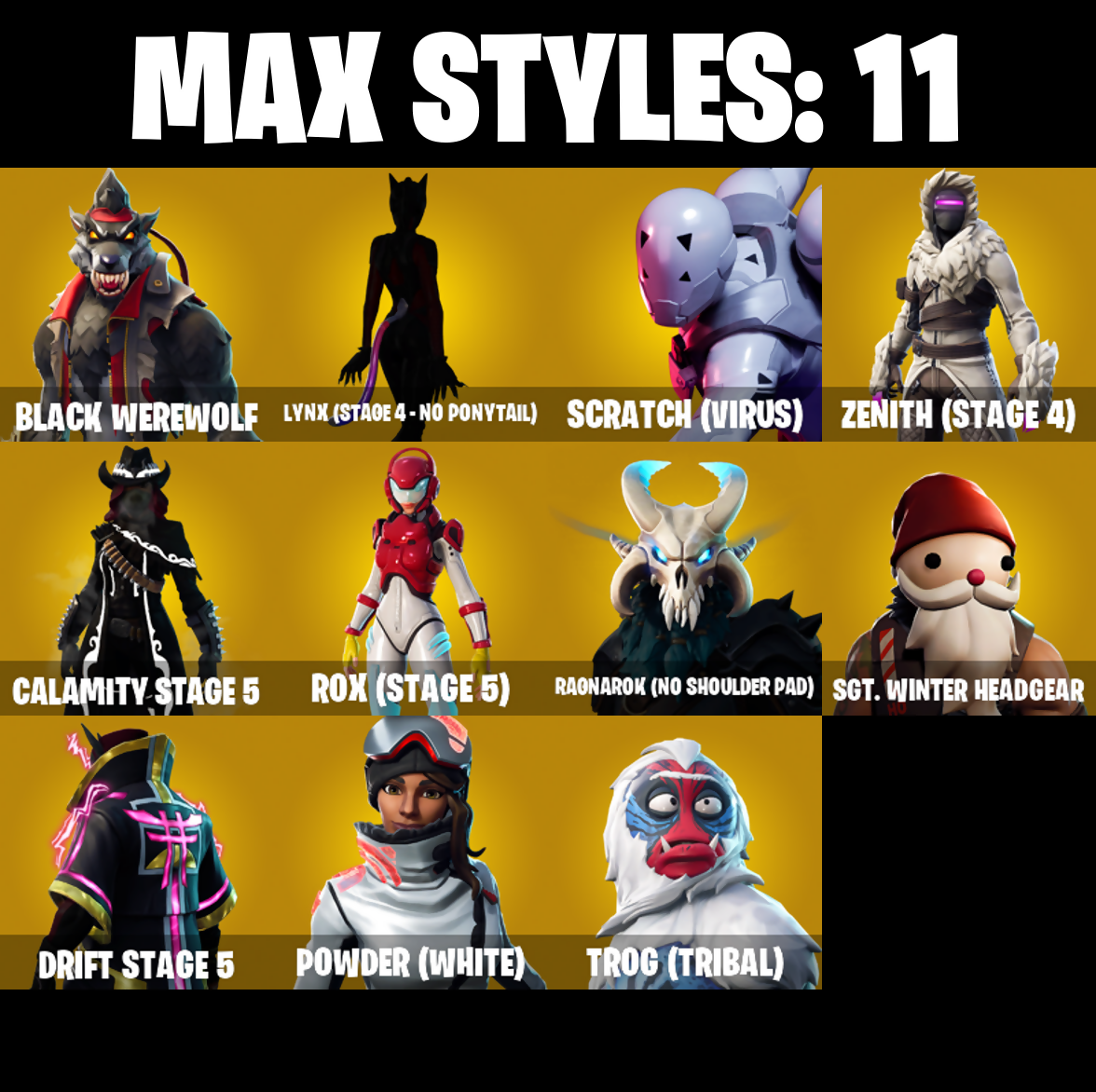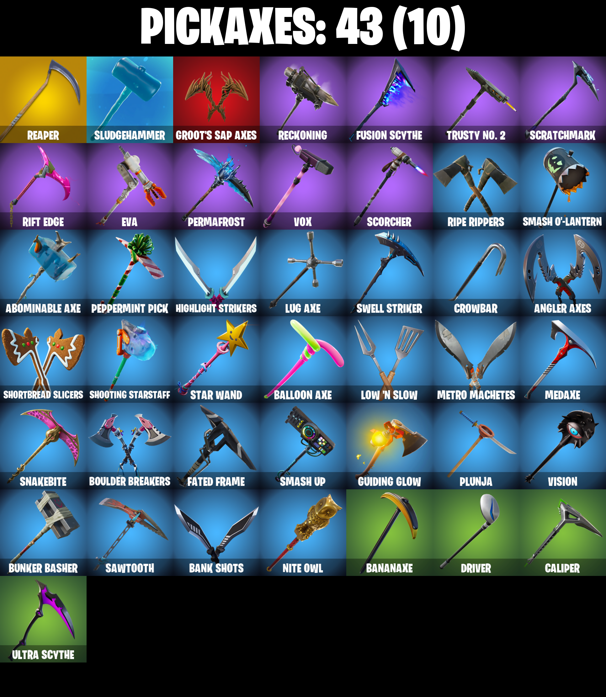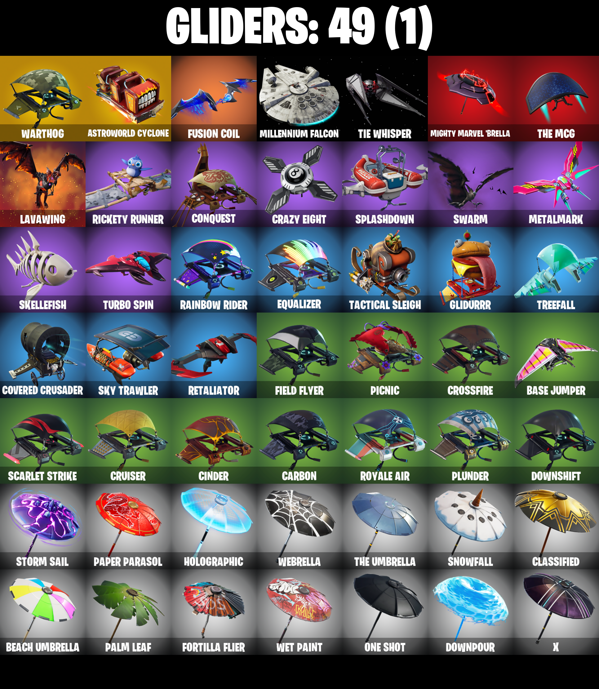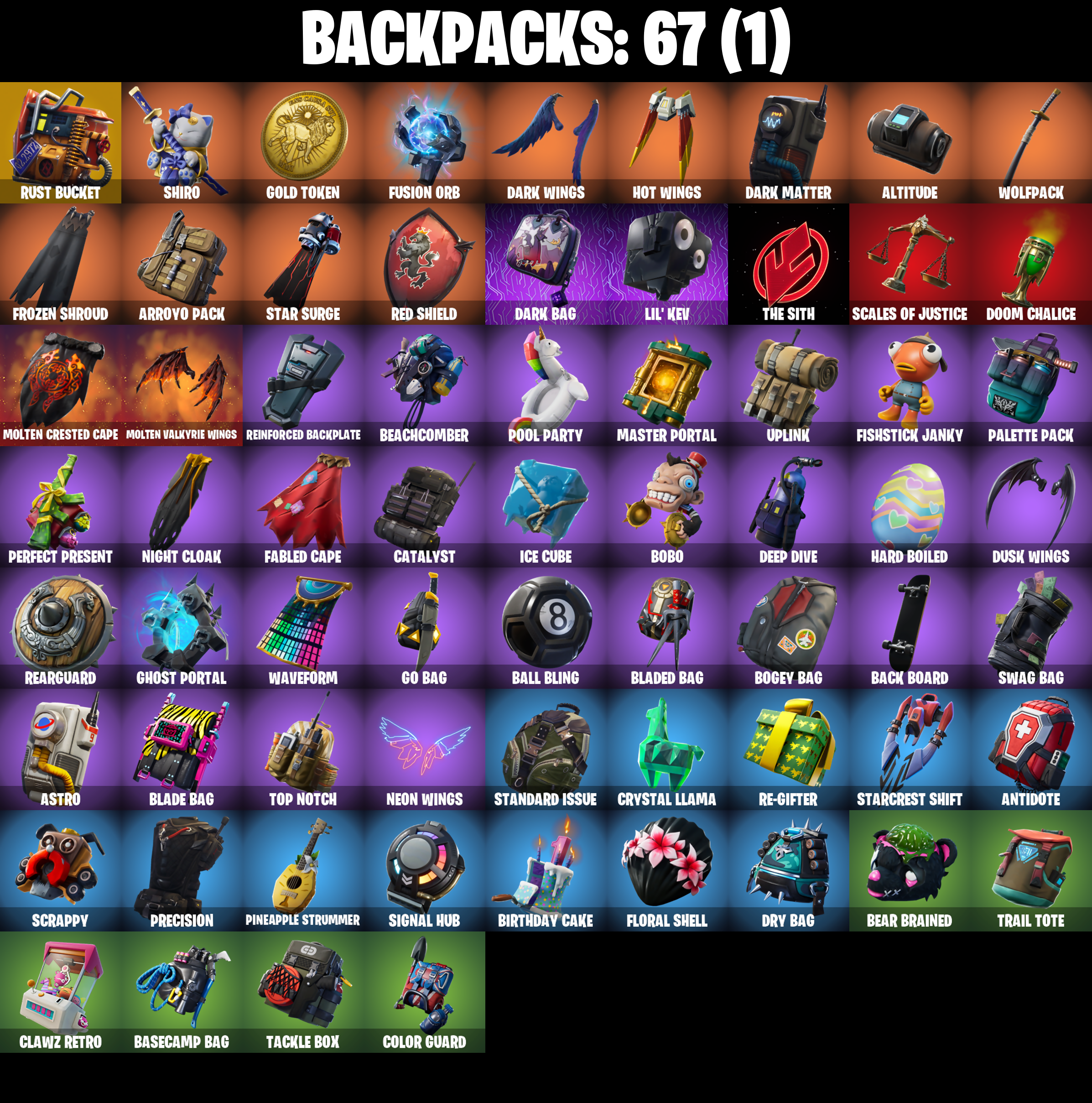 8-Ball Vs Scratch, Abominable Axe, Altitude, Angler Axes, Antidote, Arroyo Pack, Astro, Astroworld Cyclone, Back Board, Ball Bling, Balloon Axe, Bananaxe, Bank Shots, Base Jumper, Basecamp Bag, Beach Umbrella, Beachcomber, Bear Brained, Beep Beep, Best Mates, Billy Bounce, Birthday Cake, Black Werewolf, Blade Bag, Bladed Bag, Bobo, Bogey Bag, Boing!, Boulder Breakers, Breakdown, Breaking Point, Bullseye, Bunker Basher, Bunker Jonesy, Calamity, Calamity Stage 5, Calculated, Caliper, Call Me, Cameo Vs Chic, Carbon, Cat Flip, Catalyst, Cinder, Classified, Clawz Retro, Clean Groove, Cluck Strut, Cobalt, Color Guard, Commando, Conquest, Covered Crusader, Crazy Eight, Crossfire, Crowbar, Cruiser, Crystal Llama, DJ Yonder, Dark Bag, Dark Bomber, Dark Matter, Dark Voyager, Dark Wings, Deep Dive, Dire, Doom Chalice, Doublecross, Downpour, Downshift, Drift, Drift Stage 5, Driver, Droop, Dry Bag, Dusk, Dusk Wings, Elite Agent, Equalizer, Eva, Fable, Fabled Cape, Face Palm, Fated Frame, Field Flyer, Finger Wag, Fishstick Janky, Flamenco, Flippin' Away, Flippin' Sexy, Floral Shell, Fortilla Flier, Fortune, Frozen Shroud, Fusion, Fusion Coil, Fusion Orb, Fusion Scythe, Gentleman's Dab, Get Funky, Ghost Portal, Ghoul Trooper, Giddy-Up, Glidurr, Glow, Go Bag, Gold Token, Golf Clap, Groot's Sap Axes, Ground Pound, Guiding Glow, Hard Boiled, Have A Seat, Hello Friend, High Five, Highlight Strikers, Hime, Holographic, Hot Marat, Hot Stuff, Hot Wings, Howl, Hula Hoopin', Huntress, I Declare!, Ice Cube, Infiltrator, It's Go Time!, Jazz Hands, Journey Vs Hazard, Jubilation, Jump Jets, Laguna, Laugh It Up, Lavawing, Lil' Kev, Lock It Up, Low 'N Slow, Lt. Evergreen, Lug Axe, Lynx, Lynx (Stage 4 - No Ponytail), Master Portal, Medaxe, Metalmark, Metro Machetes, Mic Drop, Mighty Marvel 'Brella, Millennium Falcon, Mission Specialist, Molten Battle Hound, Molten Crested Cape, Molten Valkyrie, Molten Valkyrie Wings, Moonwalker, Neon Wings, Night Cloak, Nightshade, Nite Owl, Nog Ops, One Shot, Orange Justice, Palette Pack, Palm Leaf, Paper Parasol, Pathfinder, Peace Out, Pelé's Air Punch, Peppermint Pick, Perfect Present, Permafrost, Phew!, Picnic, Pineapple Strummer, Plastic Patroller, Plunder, Plunja, Pool Party, Powder, Powder (White), Precision, Prickly Patroller, Punched Up, Rabbit Raider, Ragnarok, Ragnarok (No Shoulder Pad), Rainbow Rider, Raise The Roof, Ravage, Re-Gifter, Reaper, Rearguard, Reckoning, Red Knight, Red Shield, Red Strike, Red-Nosed Raider, Redline, Regal Wave, Reinforced Backplate, Remedy Vs Toxin, Respect The Peace, Retaliator, Rickety Runner, Rift Edge, Ripe Rippers, Rippley Vs Sludge, Rock Paper Scissors, Rocket Spinner, Rogue Agent, Rook, Rox, Rox (Stage 5), Royale Air, Running Man, Rust Bucket, Rust Lord, Sad Trombone, Salute, Sawtooth, Scales of Justice, Scarlet Strike, Scorcher, Scrappy, Scratch (Virus), Scratchmark, Sentinel, Sgt. Winter, Sgt. Winter Headgear, Shaolin Sit-Up, Sharpshooter, Shimmer, Shiro, Shooting Starstaff, Shortbread Slicers, Sign Spinner, Signal Hub, Skellefish, Skull Trooper, Sky Trawler, Sledgehammer, Slitherin', Sludgehammer, Smash O'-Lantern, Smash Up, Snakebite, Snoozefest, Snorkel Ops, Snowfall, Snowshaker, Sparkplug, Splashdown, Standard Issue, Star Surge, Star Wand, Starcrest Shift, Storm Sail, Stratus, Summit Striker, Sun Strider, Sunflower, Swag Bag, Swarm, Swell Striker, Swipe It, T-Pose, Tackle Box, Tactical Sleigh, Take The Cake, Take The Elf, Take The L, The Ace, The Mcg, The Sith, The Umbrella, Thumbs Down, Tie Whisper, Top Notch, Tra La La, Trail Tote, Treefall, Trog, Trog (Tribal), True Love, Trusty No. 2, Turbo Spin, Turk Vs Riptide, Ultra Scythe, Unwrapped, Uplink, Vega, Verge, Vision, Vox, Warthog, Waterworks, Wavebreaker, Waveform, Wavy T, Waypoint, Webrella, Wet Paint, Whiplash, Wilde, Wingman, Wolfpack, Wooly Warrior, X, Yay!, You're Awesome, Yuletide Ranger, Zenith, Zenith (Stage 4)