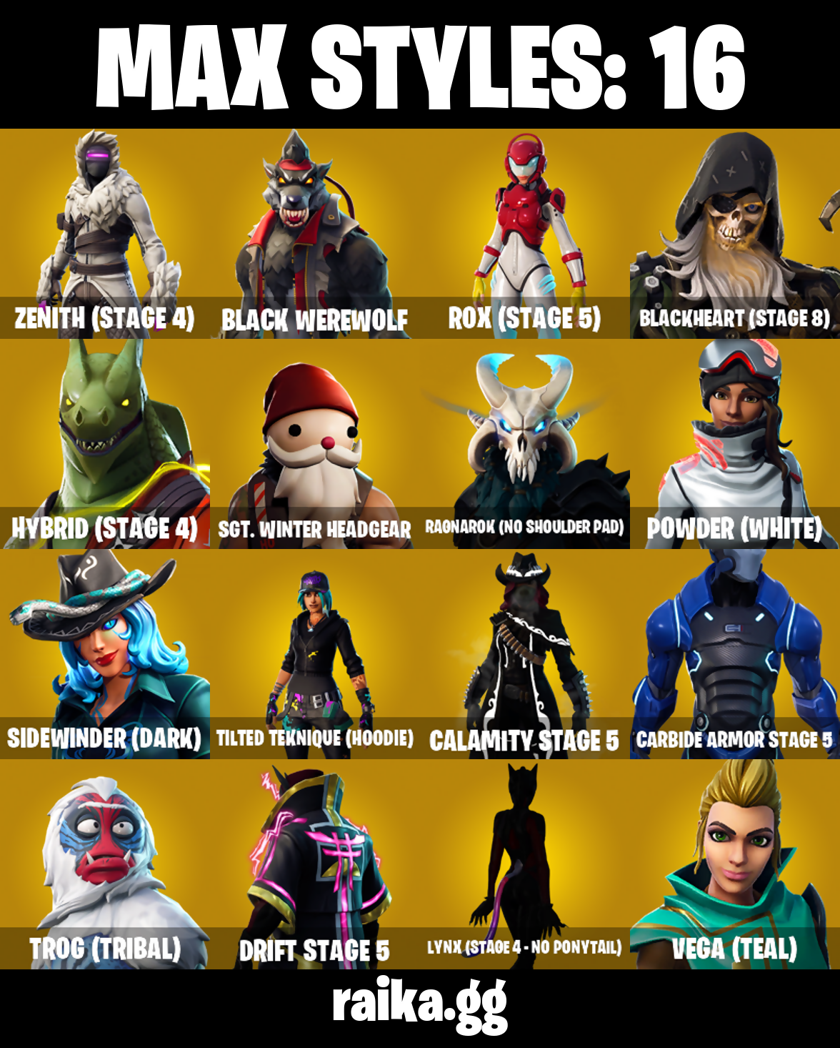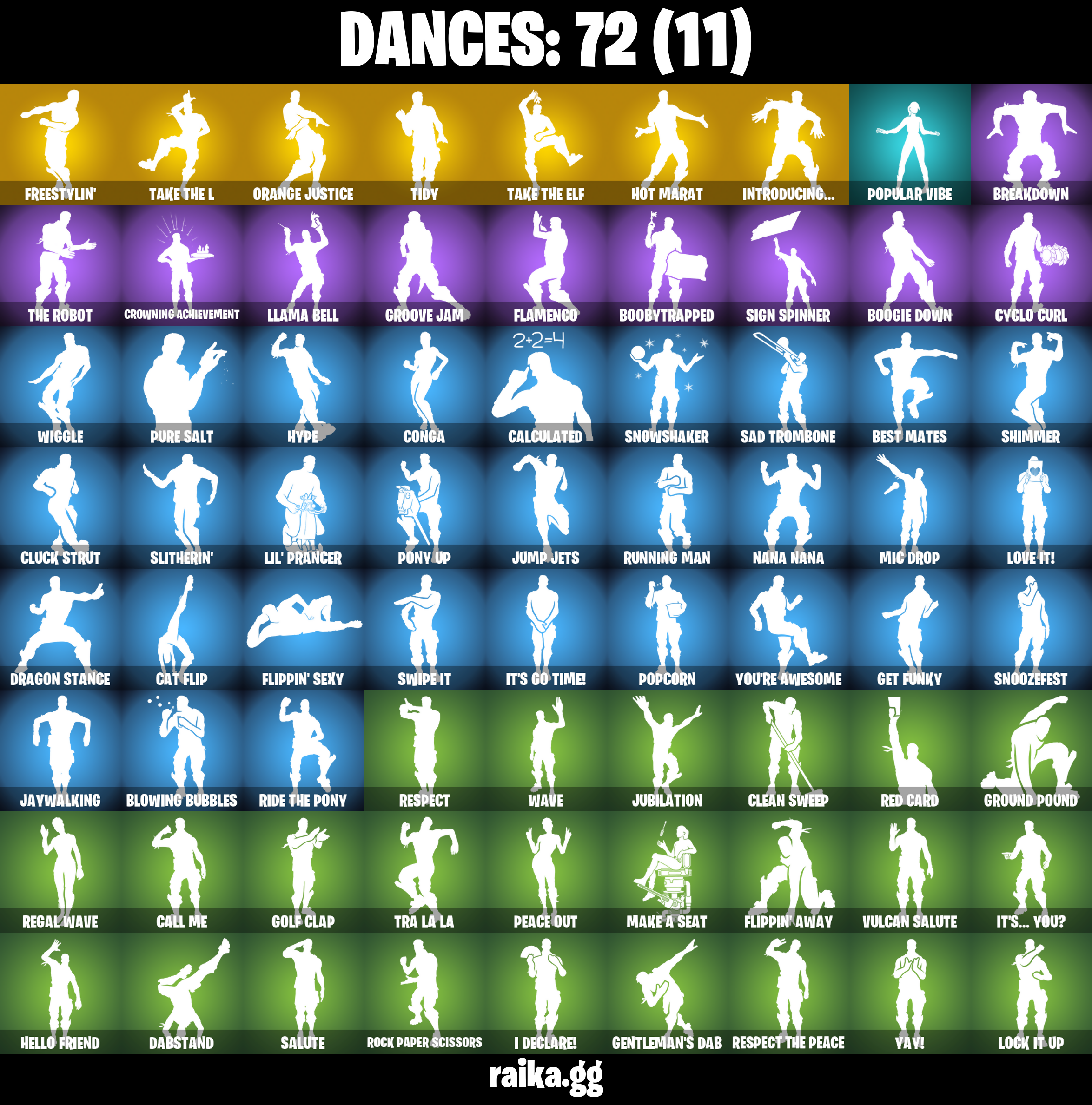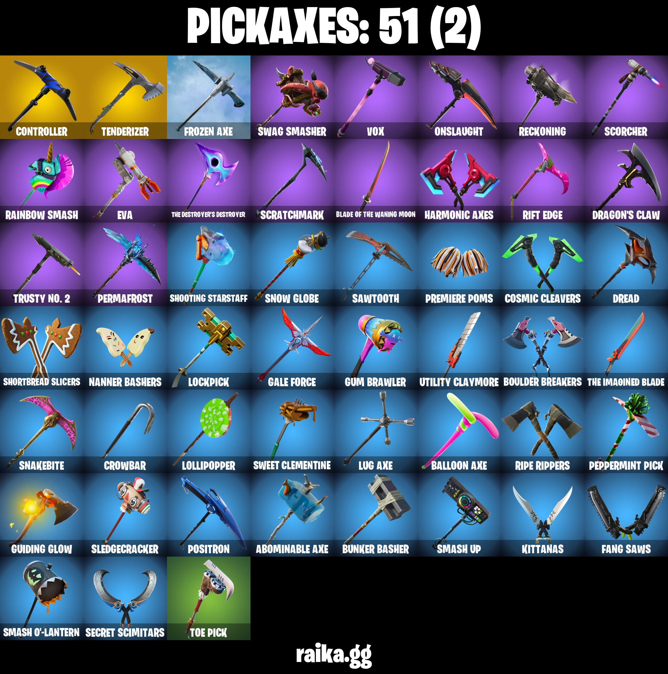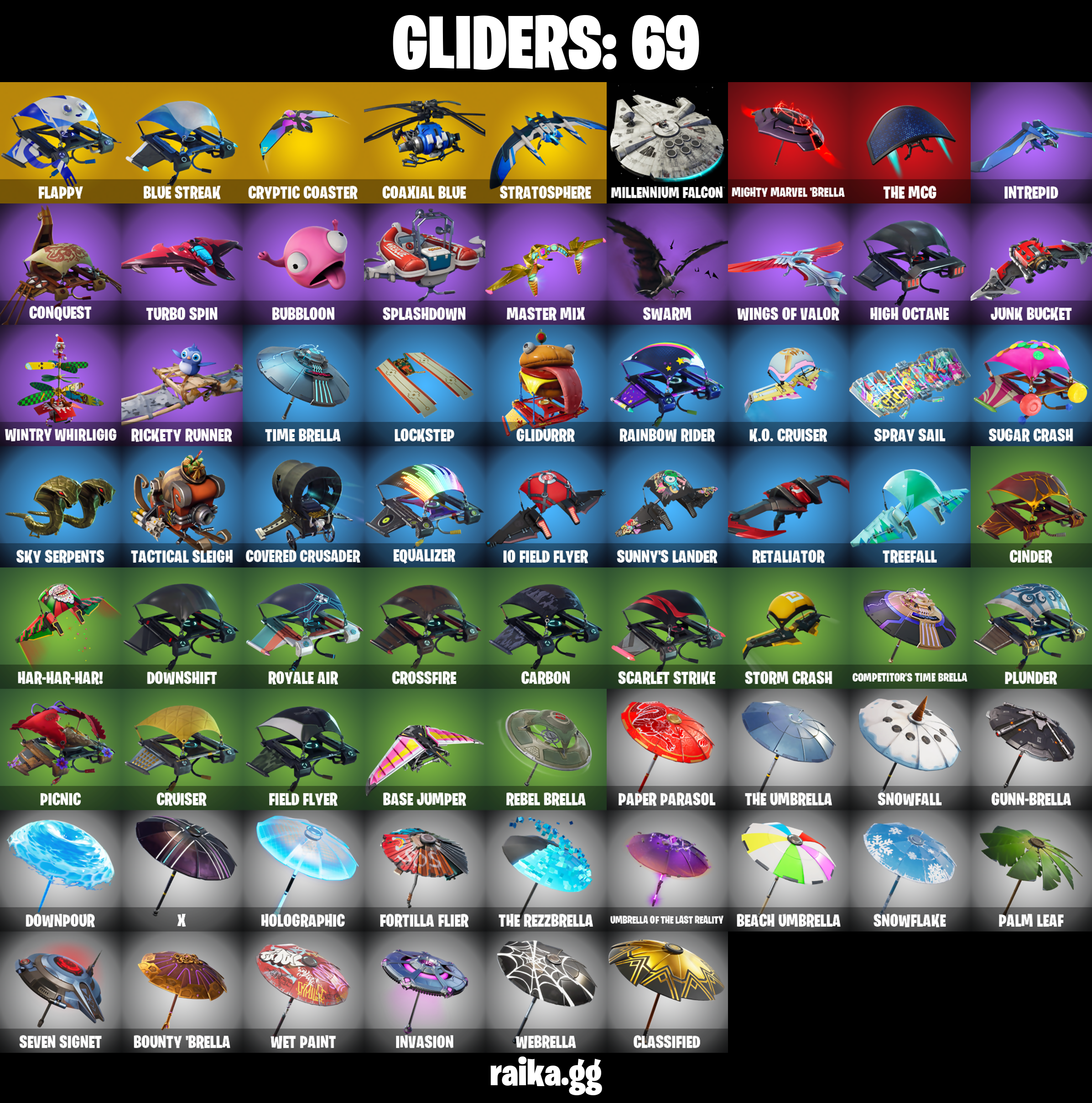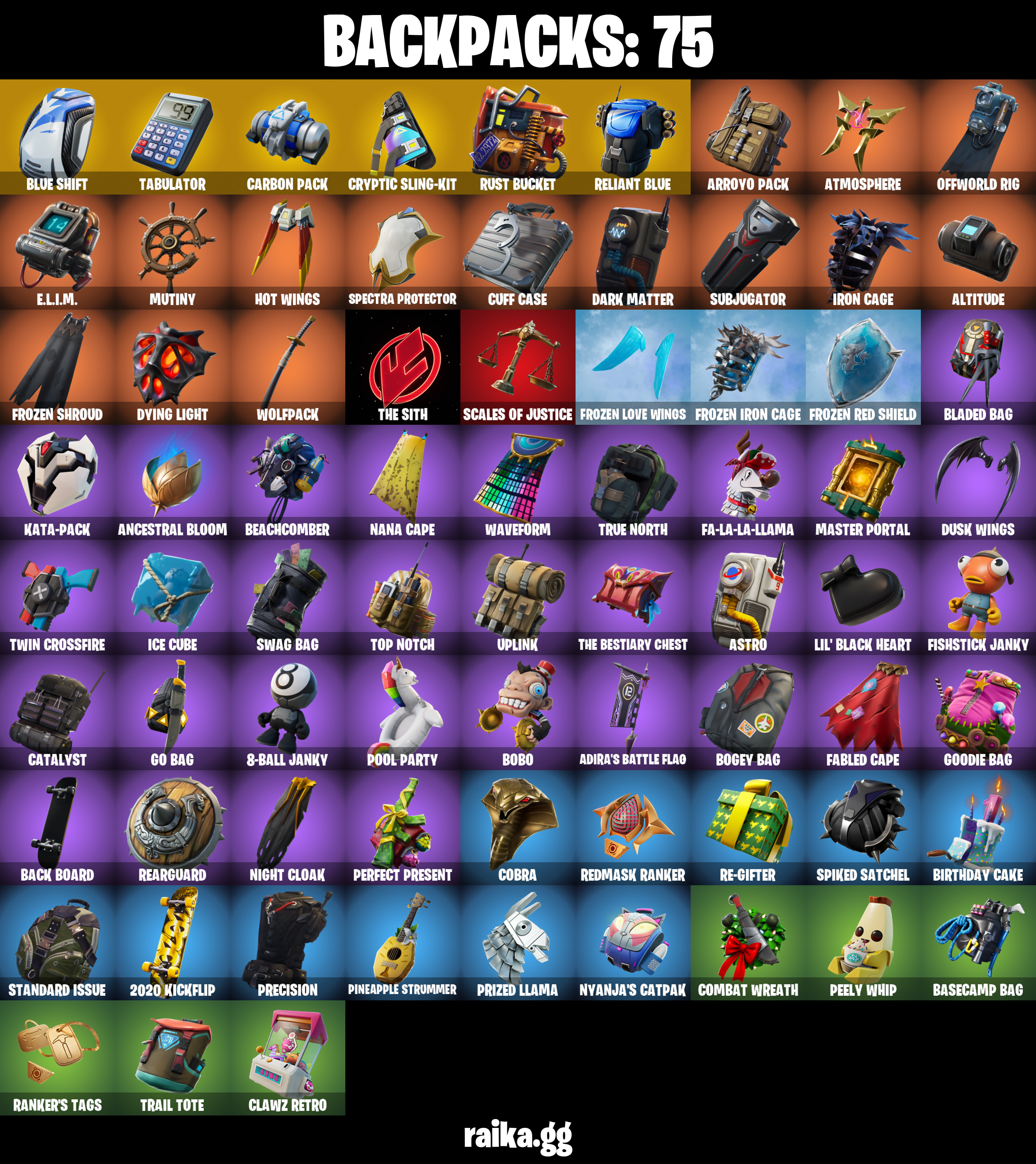 2020 Kickflip, 8-Ball Janky, A.I.M., Abominable Axe, Adira's Battle Flag, Altitude, Ancestral Bloom, Arroyo Pack, Astro, Atmosphere, Back Board, Balloon Axe, Base Jumper, Basecamp Bag, Battlehawk, Beach Umbrella, Beachcomber, Best Mates, Birthday Cake, Black Werewolf, Blackheart, Blackheart (Stage 8), Blade Of The Waning Moon, Bladed Bag, Blowing Bubbles, Blue Shift, Blue Streak, Blue Striker, Blue Team Leader, Bobo, Bogey Bag, Booby Trapped, Boogie Down, Boulder Breakers, Bounty 'Brella, Breakdown, Brite Bomber, Bubbloon, Bunker Basher, Bunker Jonesy, Calamity, Calamity Stage 5, Calculated, Call Me, Carbide, Carbide Armor Stage 5, Carbon, Carbon Commando, Carbon Pack, Cat Flip, Catalyst, Cinder, Classified, Clawz Retro, Clean Sweep, Cluck Strut, Clutch, Coaxial Blue, Cobra, Combat Wreath, Competitor's Time Brella, Conga, Conquest, Controller, Cosmic Cleavers, Covered Crusader, Crossfire, Crowbar, Crowning Achievement, Cruiser, Cryptic Coaster, Cryptic Sling-Kit, Cuff Case, Cyclo Curl, DJ Yonder, Dabstand, Dark Matter, Dark Voyager, Dire, Downpour, Downshift, Dragon Stance, Dragon's Claw, Dread, Drift, Drift Stage 5, Dusk, Dusk Wings, Dying Light, E.L.I.M., Elite Agent, Ember, Enforcer, Equalizer, Eva, Fa-La-La-Llama, Fable, Fabled Cape, Fang Saws, Field Flyer, Fishstick Janky, Flamenco, Flappy, Flippin' Away, Flippin' Sexy, Fortilla Flier, Freestylin', Frozen Axe, Frozen Iron Cage, Frozen Love Ranger, Frozen Love Wings, Frozen Raven, Frozen Red Knight, Frozen Red Shield, Frozen Shroud, Gale Force, Gentleman's Dab, Get Funky, Giddy-Up, Glidurrr, Go Bag, Golf Clap, Goodie Bag, Grind, Groove Jam, Ground Pound, Guiding Glow, Gum Brawler, Gunn-Brella, Har-Har-Har!, Harmonic Axes, Hello Friend, High Octane, Holographic, Hot Marat, Hot Wings, Huntress, Hybrid, Hybrid (Stage 4), Hype, I Declare!, Ice Cube, Intrepid, Introducing..., Invasion, Io Field Flyer, Iron Cage, It's Go Time!, It's... You, Jaywalking, Jubilation, Jump Jets, Junk Bucket, K.O. Cruiser, Kata-Pack, Kittanas, Laguna, Lil' Black Heart, Lil' Prancer, Llama Bell, Lock It Up, Lockpick, Lockstep, Lollipopper, Love It!, Lt. Evergreen, Lug Axe, Lynx, Lynx (Stage 4 - No Ponytail), Make A Seat, Master Mix, Master Portal, Mic Drop, Mighty Marvel 'Brella, Millennium Falcon, Mission Specialist, Moonwalker, Mutiny, Nana Cape, Nana Nana, Nanner Bashers, Night Cloak, Nightshade, Nyanja's Catpak, Offworld Rig, Omega, Onslaught, Orange Justice, Palm Leaf, Paper Parasol, Peace Out, Peely, Peely Whip, Peppermint Pick, Perfect Present, Permafrost, Picnic, Pineapple Strummer, Plunder, Pony Up, Pool Party, Popcorn, Popular Vibe, Positron, Powder, Powder (White), Precision, Premiere Poms, Prized Llama, Prodigy, Pure Salt, Ragnarok, Rainbow Rider, Rainbow Smash, Ranker's Tags, Raonarok (No Shoulder Pad), Raven, Re-Gifter, Rearguard, Rebel Brella, Reckoning, Red Card, Red Strike, Redline, Redmask Ranker, Regal Wave, Reliant Blue, Respect, Respect The Peace, Retaliator, Rickety Runner, Ride The Pony, Rift Edge, Ripe Rippers, Rock Paper Scissors, Rogue Agent, Rook, Rox, Rox (Stage 5), Royale Air, Ruin, Running Man, Rust Bucket, Rust Lord, Sad Trombone, Salute, Sawtooth, Scales Of Justice, Scarlet Strike, Scorcher, Scratchmark, Secret Scimitars, Sentinel, Seven Signet, Sgt. Winter, Sgt. Winter Headgear, Shimmer, Shooting Starstaff, Shortbread Slicers, Sidewinder, Sidewinder (Dark), Sign Spinner, Sky Serpents, Sledgecracker, Sledgehammer, Slitherin', Smash O'-Lantern, Smash Up, Snakebite, Snoozefest, Snorkel Ops, Snow Globe, Snowfall, Snowflake, Snowshaker, Spectra Protector, Spiked Satchel, Splashdown, Spray Sail, Squad Leader, Standard Issue, Storm Crash, Stratosphere, Stratus, Subjugator, Subzero Cryptic, Sugar Crash, Summit Striker, Sun Strider, Sunny's Lander, Swag Bag, Swag Smasher, Swarm, Sweet Clementine, Swipe It, Tabulator, Tactical Sleigh, Take The Elf, Take The L, Teknique, Tenderizer, The Ace, The Bestiary Chest, The Destroyer's Destroyer, The Imagined Blade, The Mcg, The Reaper, The Rezzbrella, The Robot, The Sith, The Umbrella, The Visitor, Tidy, Tilted Teknique, Tilted Teknique (Hoodie), Time Brella, Toe Pick, Top Notch, Tra La La, Trail Tote, Trailblazer, Treefall, Trilogy, Trog, Trog (Tribal), True North, Trusty No. 2, Turbo Spin, Twin Crossfire, Umbrella Of The Last Reality, Uplink, Utility Claymore, Valor, Vega, Vega (Teal), Vox, Vulcan Salute, Wave, Waveform, Webrella, Wet Paint, Wiggle, Wild Card, Wingman, Wings Of Valor, Wintry Whirligig, Wolfpack, Wooly Warrior, X, X-Lord, Yay!, Yond3r, You're Awesome, Zenith, Zenith (Stage 4), Zoey