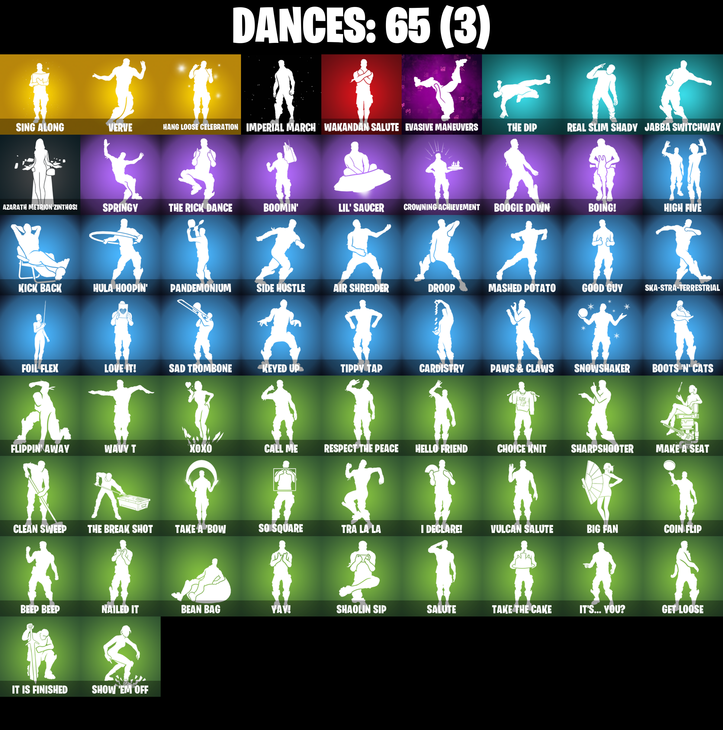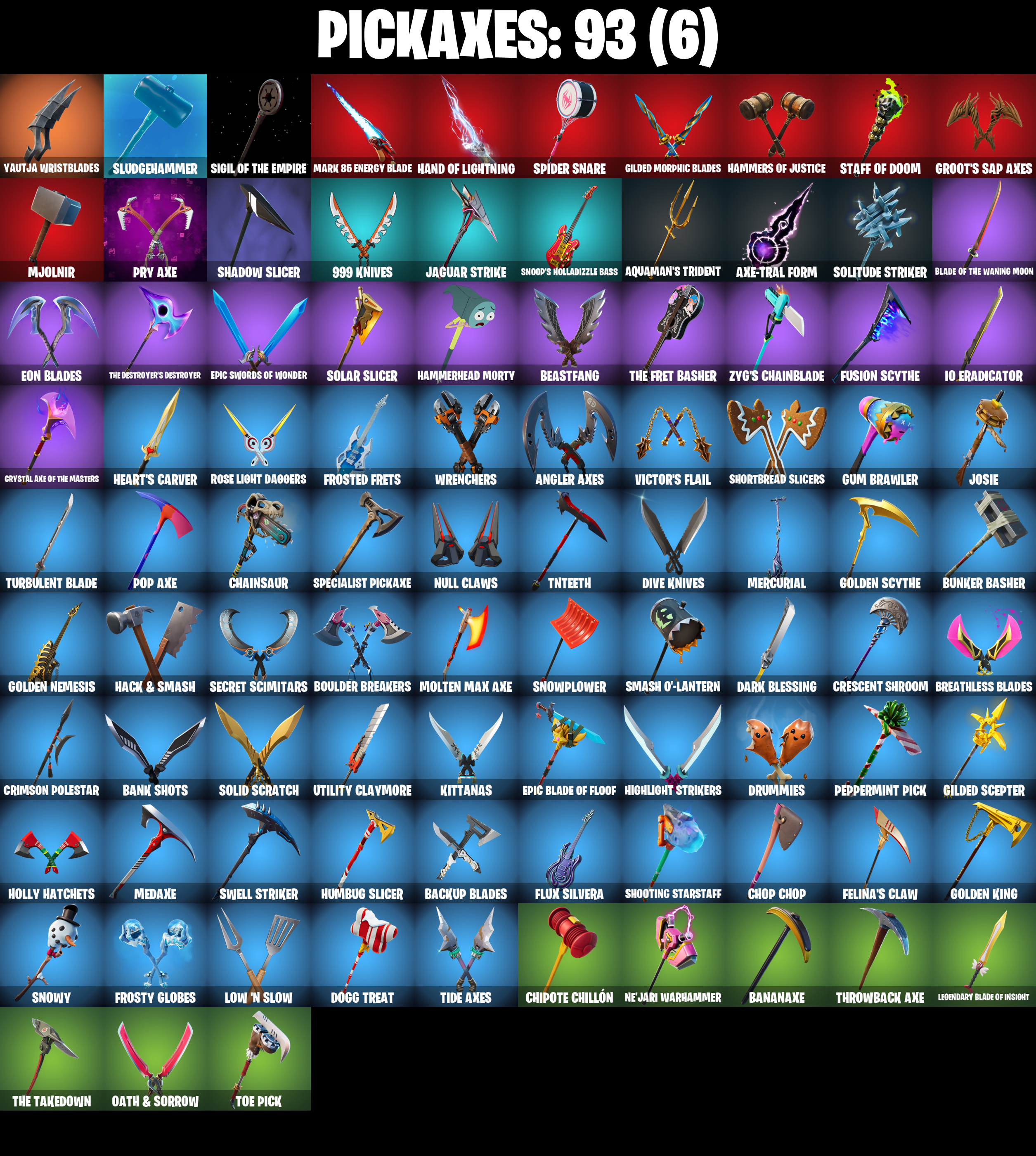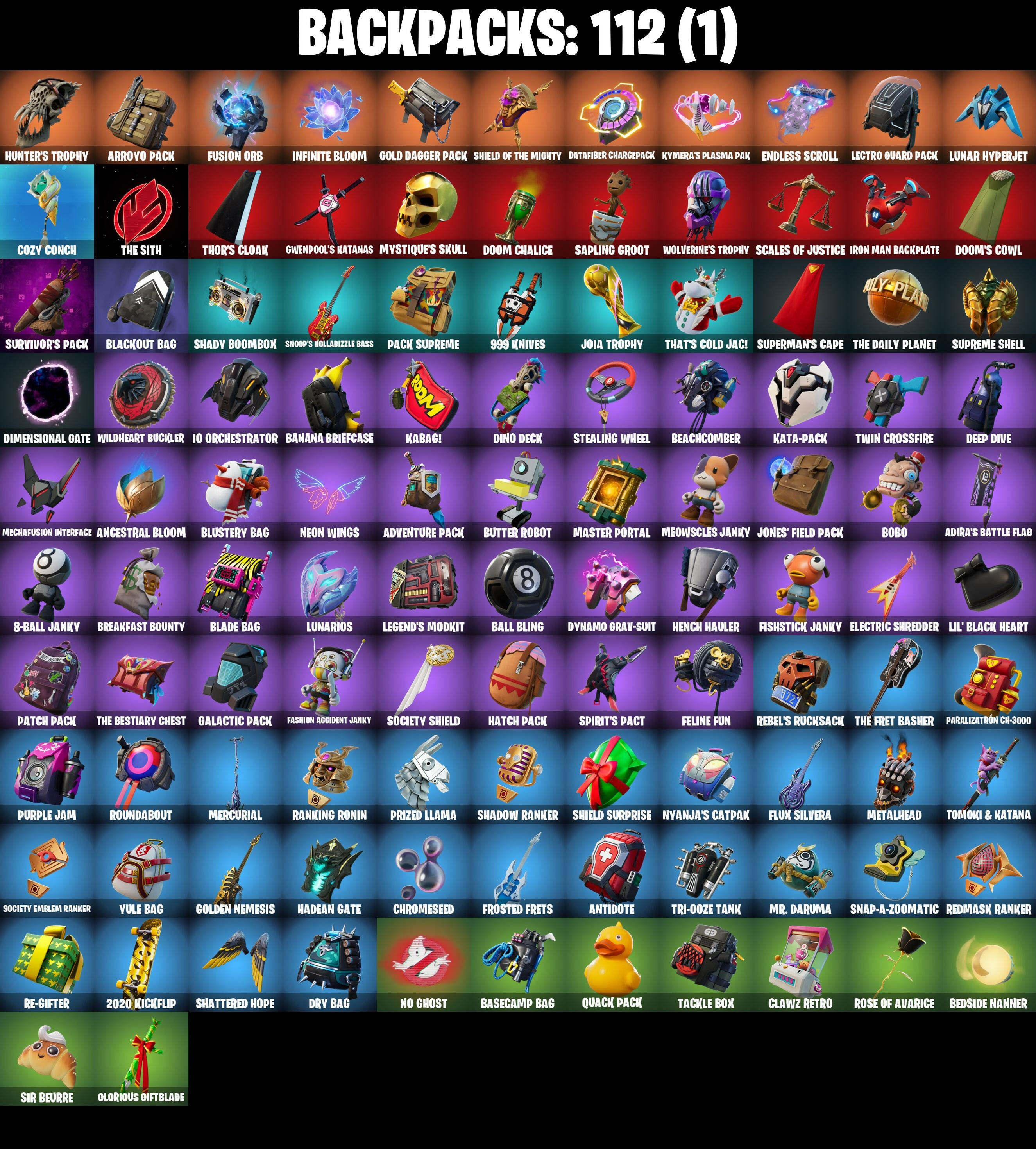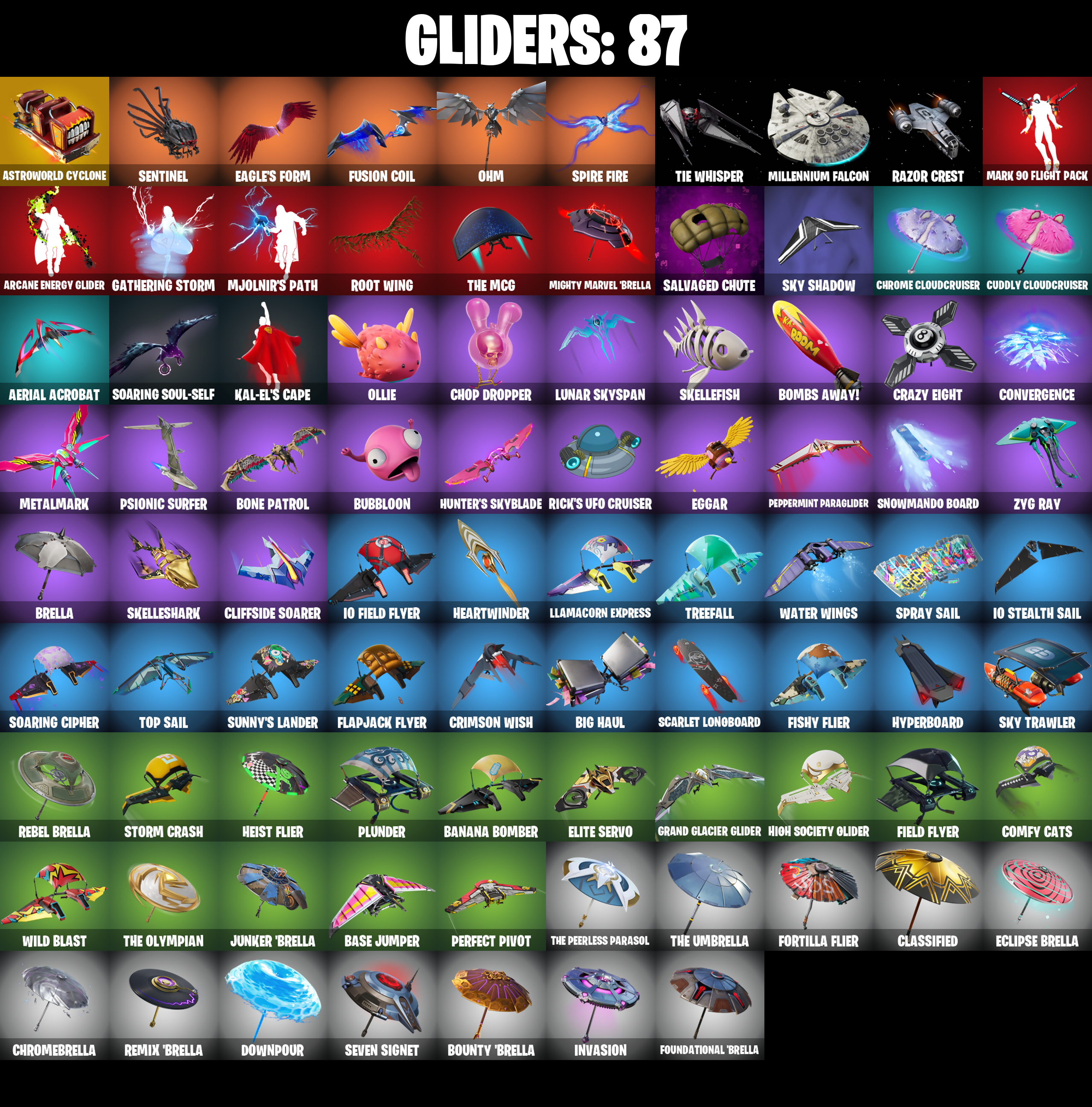 10 Field Flyer, 10 Stealth Sail, 2020 Kickflip, 8-Ball Janky, 8-Ball Vs Scratch, 999 Knives, Adira's Battle Flag, Adventure Pack, Aerial Acrobat, Agent Jones, Agent Jones (Jump 31), Agent Peely, Air Shredder, Ancestral Bloom, Angler Axes, Antidote, Aquaman, Aquaman's Trident, Arcane Energy Glider, Arroyo Pack, Astroworld Cyclone, Axe-tral Form, Azarath Metrion Zinthos!, Backup Blades, Ball Bling, Banana Bomber, Banana Briefcase, Bananaxe, Bank Shots, Base Jumper, Basecamp Bag, Beachcomber, Bean Bag, Beastfang, Bedside Nanner, Beep Beep, Big Fan, Big Haul, Blackout Bag, Blade Bag, Blade of The Waning Moon, Blizzabelle, Blustery Bag, Bobo, Boing!, Bombs Away!, Bone Patrol, Boogie Down, Boomin', Boots 'N' Cats, Boulder Breakers, Bounty 'brella, Breakfast Bounty, Breathless Blades, Brella, Brutus, Bubbloon, Bunker Basher, Butter Robot, Call Me, Cameo Vs Chic, Cardistry, Chainsaur, Chipote Chillón, Choice Knit, Chop Chop, Chop Dropper, Chrome Cloudcruiser, Chromebrella, Chromeseed, Clark Kent, Clark Kent (Superman), Classified, Clawz Retro, Clean Sweep, Cliffside Soarer, Cluck, Cluck (Slurpy), Coin Flip, Comfy Cats, Convergence, Cozy Conch, Crazy Eight, Crescent Shroom, Crimson Polestar, Crimson Wish, Crowning Achievement, Crystal Axe of The Masters, Cuddly Cloudcruiser, D'Ark, Dark Blessing, Datafiber Chargepack, Deadpool, Deadpool Unmasked, Deep Dive, Dimensional Gate, Dino Deck, Dive Knives, Doctor Doom, Doctor Doom (God Emperor), Doctor Slone, Dogg Treat, Doom Chalice, Doom's Cowl, Downpour, Droop, Drummies, Dry Bag, Dynamo Grav-Suit, Eagle's Form, Eclipse Brella, Eggar, El Chapulín Colorado, Electric Shredder, Elite Servo, Endless Scroll, Eon Blades, Epic Blade of Floof, Epic Swords of Wonder, Evasive Maneuvers, Fade, Fashion Accident Janky, Felina, Felina's Claw, Feline Fun, Field Flyer, Fishstick Janky, Fishy Flier, Flapjack Flyer, Flippin' Away, Flux Silvera, Foil Flex, Fortilla Flier, Foundational 'brella, Frosted Frets, Frosty Globes, Fusion, Fusion Coil, Fusion Orb, Fusion Scythe, Galactic Pack, Gathering Storm, Gear Specialist Maya, Get Loose, Gilded Morphic Blades, Gilded Scepter, Glorious Giftblade, Gold Dagger Pack, Gold Midas, Golden King, Golden Nemesis, Golden Scythe, Good Guy, Grand Glacier Glider, Groot, Groot (Silver Foil), Groot's Sap Axes, Guggimon, Gum Brawler, Gwenpool's Katanas, Hack & Smash, Hadean Gate, Hammerhead Morty, Hammers of Justice, Hand of Lightning, Hang Loose Celebration, Hatch Pack, Hazard, Head (Droopy), Heart's Carver, Heartwinder, Heist Flier, Hello Friend, Hench Hauler, High Five, High Society Glider, Highlight Strikers, Holiday Boxy, Holly Hatchets, Hula Hoopin', Humbug Slicer, Hunter's Skyblade, Hunter's Trophy, Hyperboard, I Declare!, IO Eradicator, IO Orchestrator, Imperial March, Infinite Bloom, Invasion, Iris, Iron Man Backplate, It Is Finished, It's... You?, Jabba Switchway, Jaguar Strike, Jennifer Walters, Joey, Joia Trophy, Jones' Field Pack, Josie, Journey Vs Hazard, Jules, Junker 'brella, Kabag!, Kal-El's Cape, Kata-Pack, Keyed Up, Kick Back, Kit, Kittanas, Komplex, Kondor, Krisabelle, Kymera, Kymera's Plasma Pak, Lara Croft, Lectro Guard Pack, Legend's Modkit, Legendary Blade of Insight, Lexa, Lexa (Warstrike), Lil' Black Heart, Lil' Saucer, Llamacorn Express, Love It!, Low 'n Slow, Lt. Evergreen, Lunar Hyperjet, Lunar Skyspan, Lunarios, Make A Seat, Mancake, Mandalorian, Mark 85 Energy Blade, Mark 90 Flight Pack, Mashed Potato, Masked, Master Portal, Mave, Mave (Reactive Hair Off), Mechafusion Interface, Medaxe, Menace, Menace (Challenger Menace - Flame), Meowscles, Meowscles Janky, Mercurial, Metalhead, Metalmarek, Mighty Marvel 'brella, Millennium Falcon, Mjolnir, Mjolnir's Path, Molten Max Axe, Mr. Daruma, Mystique, Mystique's Skull, Nailed It, Ne'jari Warhammer, Neon Wings, Neymar Jr, Neymar Jr (Exhibition), No Ghost, Nog Ops, Null Claws, Nyanja's Catpak, Oath & Sorrow, Ocean, Ohm, Ollie, Pack Supreme, Pandemonium, Paralizatron CH-3000, Patch Pack, Paws & Claws, Peppermint Paraglider, Peppermint Pick, Perfect Pivot, Plunder, Polar Peely, Pop Axe, Predator, Prized Llama, Pry Axe, Psionic Surfer, Purple Jam, Quack Pack, Ranking Ronin, Raz, Razor Crest, Re-Gifter, Real Slim Shady, Rebel Brella, Rebel's Rucksack, Rebirth Raven, Redmask Ranker, Reese, Remedy (Purple), Remedy Vs Toxin, Remix 'brella, Respect The Peace, Rick Sanchez, Rick's UFO Cruiser, Rippley Vs Sludge, Riptide, Root Wing, Rose Light Daggers, Rose of Avarice, Roundabout, Ruby Shadows, Sad Trombone, Salute, Salvaged Chute, Sandstone Joey, Santa Dogg, Sapling Groot, Scales of Justice, Scarlet Longboard, Scratch (Virus), Scuba Jonesy, Secret Scimitars, Sentinel, Seven Signet, Shadow Ranker, Shadow Slicer, Shady Boombox, Shaolin Sip, Sharpshooter, Shattered Hope, Shield Surprise, Shield of the Mighty, Shooting Starstaff, Shortbread Slicers, Show 'Em Off, Side Hustle, Sigil of The Empire, Sing Along, Sir Beurre, Ska-Stra-Terrestrial, Skellefish, Skelleshark, Sky Shadow, Sky Trawler, Skye, Slayer Juice Wrld, Slim Shady, Sludgehammer, Smash O'-Lantern, Snap-A-Zoomatic, Snoop's Holladizzle Bass, Snowmando, Snowmando Board, Snowplower, Snowshaker, Snowy, So Square, Soaring Cipher, Soaring Soul-Self, Society Emblem Ranker, Society Shield, Solar Slicer, Solid Scratch, Solitude Striker, Sorana, Sorana (Grey), Specialist Pickaxe, Spider Snare, Spire Fire, Spirit's Pact, Spray Sail, Springy, Staff of Doom, Stash'd, Stealing Wheel, Storm, Storm Crash, Sunny, Sunny’s Lander, Superman's Cape, Supreme Shell, Survivor's Pack, Swell Striker, TNTeeth, Tackle Box, Take A 'Bow, Take The Cake, Tarana, Tarana (X-Tinction Armor), That's Cold Jac!, The Bestiary Chest, The Break Shot, The Daily Planet, The Destroyer's Destroyer, The Dip, The Fret Basher, The Mcg, The Olympian, The Peerless Parasol, The Rick Dance, The Sith, The Takedown, The Umbrella, Thor, Thor (Silver Foil), Thor's Cloak, Throwback Axe, Tide Axes, Tie Whisper, Tippy Tap, Tntina, Toe Pick, Tomoki & Katana, Tony Stark, Top Sail