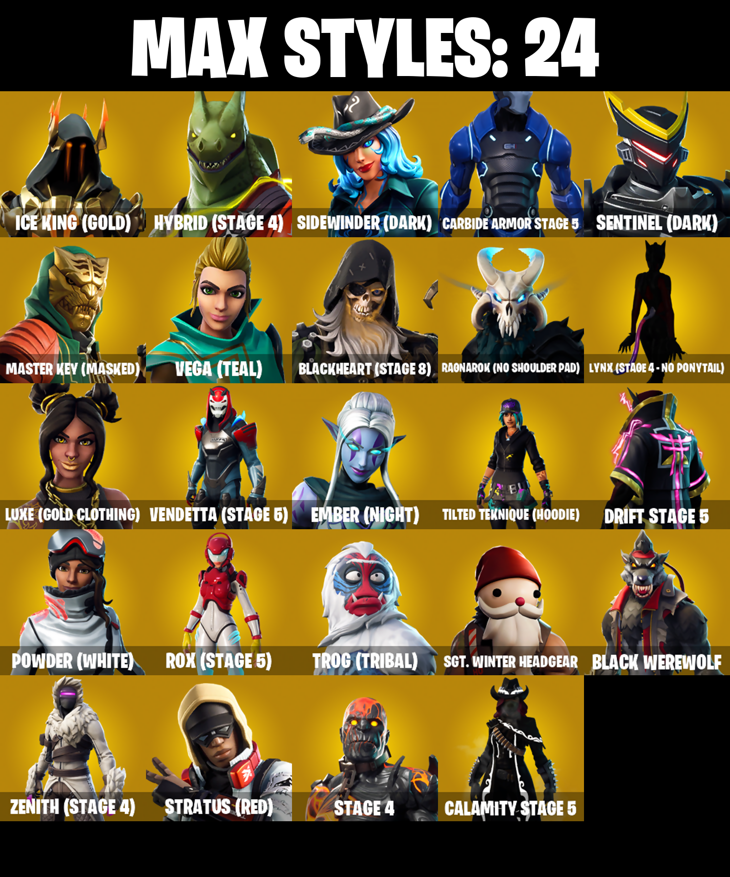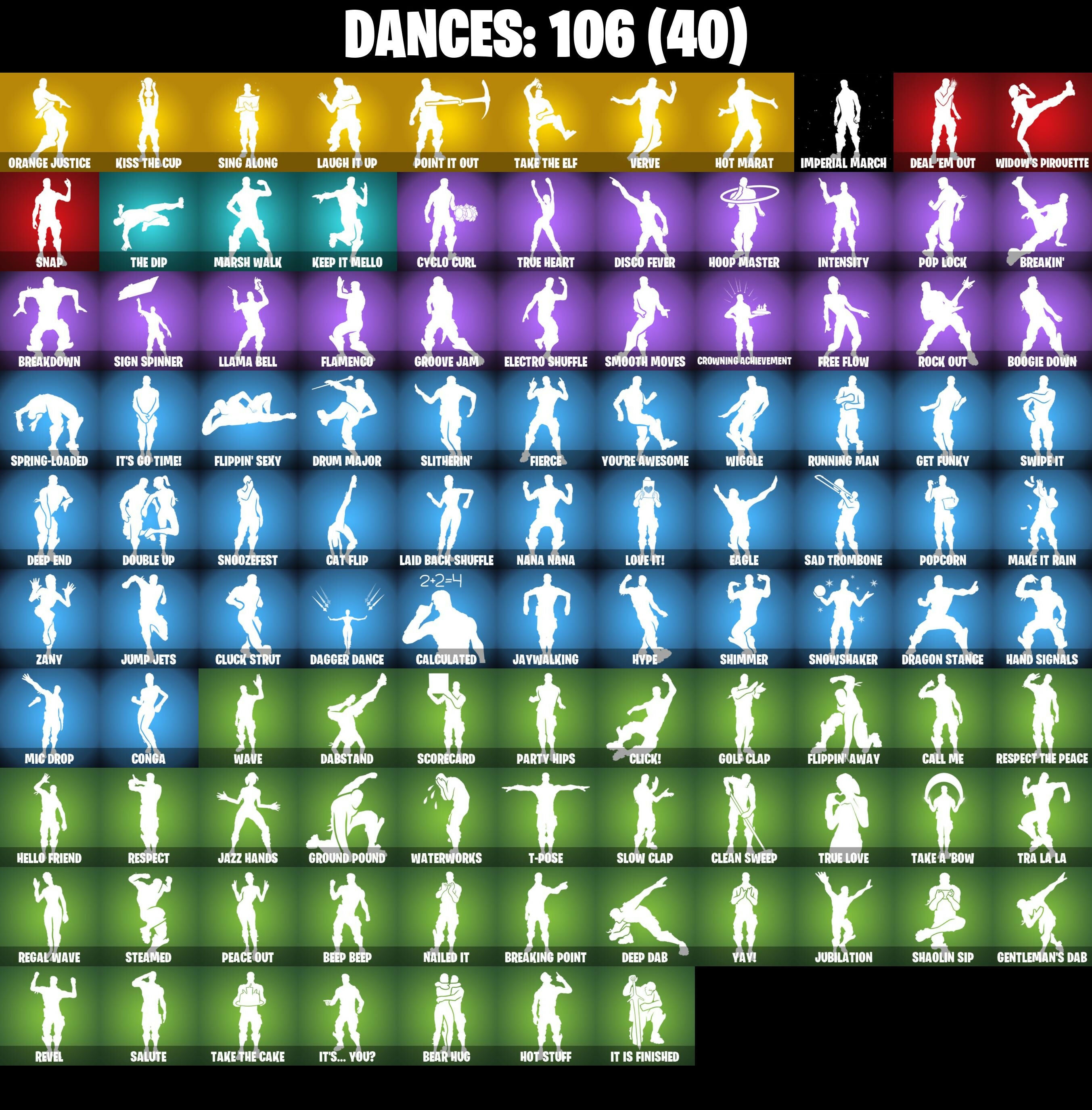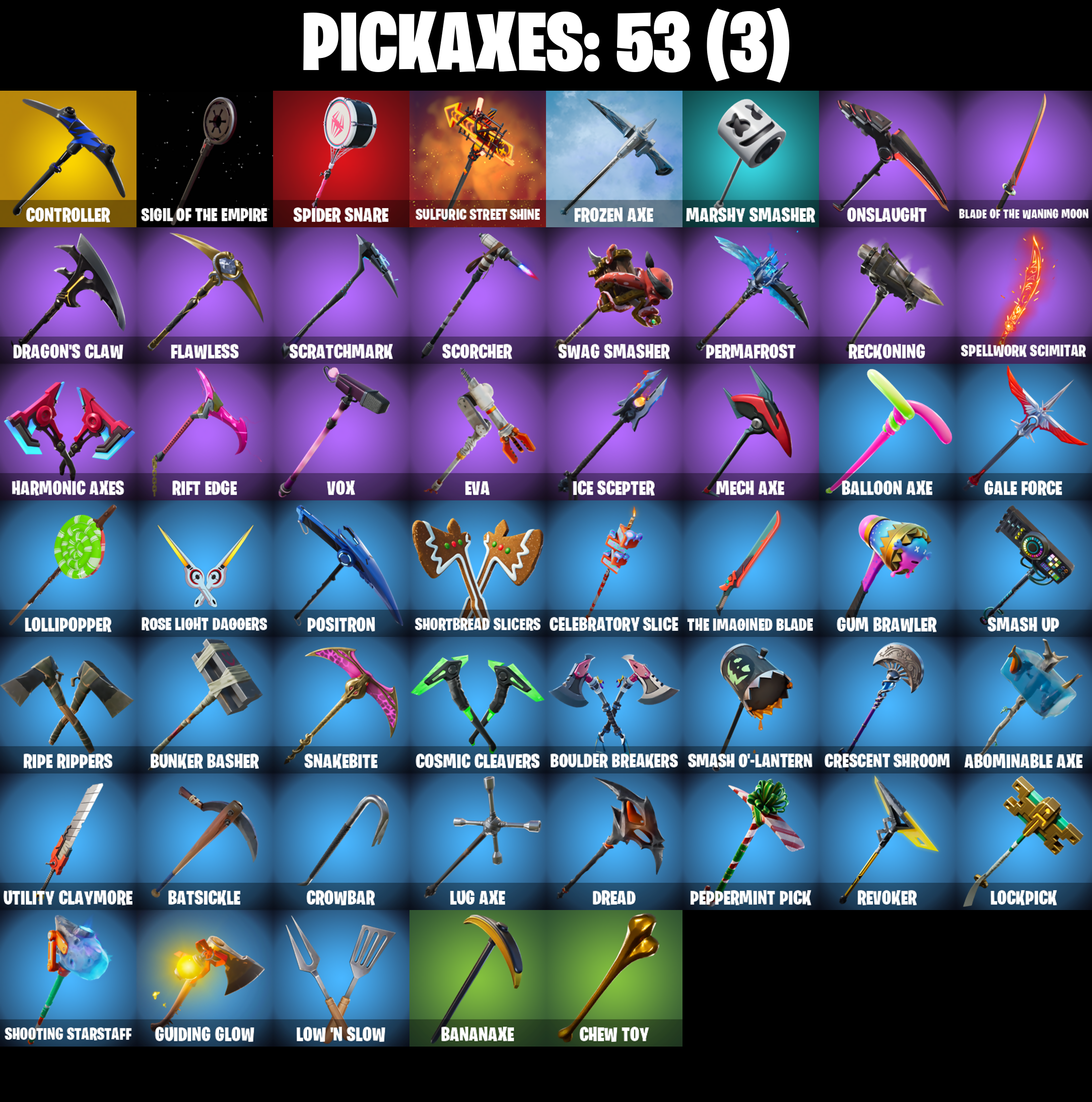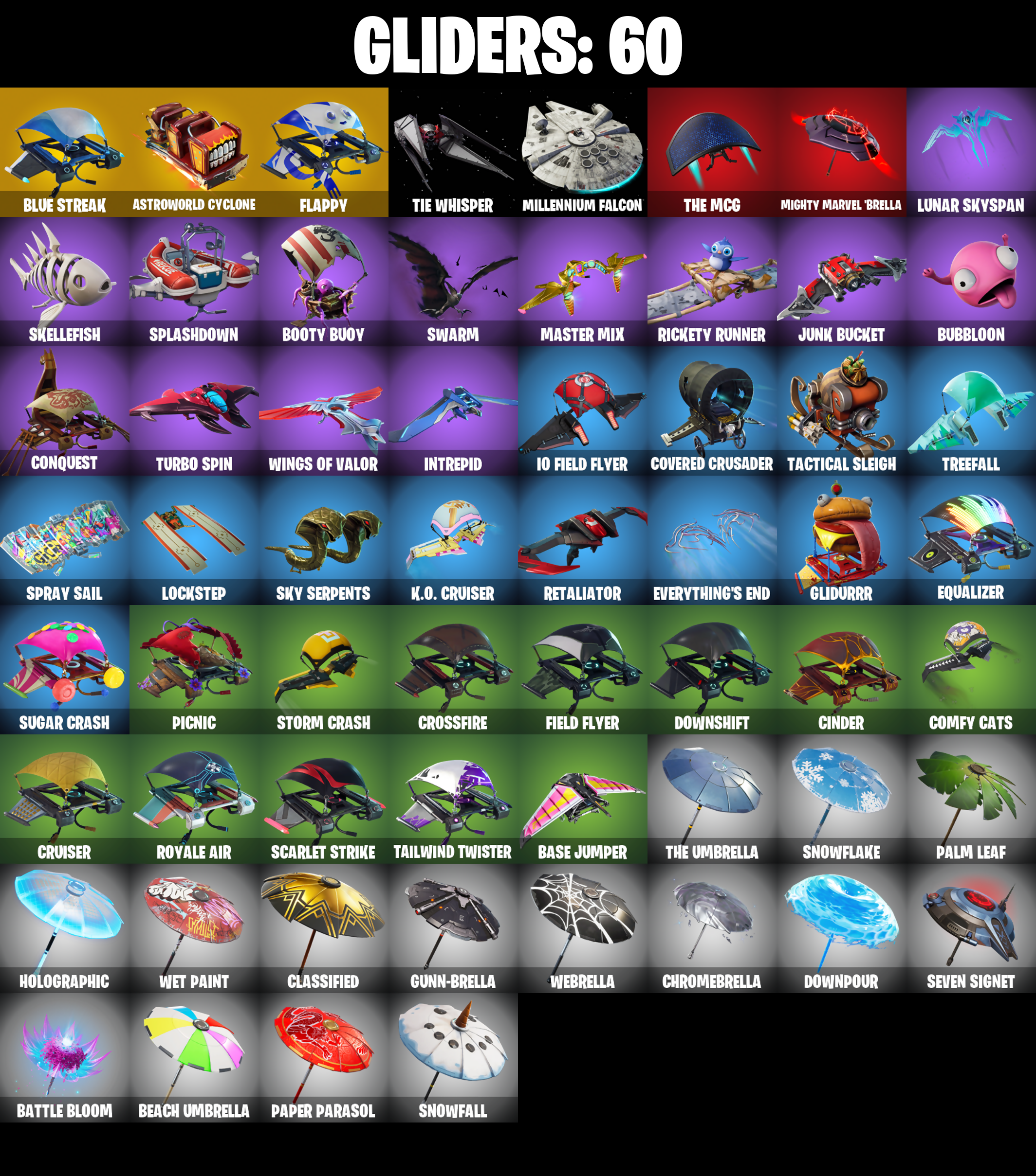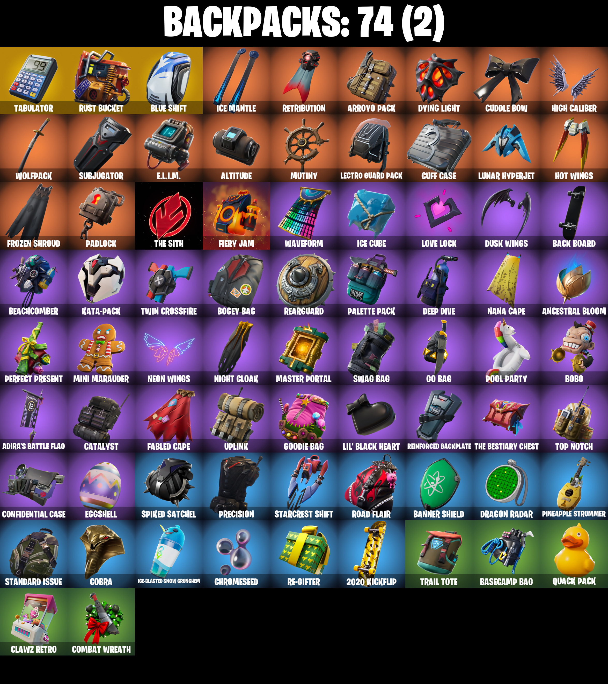 2020 Kickflip, A.I.M., Abominable Axe, Adira's Battle Flag, Altitude, Ancestral Bloom, Arroyo Pack, Astroworld Cyclone, Back Board, Balloon Axe, Bananaxe, Banner Shield, Base Jumper, Basecamp Bag, Batsickle, Battle Bloom, Battlehawk, Beach Umbrella, Beachcomber, Bear Hug, Beep Beep, Black Werewolf, Blackheart, Blackheart (Stage 8), Blade Of The Waning Moon, Blue Shift, Blue Streak, Blue Striker, Blue Team Leader, Bobo, Bogey Bag, Boogie Down, Booty Buoy, Boulder Breakers, Breakdown, Breakin', Breaking Point, Brite Bomber, Bubbloon, Bullseye, Bunker Basher, Bunker Jonesy, Bunny Brawler, Calamity, Calamity Stage 5, Calculated, Call Me, Carbide, Carbide Armor Stage 5, Cat Flip, Catalyst, Celebratory Slice, Chew Toy, Chopper, Chromebrella, Chromeseed, Cinder, Classified, Clawz Retro, Clean Sweep, Click!, Cluck Strut, Cobalt, Cobra, Combat Wreath, Comfy Cats, Confidential Case, Conga, Conquest, Controller, Cosmic Cleavers, Covered Crusader, Crescent Shroom, Crossfire, Crowbar, Crowning Achievement, Cruiser, Cuddle Bow, Cuddle Team Leader, Cuff Case, Cyclo Curl, DJ Yonder, Dabstand, Dagger Dance, Deal 'Em Out, Deep Dab, Deep Dive, Deep End, Demi, Dire, Disco Fever, Double Up, Downpour, Downshift, Dragon Radar, Dragon Stance, Dragon's Claw, Dread, Drift, Drift Stage 5, Drum Major, Dusk, Dusk Wings, Dying Light, E.L.I.M., Eagle, Eggshell, Electro Shuffle, Ember, Ember (Night), Enforcer, Equalizer, Eva, Everything's End, Fable, Fabled Cape, Field Flyer, Fierce, Fiery Jam, Finesse Finisher, Flamenco, Flappy, Flawless, Flippin' Away, Flippin' Sexy, Free Flow, Frozen Axe, Frozen Shroud, Gale Force, Gentleman's Dab, Get Funky, Giddy-Up, Glidurrr, Go Bag, Golf Clap, Goodie Bag, Groove Jam, Ground Pound, Guiding Glow, Gum Brawler, Gumshoe, Gunn-brella, Hand Signals, Harmonic Axes, Hello Friend, High Caliber, Holographic, Hoop Master, Hot Marat, Hot Stuff, Hot Wings, Huntress, Hybrid, Hybrid (Stage 4), Hype, Ice Cube, Ice King (Gold), Ice Mantle, Ice Scepter, Ice-Blasted Snow Crunchem, Imperial March, Intensity, Intrepid, Io Field Flyer, It Is Finished, It's Go Time!, It's... You?, Jaywalking, Jazz Hands, Jubilation, Jump-Jets, Junk Bucket, K.O. Cruiser, Kata-Pack, Keep It Mello, Kiss The Cup, Laguna, Laid Back Shuffle, Laugh It Up, Lectro Guard Pack, Lil' Black Heart, Llama Bell, Lockpick, Lockstep, Lollipopper, Love It!, Love Lock, Low 'N Slow, Lt. Evergreen, Lug Axe, Lunar Hyperjet, Lunar Skyspan, Luxe, Luxe (Gold Clothing), Lynx, Lynx (Stage 4 - No Ponytail), Make It Rain, Marsh Walk, Marshmello, Marshy Smasher, Master Key, Master Key (Masked), Master Mix, Master Portal, Mech Axe, Merry Marauder, Mic Drop, Mighty Marvel 'brella, Millennium Falcon, Mini Marauder, Mutiny, Nailed It, Nana Cape, Nana Nana, Neon Wings, Night Cloak, Nightshade, Nog Ops, Omega, Onesie, Onslaught, Orange Justice, Padlock, Palette Pack, Palm Leaf, Paper Parasol, Party Hips, Peace Out, Peely, Peppermint Pick, Perfect Present, Permafrost, Picnic, Pineapple Strummer, Point It Out, Pool Party, Pop Lock, Popcorn, Positron, Powder, Powder (White), Precision, Prodigy, Quack Pack, Ragnarok, Raonarok (No Shoulder Pad), Re-Gifter, Rearguard, Reckoning, Red-Nosed Raider, Redline, Regal Wave, Reinforced Backplate, Respect, Respect The Peace, Retaliator, Retribution, Revel, Revoker, Rickety Runner, Rift Edge, Ripe Rippers, Road Flair, Rock Out, Rogue Agent, Rook, Rose Light Daggers, Rox, Rox (Stage 5), Royale Air, Ruin, Running Man, Rust Bucket, Sad Trombone, Salute, Scarlet Strike, Scorcher, Scorecard, Scratchmark, Sentinel, Sentinel (Dark), Seven Signet, Sgt. Winter, Sgt. Winter Headgear, Shaolin Sip, Shimmer, Shooting Starstaff, Shortbread Slicers, Sidewinder, Sidewinder (Dark), Sigil Of The Empire, Sign Spinner, Sing Along, Skellefish, Sky Serpents, Sledgehammer, Slitherin', Slow Clap, Smash O'-Lantern, Smash Up, Smooth Moves, Snakebite, Snap, Snoozefest, Snowfall, Snowflake, Snowshaker, Spellwork Scimitar, Spider Snare, Spiked Satchel, Splashdown, Spray Sail, Spring-Loaded, Squad Leader, Stage 4, Standard Issue, Starcrest Shift, Steamed, Storm Crash, Stratus, Stratus (Red), Subjugator, Sugar Crash, Sulfuric Street Shine, Summit Striker, Sun Strider, Swag Bag, Swag Smasher, Swarm, Swipe It, T-Pose, Tabulator, Tactical Sleigh, Tailwind Twister, Take A 'Bow, Take The Cake, Take The Elf, Tectonic Komplex, Teknique, The Ace, The Bestiary Chest, The Dip, The Ice King, The Imagined Blade, The Mcg, The Prisoner, The Sith, The Umbrella, Tie Whisper, Tilted Teknique, Tilted Teknique (Hoodie), Top Notch, Tra La La, Trail Tote, Treefall, Trog, Trog (Tribal), True Heart, True Love, Turbo Spin, Twin Crossfire, Uplink, Utility Claymore, Valor, Vega, Vega (Teal), Vendetta, Vendetta (Stage 6), Verge, Verve, Vox, Waterworks, Wave, Waveform, Webrella, Wet Paint, Widow's Pirouette, Wiggle, Wild Card, Wilde, Wingman, Wings Of Valor, Wolfpack, Wooly Warrior, X-Lord, Yay!, You're Awesome, Zany, Zenith, Zenith (Stage 4), Zoey