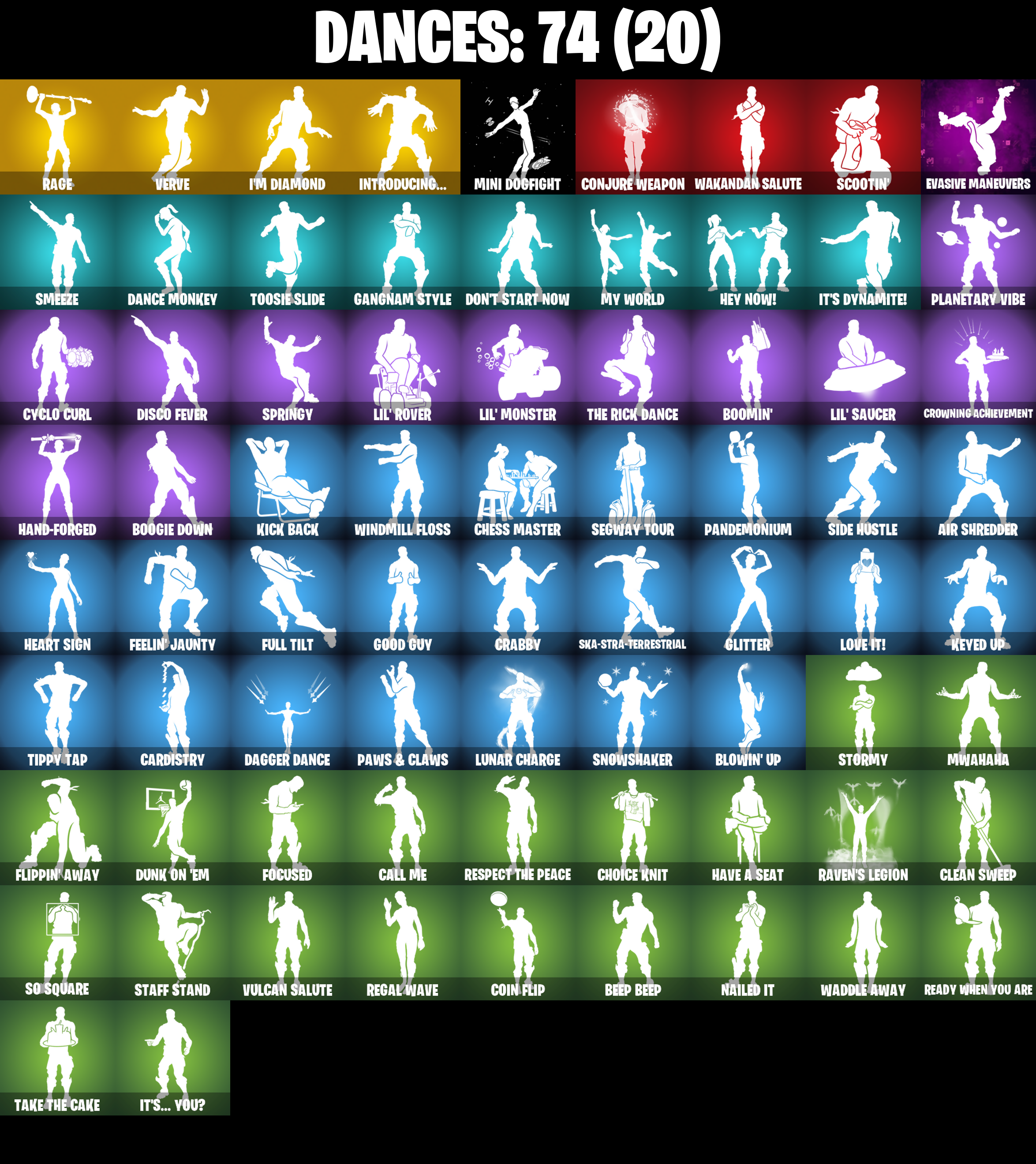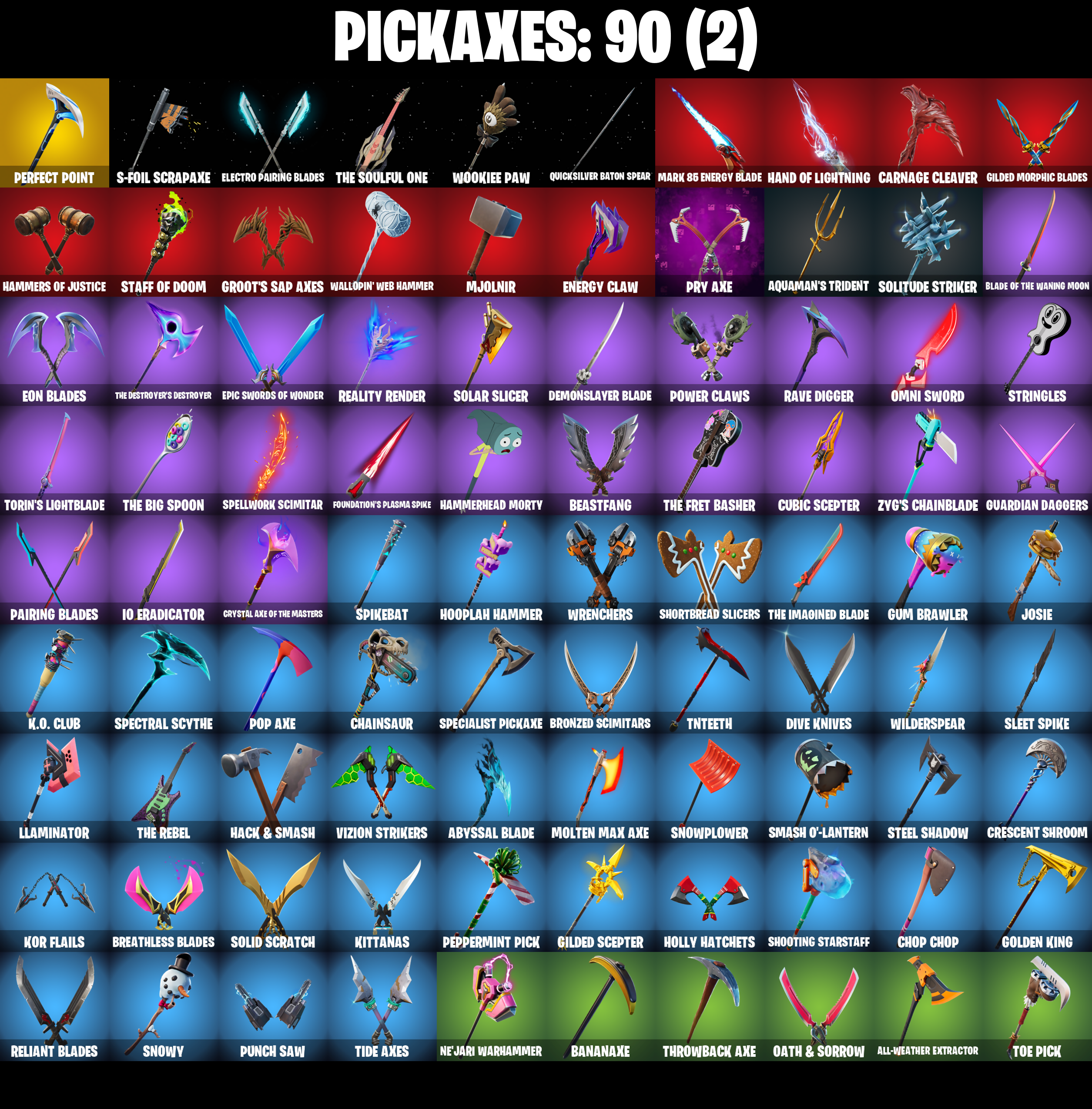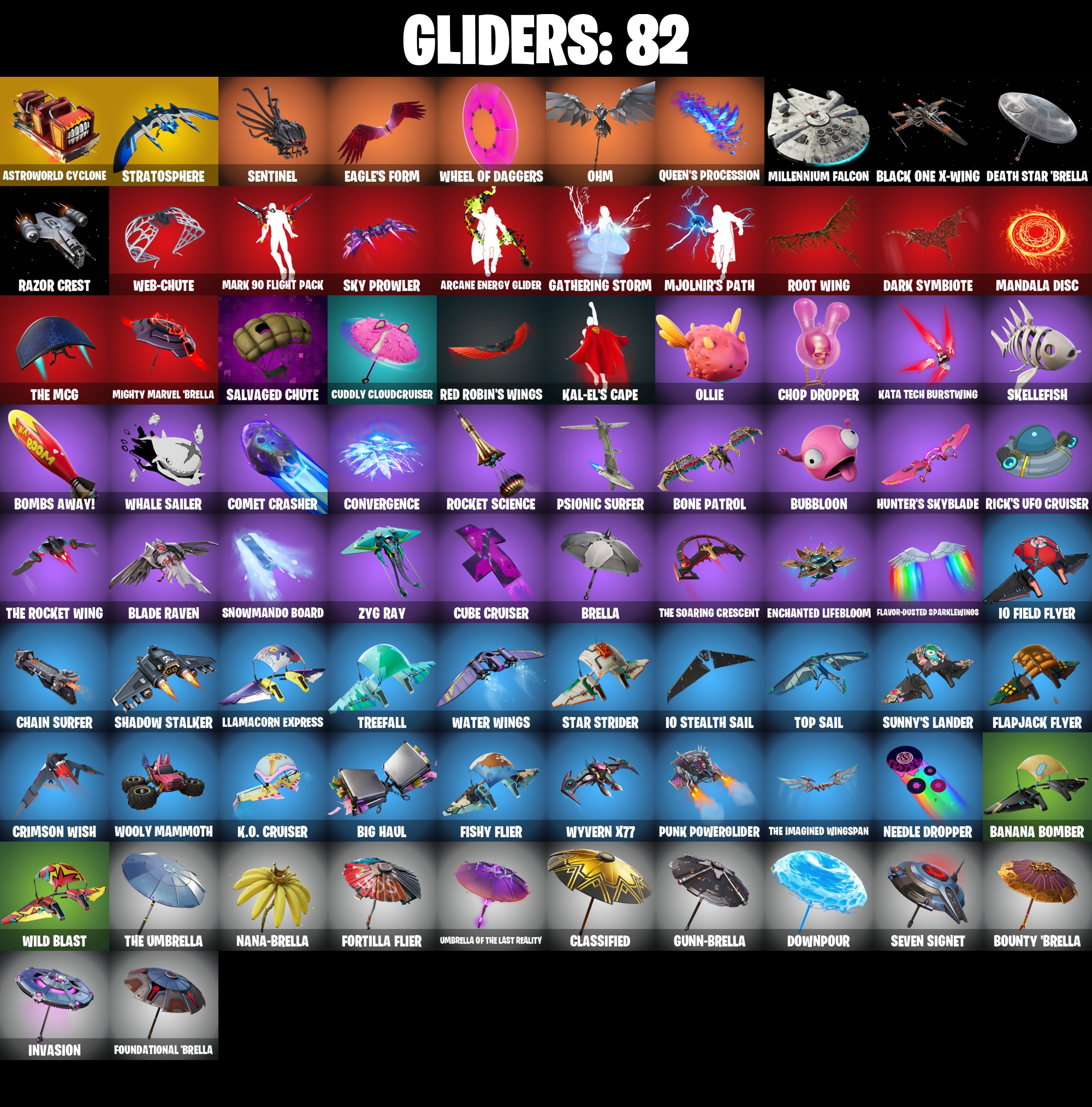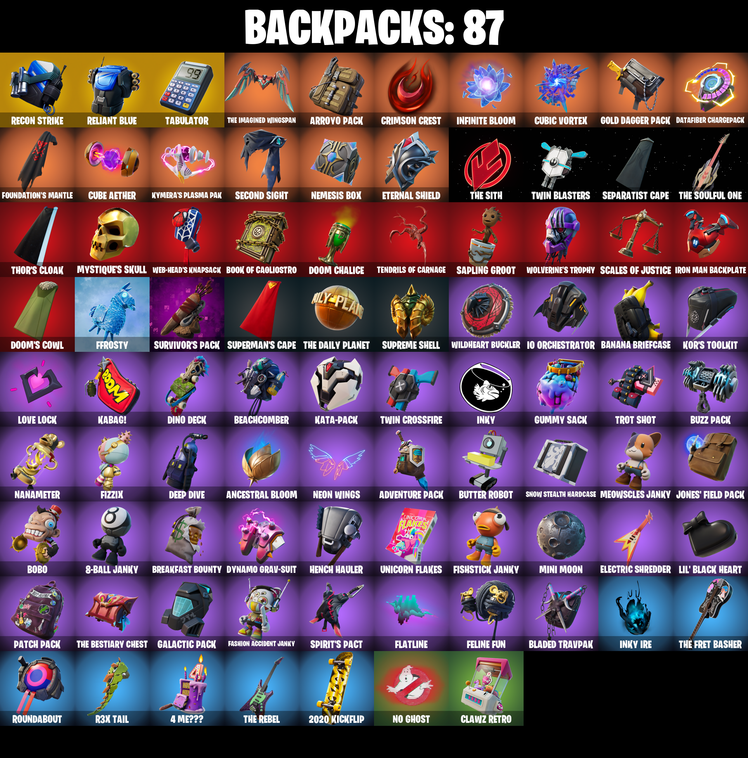 2020 Kickflip, 4 Me???, 8-Ball Janky, Absenz, Abyssal Blade, Adventure Pack, Aftermath, Agent Jones, Agent Peely, Air Shredder, All-Weather Extractor, Ancestral Bloom, Aquaman, Aquaman's Trident, Arcane Energy Glider, Arroyo Pack, Arthur Curry, Astroworld Cyclone, Banana Bomber, Banana Briefcase, Bananaxe, Beachcomber, Beastfang, Beep Beep, Big Haul, Black, Black One X-Wing, Blade Raven, Blade of the Waning Moon, Bladed Travpak, Blowin' Up, Bobo, Bombs Away!, Bone Patrol, Boogie Down, Book of Caoliostro, Boomin', Bounty 'Brella, Breakfast Bounty, Breathless Blades, Brella, Bronzed Scimitars, Bubbloon, Butter Robot, Buzz Pack, Call Me, Cardistry, Carnage, Carnage (Maximum), Carnage Cleaver, Chain Surfer, Chainsaur, Charlotte, Charlotte (Golden Rune), Chess Master, Choice Knit, Chop Chop, Chop Dropper, Clark Kent, Clark Kent (Superman), Classified, Clawz Retro, Clean Sweep, Coin Flip, Comet Crasher, Conjure Weapon, Convergence, Crabby, Crescent Shroom, Crimson Crest, Crimson Wish, Crowning Achievement, Crystal Axe of the Masters, Cube Aether, Cube Cruiser, Cubic Scepter, Cubic Vortex, Cuddly Cloudcruiser, Cyclo Curl, Dagger Dance, Dance Monkey, Dark Symbiote, Datafiber Chargepack, Deadeye, Deadpool, Deadpool Unmasked, Death Star 'Brella, Deep Dive, Demonslayer Blade, Dino Deck, Disco Fever, Dive Knives, Doctor Doom, Doctor Doom (God Emperor), Doctor Slone, Doctor Strange, Don't Start Now, Doom Chalice, Doom's Cowl, Downpour, Dunk On 'Em, Dynamo Grav-Suit, Eagle's Form, Electric Shredder, Electro Pairing Blades, Enchanted Lifebloom, Energy Claw, Eon Blades, Epic Swords of Wonder, Erisa, Erisa (Stealth Silver), Eternal Knight, Eternal Shield, Evasive Maneuvers, Evie, Fabio Sparklemane, Fabio Sparklemane (Golden Rune), Fade, Fashion Accident Janky, Feelin' Jaunty, Feline Fun, Ffrosty, Fishstick Janky, Fishy Flier, Fizzix, Flapjack Flyer, Flatline, Flavor-Dusted Sparklewings, Flippin' Away, Focused, Fortilla Flier, Foundation's Mantle, Foundation's Plasma Spike, Foundational 'Brella, Full Tilt, Galactic Pack, Gangnam Style, Gathering Storm, Gear Specialist Maya, Gilded Morphic Blades, Gilded Scepter, Glitter, Gold Brutos, Gold Brutus, Gold Dagger Pack, Gold Midas, Golden King, Good Guy, Groot, Groot (Silver Foil), Groots Sap Axes, Guardian Daggers, Guggimon, Gum Brawler, Gumbo, Gumbo (Sour), Gummy Sack, Gunn-Brella, Gunnar, Hack & Smash, Hammerhead Morty, Hammers of Justice, Hand of Lightning, Hand-Forged, Happy, Harlowe, Harlowe (Helmet), Have A Seat, Haven, Haven (Tropical Chirper), Head (Droopy), Heart Sign, Hench Hauler, Hey Now!, Holly Hatchets, Hooplah Hammer, Hunter's Skyblade, I'm Diamond, IO Eradicator, IO Orchestrator, Infinite Bloom, Inky, Inky Ire, Introducing..., Invasion, Io Field Flyer, Io Stealth Sail, Iris, Iron Man Backplate, It's Dynamite!, It's... You?, J.B. Chimpanski, J.B. Chimpanski (Helmet), Jennifer Walters, Joey, Jones' Field Pack, Josie, Jules, K.O. Club, K.O. Cruiser, Kabag!, Kal-El's Cape, Kata Tech Burstwing, Kata-Pack, Keyed Up, Kiara K.O., Kiara K.O. (Captain's Bomber), Kick Back, Kit, Kittanas, Kondor, Kor, Kor (Trenchcoat), Kor Flails, Kor's Toolkit, Krisabelle, Kymera, Kymera's Plasma Pak, Lara Croft, Lil' Black Heart, Lil' Monster, Lil' Rover, Lil' Saucer, Llamacorn Express, Llaminator, Love It!, Love Lock, Lt. John Llama, Lunar Charge, M-Jölnir's Path, Mancake, Mandala Disc, Mandalorian, Mark 85 Energy Blade, Mark 90 Flight Pack, Masked, Mave, Mave (Reactive Hair Off), Meowscles, Meowscles Janky, Mighty Marvel 'Brella, Millennium Falcon, Mini Dogfight, Mini Moon, Mjolnir, Molten Max Axe, Mwahaha, My World, Mystique, Mystique (Tactical), Mystique's Skull, Nailed It, Nana-Brella, Nanameter, Ne'Jari Warhammer, Needle Dropper, Nemesis Box, Neon Wings, No Ghost, Oath & Sorrow, Ocean, Ohm, Ollie, Omni Sword, Pairing Blades, Pandemonium, Patch Pack, Paws & Claws, Peppermint Pick, Perfect Point, Planetary Vibe, Point Patroller, Polar Peely, Pop Axe, Power Claws, Predator, Prodigy, Prowler, Pry Axe, Psionic Surfer, Punch Saw, Punk Powerglider, Queen's Procession, Quicksilver Baton Spear, R3X Tail, Rage, Rave Digger, Raven's Legion, Razor Crest, Ready When You Are, Reality Render, Recon Strike, Red Robin's Wings, Reese, Regal Wave, Reliant Blades, Reliant Blue, Respect The Peace, Rick Sanchez, Rick's UFO Cruiser, Riptide, Rocket Science, Ronin, Ronin (Cape), Root Wing, Roundabout, S-Foil Scrapaxe, Salvaged Chute, Sapling Groot, Scales of Justice, Scootin', Scuba Jonesy, Second Sight, Segway Tour, Sentinel, Separatist Cape, Seven Signet, Shadow Stalker, Shanta, Shanta (Headpiece), Shooting Starstaff, Shortbread Slicers, Side Hustle, Siona, Ska-Stra-Terrestrial, Skellefish, Sky Prowler, Skye, Sleet Spike, Smash O'-Lantern, Smeeze, Snap, Snow Stealth Hardcase, Snow Stealth Slone, Snowmando Board, Snowplower, Snowshaker, Snowy, So Square, Solar Slicer, Solid Scratch, Solitude Striker, Specialist Pickaxe, Spectral Scythe, Spellwork Scimitar, Spider-Man, Spikebat, Spirit's Pact, Springy, Staff Stand, Staff of Doom, Star Strider, Steel Shadow, Storm, Storm (Punk), Stormy, Stratosphere, Stringles, Sunny, Sunny's Lander, Superman's Cape, Supreme Shell, Survivor's Pack, Tabulator, Take The Cake, Tarana, Tarana (X-Tinction Armor), Tendrils of Carnage, The Bestiary Chest, The Big Spoon, The Cube Queen, The Cube Queen (Islandbane), The Daily Planet, The Destroyer's Destroyer, The Foundation, The Foundation (Helmet Off), The Fret Basher, The Imagined, The Imagined (Combat Elite), The Imagined Blade, The Imagined Wingspan, The Mcg, The Origin, The Origin (On Point), The Rebel, The Rick Dance, The Rocket Wing, The Sith, The Soaring Crescent, The Soulful One, The Umbrella, Thor, Thor (Silver Foil), Thor's Cloak, Throwback Axe, Tide Axes, Tippy Tap, Tnteeth, Tntina, Toe Pick, Tony Stark, Toona Fish, Toosie Slide, Top Sail, Torin, Torin (Sideways Warrior), Torin's Lightblade, Treefall, Trilogy, Trot Shot, Tsuki 2.0, Twin Blasters, Twin Crossfire, Umbrella of the Last Reality, Unicorn 