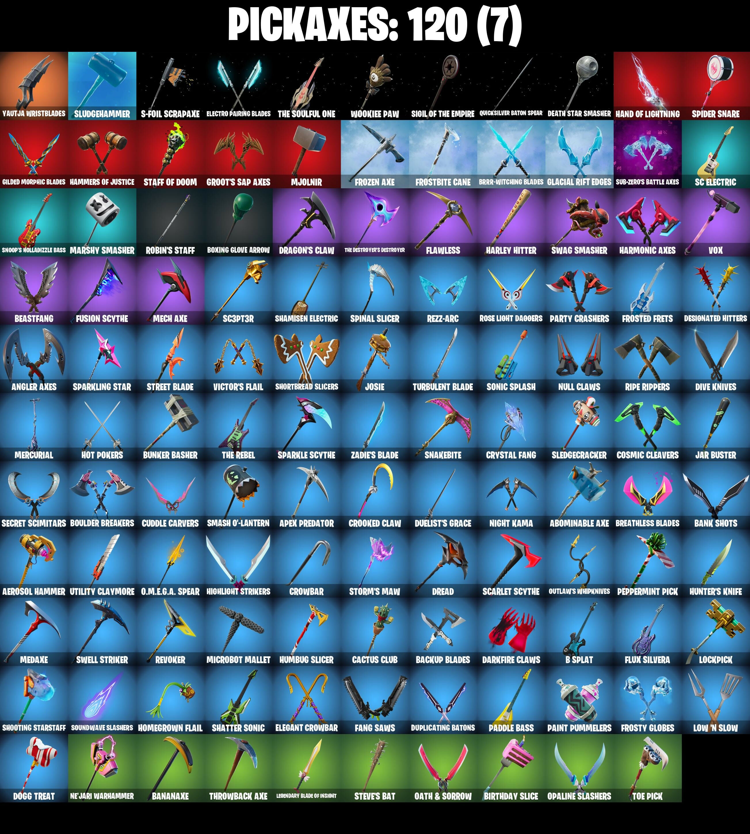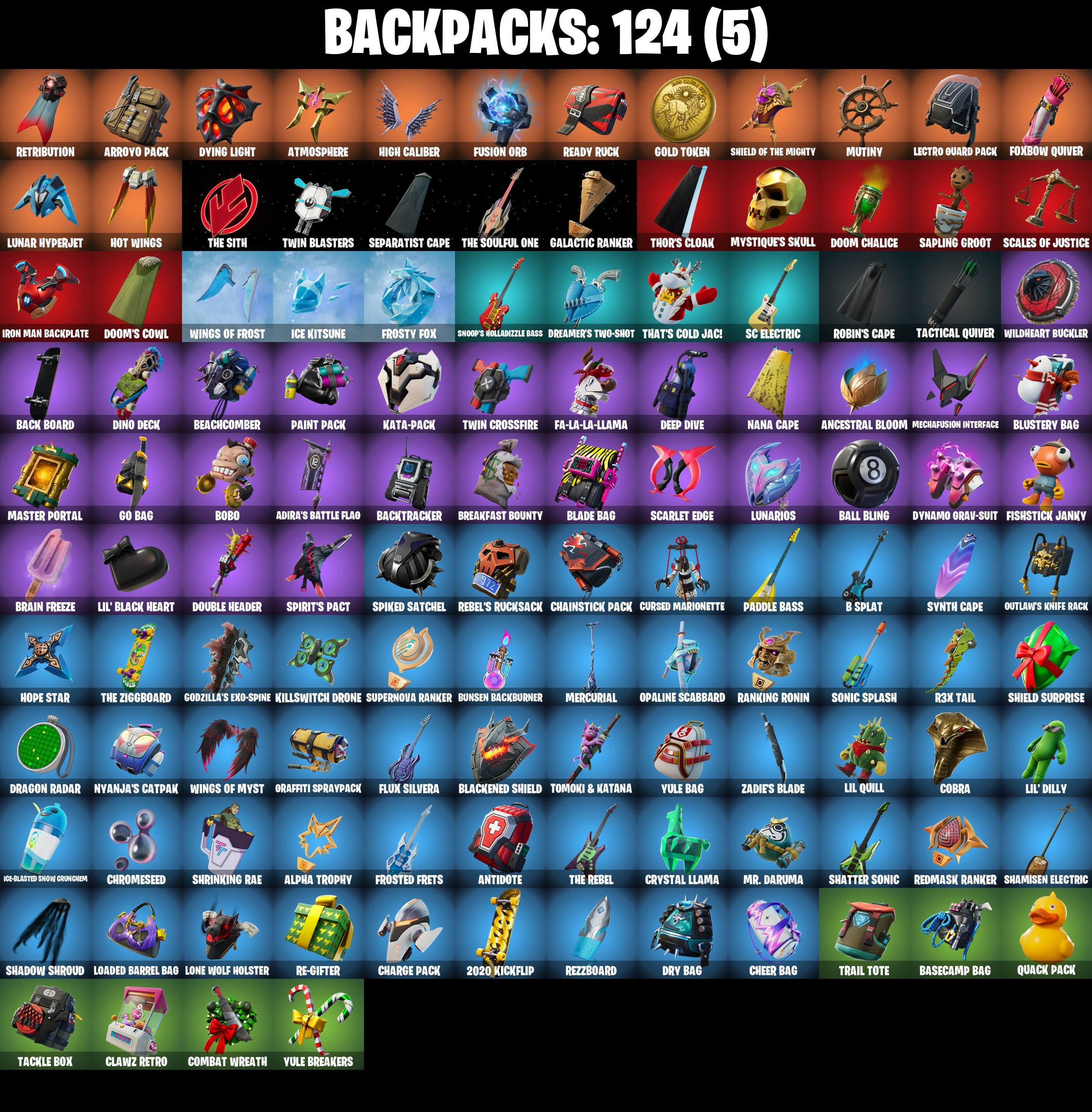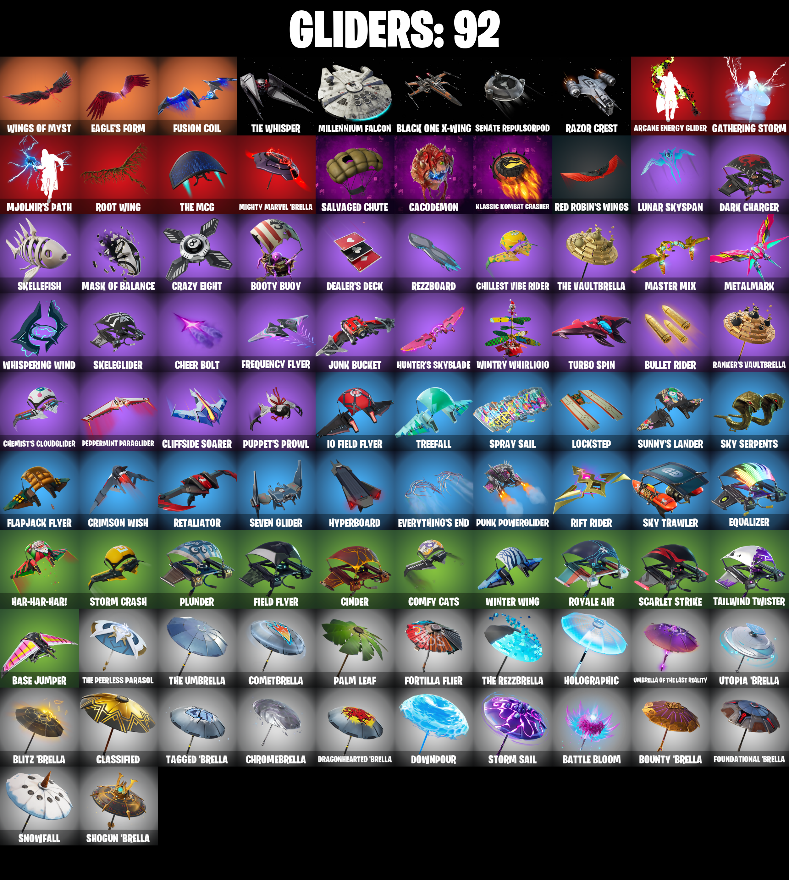 2020 Kickflip, 8-Ball Vs Scratch, A Warrior Prepares, Abominable Axe, Adira's Battle Flag, Aerosol Hammer, Alpha Trophy, Ancestral Bloom, Angler Axes, Antidote, Apex Predator, Arcane Energy Glider, Arcane Research, Arctic Adeline, Arroyo Pack, Atmosphere, B Splat, Back Board, Backtracker, Backup Blades, Ball Bling, Bananaxe, Bank Shots, Baron's Hoard, Base Jumper, Basecamp Bag, Battle Bloom, Beachcomber, Beastfang, Beep Beep, Birdarang Flourish, Birthday Slice, Black One X-Wing, Blackened Shield, Blackheart, Blackheart (Stage 8), Blade Bag, Blitz 'Brella, Blowing Bubbles, Blustery Bag, Bobo, Boing!, Boobytrapped, Boogie Down, Boomin', Booty Buoy, Boulder Breakers, Bounty 'Brella, Boxing Glove Arrow, Brain Freeze, Breakfast Bounty, Breathless Blades, Brrr-Witching Blades, Bullet Rider, Bunker Basher, Bunker Jonesy, Bunsen Backburner, Burnoff, C'Mere, Cacodemon, Cactus Club, Call Me, Cameo Vs Chic, Catalyst, Chainstick Pack, Charge Pack, Cheer Bag, Cheer Bolt, Chemist's Cloudglider, Chillest Vibe Rider, Chrome Punk, Chromebrella, Chromeseed, Cinder, Classified, Clawz Retro, Clean Sweep, Cliffside Soarer, Cluck Strut, Cobra, Combat Wreath, Cometbrella, Comfy Cats, Conga, Cosmic Cleavers, Crazy Eight, Crimson Wish, Crooked Claw, Crowbar, Crowning Achievement, Crystal Fang, Crystal Llama, Cuddle Carvers, Curling Iron, Cursed Marionette, Cyclo Curl, Dabstand, Dark Charger, Darkfire Claws, Dazzle, Dealer's Deck, Death Star Smasher, Deep Dive, Deep End, Demi, Designated Hitters, Dino Deck, Dive Knives, Doctor Doom, Doctor Doom (God Emperor), Dogg Treat, Doom Chalice, Doom's Cowl, Double Header, Downpour, Dragon Radar, Dragon Stance, Dragon's Claw, Dragonhearted 'Brella, Dread, Dreamer's Two-Shot, Droop, Dry Bag, Duelist's Grace, Dupli-Kate, Duplicating Batons, Duplikates, Dusk Knight, Dying Light, Dynamo Grav-Suit, Eagle's Form, Electro Pairing Blades, Elegant Crowbar, Ember, Equalizer, Everything's End, Fa-La-La-Llama, Fang Saws, Field Flyer, Fierce, Fishstick Janky, Fist Bump, Flapjack Flyer, Flawless, Flippin' Away, Flux Silvera, Fortilla Flier, Foundational 'Brella, Foxbow Quiver, Frequency Flyer, Frost Broker, Frost Squad, Frostbite Cane, Frosted Frets, Frosty Fox, Frosty Globes, Frozen Axe, Fusion, Fusion Coil, Fusion Orb, Fusion Scythe, Galactic Ranker, Gathering Storm, Gilded Morphic Blades, Glacial Rift Edges, Go Bag, Godzilla's Exo-Spine, Gold Token, Golf Clap, Graffiti Spraypack, Green Arrow, Groot, Groot's Sap Axes, Guff Gringle, Hammers Of Justice, Hand Of Lightning, Har-Har-Har!, Harley Hitter, Harmonic Axes, Haylee Skye, Hazard, Hello Friend, High Caliber, High Five, Highlight Strikers, Holographic, Homegrown Flail, Hoop Master, Hope Star, Hot Marat, Hot Pokers, Hot Wings, Hula Hoopin', Humbug Slicer, Hunter's Knife, Hunter's Skyblade, Hybrid, Hybrid (Stage 4), Hype!, Hyperboard, I Declare!, Ice Kitsune, Ice-Blasted Snow Crunch’em, Imperial March, Infinite Dab, Io Field Flyer, Iridia Vayne, Iron Man Backplate, It Is Finished, Jar Buster, Jaywalking, Jennifer Walters, Jet Signals, Josie, Journey Vs Hazard, Jump Jets, Junk Bucket, Kata-Pack, Keep It Mello, Killswitch, Killswitch Drone, Klassic Kombat Crasher, Kondor, Laid Back Shuffle, Leafy Longboardin', Lectro Guard Pack, Legendary Blade Of Insight, Lexa, Lexa (Warstrike), Lightrider, Lil Quill, Lil' Black Heart, Lil' Dilly, Lil' Prancer, Loaded Barrel Bag, Lockpick, Lockstep, Lone Wolf Holster, Low 'N Slow, Lt. Evergreen, Lunar Hyperjet, Lunar Skyspan, Lunarios, Luxe, Luxe (Gold Clothing), M-Jolnir, Mancake, Mandalorian, Marika, Marshy Smasher, Mashed Potato, Mask Of Balance, Master Key, Master Key (Masked), Master Mix, Master Portal, Mave, Mave (Reactive Hair Off), Mech Axe, Mechafusion Interface, Medaxe, Members Only, Menace, Menace (Challenger Menace - Flame), Mercurial, Metalmart, Mic Drop, Microbot Mallet, Mighty Marvel 'Brella, Millennium Falcon, Mini Dogfight, Mjolnir's Path, Morgan Myst, Mr. Daruma, Mutiny, Mystique, Mystique's Skull, Nailed It, Nana Cape, Nana Nana, Ne'Jari Warhammer, Night Kama, No Sweat, Null Claws, Nyanja's Catpak, O.M.E.G.A. Spear, Oath & Sorrow, Opaline Scabbard, Opaline Slashers, Origami Battalion, Outlaw's Knife Rack, Outlaw's Whipknives, PJ Patroller, Paddle Bass, Paint Pack, Paint Pummellers, Palm Leaf, Party Crashers, Peace Out, Peely, Peppermint Paraglider, Peppermint Pick, Plunder, Predator, Punk Powerglider, Puppet's Prowl, Quack Pack, Quicksilver Baton Spear, R3x Tail, Ranker's Vaultbrella, Ranking Ronin, Raven's Legion, Razor Crest, Re-Gifter, Ready Ruck, Rebel's Rucksack, Red Jade, Red Robin's Wings, Red-Nosed Ranger, Redmask Ranker, Reese, Regal Wave, Remedy (Purple), Remedy Vs Toxin, Respect The Peace, Retaliator, Retribution, Revoker, Rezz-Arc, Rezzblocks, Rezzboard, Rift Rider, Ripe Rippers, Rippley Vs Sludge, Riptide, Robin, Robin's Cape, Robin's Staff, Root Wing, Rose Light Daggers, Rox, Rox (Stage 5), Royale Air, Ruin, S-Foil Scrapaxe, SC Electric, SC3PT3R, Sad Trombone, Salvaged Chute, Sandshark Driver, Santa Dogg, Sapling Groot, Scales Of Justice, Scarlet Edge, Scarlet Scythe, Scarlet Strike, Scratch (Virus), Secret Scimitars, Seeker, Senate Repulsorpod, Sentinel, Sentinel (Dark), Separatist Cape, Seven Glider, Shadow Shroud, Shamisen Electric, Shaolin Sip, Sharpshooter, Shatter Sonic, Shield Of The Mighty, Shield Surprise, Shogun 'Brella, Shooting Starstaff, Shortbread Slicers, Show 'Em Off, Shrinking Rae, Sidewinder, Sidewinder (Dark), Sigil Of The Empire, Sign Spinner, Sing Along, Singularity, Singularity (Stage 3), Skeleglider, Skellefish, Sky Serpents, Sky Trawler, Sled Ready Guff, Sledgecracker, Sludgehammer, Smash O'-Lantern, Smooth Moves, Snakebite, Snoop's Holladizzle Bass, Snoop's Holodazzle Bass, Snoozefest, Snow Drift, Snowfall, Snowheart, Snowmando, Snowshaker, So Square, Sonic Splash, Sorana, Sorana (Grey), Soundwave Slashers, Sparkle Scythe, Sparkle Supreme, Sparkling Star, Spider Snare, Spiked Satchel, Spinal Slicer, Spirit's Pact, Spray Sail, Staff Of Doom, Ste