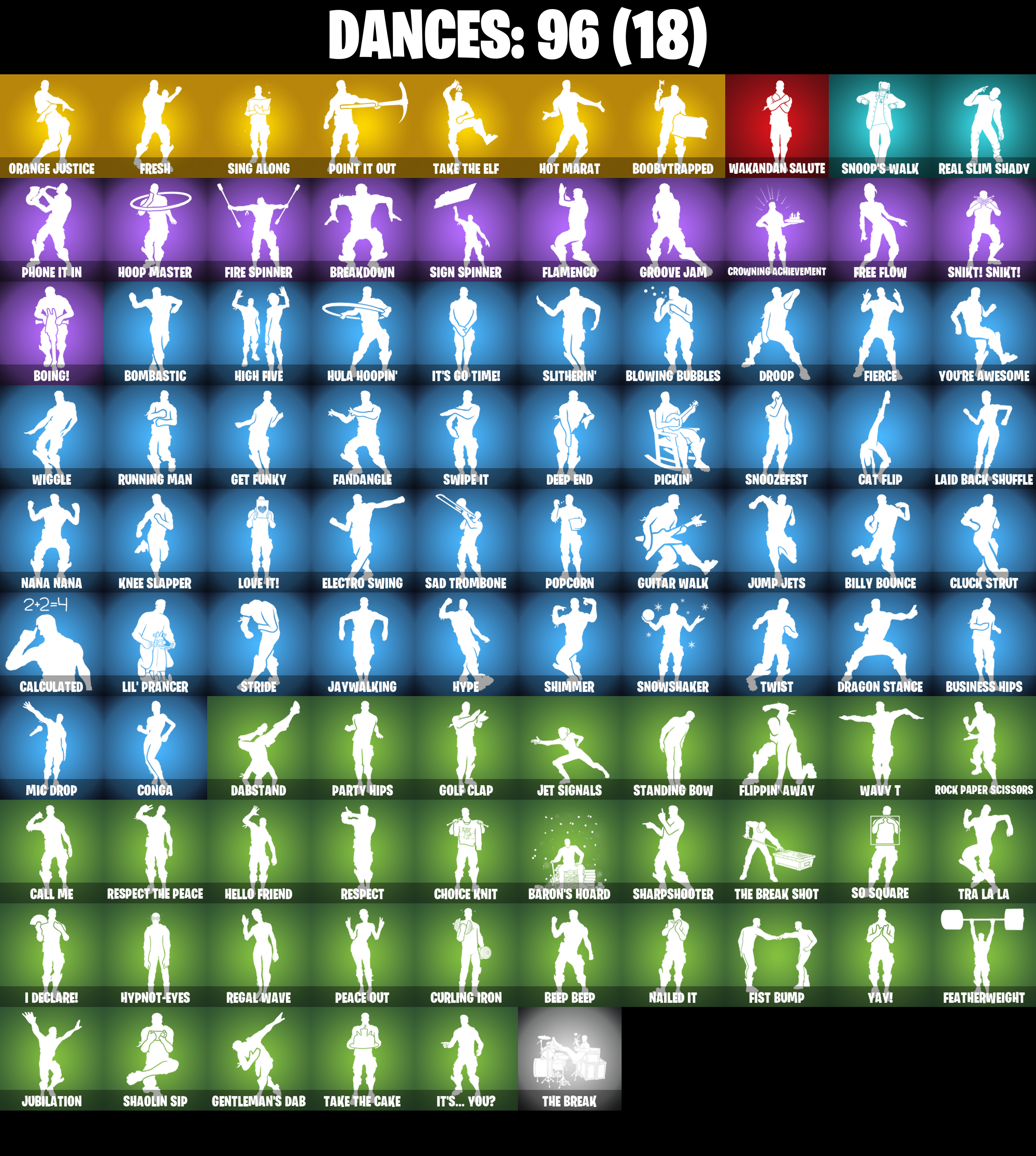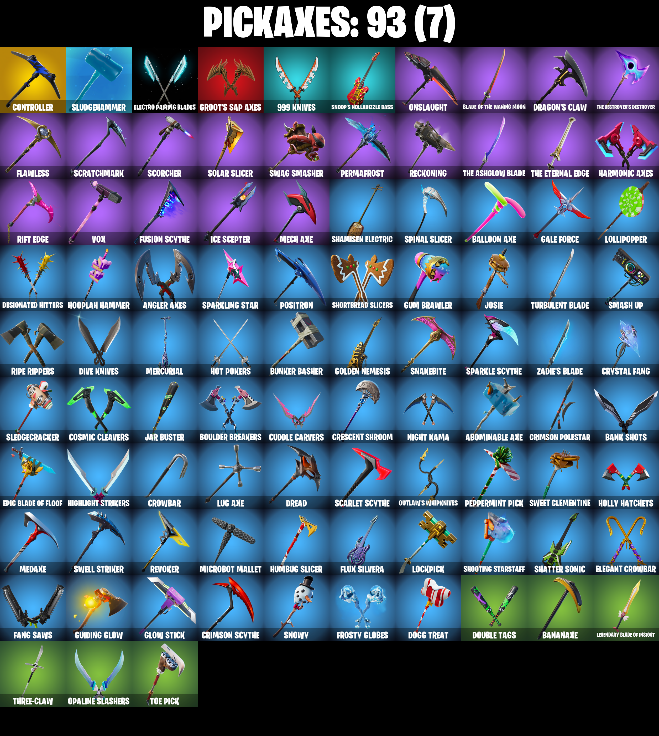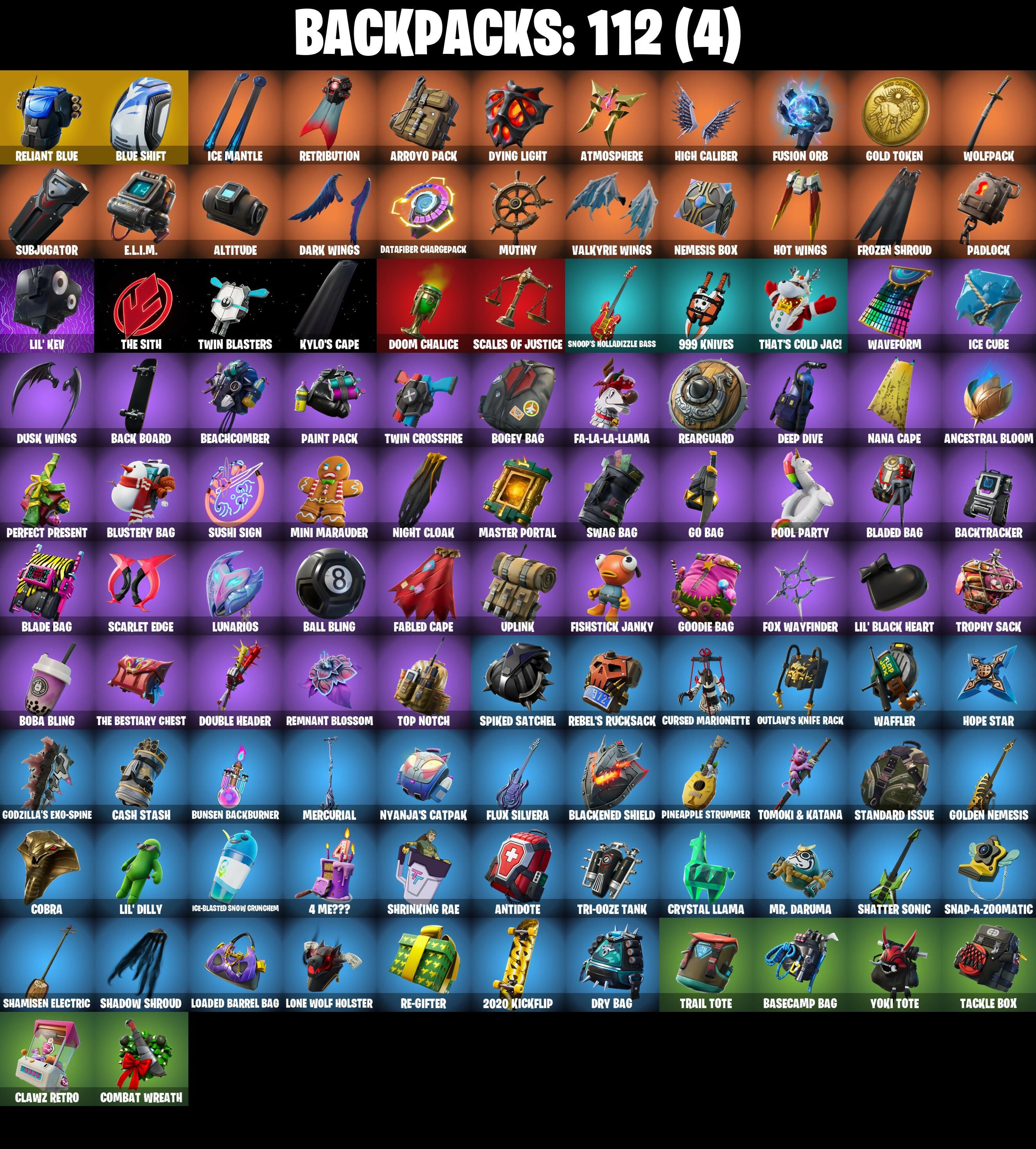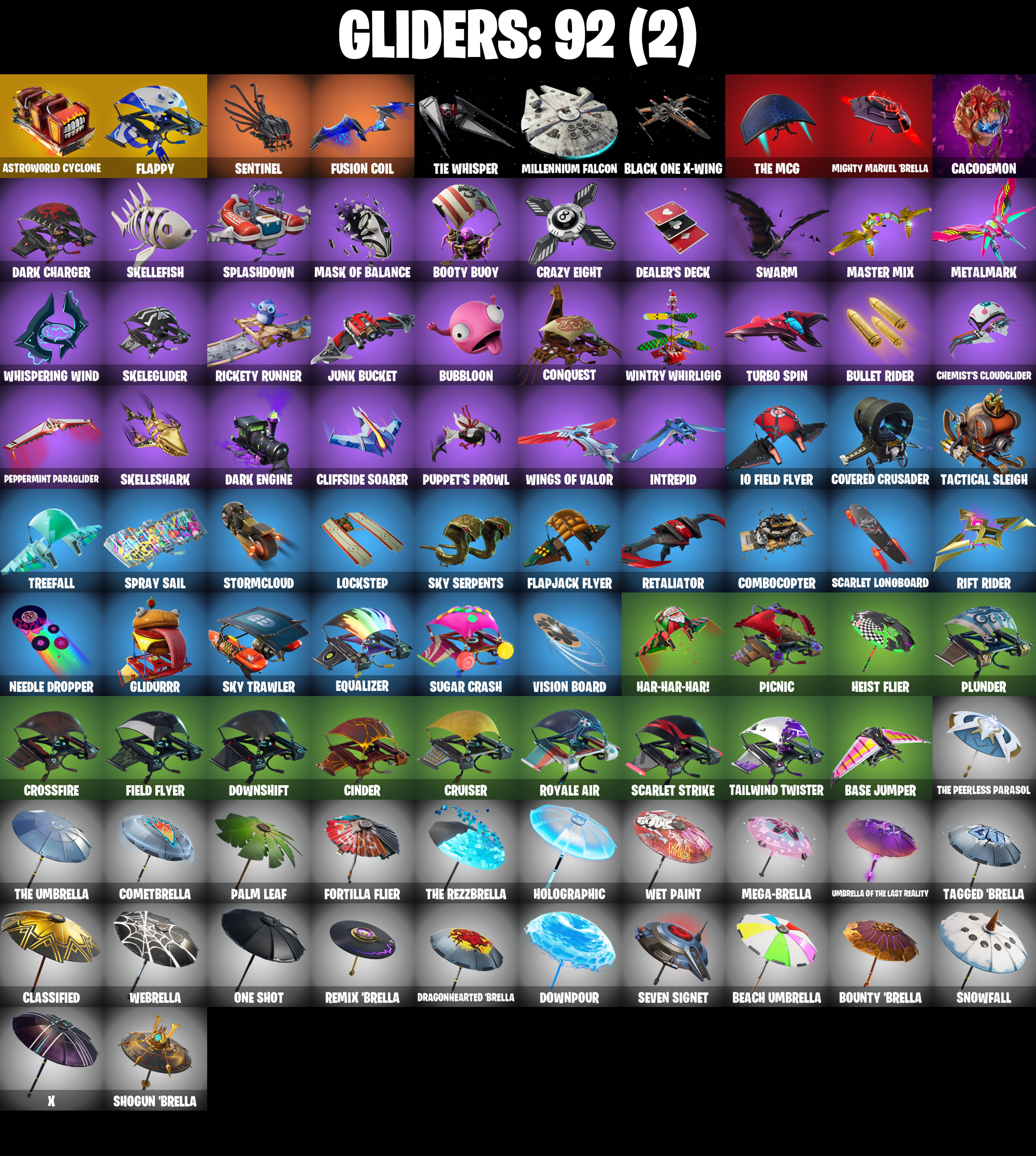 2020 Kickflip, 4 Me???, 8-Ball Vs Scratch, 999 Knives, A.I.M., Abominable Axe, Altitude, Ancestral Bloom, Angler Axes, Antidote, Arctic Adeline, Arroyo Pack, Astroworld Cyclone, Atmosphere, Back Board, Backtracker, Ball Bling, Balloon Axe, Bananaxe, Bank Shots, Baron's Hoard, Base Jumper, Basecamp Bag, Battlehawk, Beach Umbrella, Beachcomber, Beep Beep, Billy Bounce, Black One X-Wing, Black Werewolf, Blackened Shield, Blackheart, Blackheart (Stage 8), Blade Bag, Blade of the Waning Moon, Bladed Bag, Blowing Bubbles, Blue Shift, Blue Striker, Blustery Bag, Boba Bling, Bogey Bag, Boing!, Bombastic, Boobytrapped, Booty Buoy, Boulder Breakers, Bounty 'Brella, Breakdown, Bubbloon, Bullet Rider, Bunker Basher, Bunker Jonesy, Bunsen Backburner, Business Hips, Cacodemon, Calamity, Calamity Stage 5, Calculated, Call Me, Cameo Vs Chic, Carbide, Carbide Armor Stage 5, Cash Stash, Cat Flip, Catalyst, Chemist's Cloudglider, Choice Knit, Cinder, Classified, Clawz Retro, Cliffside Soarer, Cluck Strut, Cobra, Combat Wreath, Combocopter, Cometbrella, Conga, Conquest, Controller, Cosmic Cleavers, Covered Crusader, Crazy Eight, Crescent Shroom, Crimson Polestar, Crimson Scythe, Crossfire, Crowbar, Crowning Achievement, Cruiser, Crystal Fang, Crystal Llama, Cuddle Carvers, Curling Iron, Cursed Marionette, DJ Yonder, Dabstand, Dark Charger, Dark Engine, Dark Wings, Datafiber Chargepack, Dealer's Deck, Deep Dive, Deep End, Demi, Designated Hitters, Dire, Dive Knives, Dogg Treat, Doom Chalice, Double Header, Double Tags, Downpour, Downshift, Dragon Stance, Dragon's Claw, Dragonhearted 'Brella, Dread, Drift, Drift Stage 5, Droop, Dry Bag, Dusk, Dusk Wings, Dying Light, E.L.I.M., Electro Pairing Blades, Electro Swing, Elegant Crowbar, Ember, Ember (Night), Enforcer, Epic Blade of Floof, Equalizer, Fa-La-La-Llama, Fable, Fabled Cape, Fandangle, Fang Saws, Featherweight, Field Flyer, Fierce, Fire Spinner, Fishstick Janky, Fist Bump, Flamenco, Flapjack Flyer, Flappy, Flawless, Flippin' Away, Flux Silvera, Fortilla Flier, Fox Wayfinder, Free Flow, Fresh, Frosty Globes, Frozen Shroud, Fusion, Fusion Coil, Fusion Orb, Fusion Scythe, Gale Force, Gentleman's Dab, Get Funky, Giddy-Up, Glidurr, Glow Stick, Go Bag, Godzilla's Exo-Spine, Gold Token, Golden Nemesis, Golf Clap, Goodie Bag, Groot's Sap Axes, Groove Jam, Guiding Glow, Guitar Walk, Gum Brawler, Har-Har-Har!, Harmonic Axes, Hazard, Heist Flier, Hello Friend, High Caliber, High Five, Highlight Strikers, Holly Hatchets, Holographic, Hoop Master, Hooplah Hammer, Hope Star, Hot Marat, Hot Pokers, Hot Wings, Hula Hoopin', Humbug Slicer, Huntress, Hybrid, Hybrid (Stage 4), Hype, Hypnot-Eyes, I Declare!, IO Field Flyer, Ice Cube, Ice King (Gold), Ice Mantle, Ice Scepter, Ice-Blasted Snow Cruncher, Inferno, Intrepid, It's Go Time!, It's... You?, Jar Buster, Jaywalking, Jet Signals, Josie, Journey Vs Hazard, Jubilation, Jump Jets, Junk Bucket, Knee Slapper, Kylo Ren, Kylo's Cape, Laguna, Laid Back Shuffle, Legendary Blade of Insight, Lil' Black Heart, Lil' Dilly, Lil' Kev, Lil' Prancer, Liteshow, Loaded Barrel Bag, Lockpick, Lockstep, Lollipopper, Lone Wolf Holster, Love It!, Lt. Evergreen, Lug Axe, Lunarios, Luxe, Luxe (Gold Clothing), Lynx, Lynx (Stage 4 - No Ponytail), Major Mancake, Mask Of Balance, Master Key, Master Key (Masked), Master Mix, Master Portal, Mech Axe, Medaxe, Mega-Brella, Mercurial, Merry Marauder, Metalmark, Mic Drop, Microbot Mallet, Mighty Marvel 'Brella, Millennium Falcon, Mini Marauder, Mr. Daruma, Mutiny, Nailed It, Nana Cape, Nana Nana, Needle Dropper, Nemesis Box, Night Cloak, Night Kama, Nightshade, Nyanja's Catpak, Omega, One Shot, Onesie, Onslaught, Opaline Slashers, Orange Justice, Outlaw's Knife Rack, Outlaw's Whipknives, Padlock, Paint Pack, Palm Leaf, Party Hips, Peace Out, Peely, Peppermint Paraglider, Peppermint Pick, Perfect Present, Permafrost, Phone It In, Pickin', Picnic, Pineapple Strummer, Plunder, Point It Out, Polar Peely, Pool Party, Popcorn, Positron, Powder, Powder (White), Puppet's Prowl, Ragnarok, Raonarok (No Shoulder Pad), Ravage, Re-Gifter, Real Slim Shady, Rearguard, Rebel's Rucksack, Reckoning, Red Strike, Redline, Regal Wave, Reliant Blue, Remedy Vs Toxin, Remix 'Brella, Remnant Blossom, Respect, Respect The Peace, Retaliator, Retribution, Revoker, Rickety Runner, Rift Edge, Rift Rider, Ripe Rippers, Rippley Vs Sludge, Riptide, Rock Paper Scissors, Rook, Rox, Rox (Stage 5), Royale Air, Ruin, Running Man, Sad Trombone, Scales of Justice, Scarlet Edge, Scarlet Longboard, Scarlet Scythe, Scarlet Strike, Scorcher, Scratch (Virus), Scratchmark, Sentinel, Sentinel (Dark), Seven Signet, Sgt. Winter, Sgt. Winter Headgear, Shadow Shroud, Shamisen Electric, Shaolin Sip, Sharpshooter, Shatter Sonic, Shimmer, Shogun 'Brella, Shooting Starstaff, Shortbread Slicers, Shrinking Rae, Sidewinder, Sidewinder (Dark), Sign Spinner, Sing Along, Singularity, Singularity (Stage 3), Skeleglider, Skellefish, Skelleshark, Sky Serpents, Sky Trawler, Slayer Juice Wrld, Sled Ready Guff, Sledgecracker, Sledgehammer, Slitherin', Sludgehammer, Smash Up, Snakebite, Snap-A-Zoomatic, Snikt! Snikt!, Snoop's Holladizzle Bass, Snoop's Walk, Snoozefest, Snowfall, Snowshaker, Snowy, So Square, Solar Slicer, Sparkle Scythe, Sparkling Star, Spiked Satchel, Spinal Slicer, Splashdown, Spray Sail, Squad Leader, Stage 4, Standard Issue, Standing Bow, Stormcloud, Stratus, Stride, Subjugator, Sugar Crash, Summit Striker, Sun Strider, Sushi Sign, Swag Bag, Swag Smasher, Swarm, Sweet Clementine, Swell Striker, Swipe It, Tackle Box, Tactical Sleigh, Tagged 'Brella, Tailwind Twister, Take The Cake, Take The Elf, Teknique, That's Cold Jac!, The Ace, The Ashglow Blade, The Bestiary Chest, The Break, The Break Shot, The Destroyer's Destroyer, The Eternal Edge, The Ice King, The McG, The Peerless Parasol, The Prisoner, The Rezzbrella, The Sith, The Umbrella, Three-Claw, Tie Whisper, Tilted Teknique, Tilted Teknique (Hoodie), Toe Pick, Tomoki & Katana, Top Notch, Tra La La