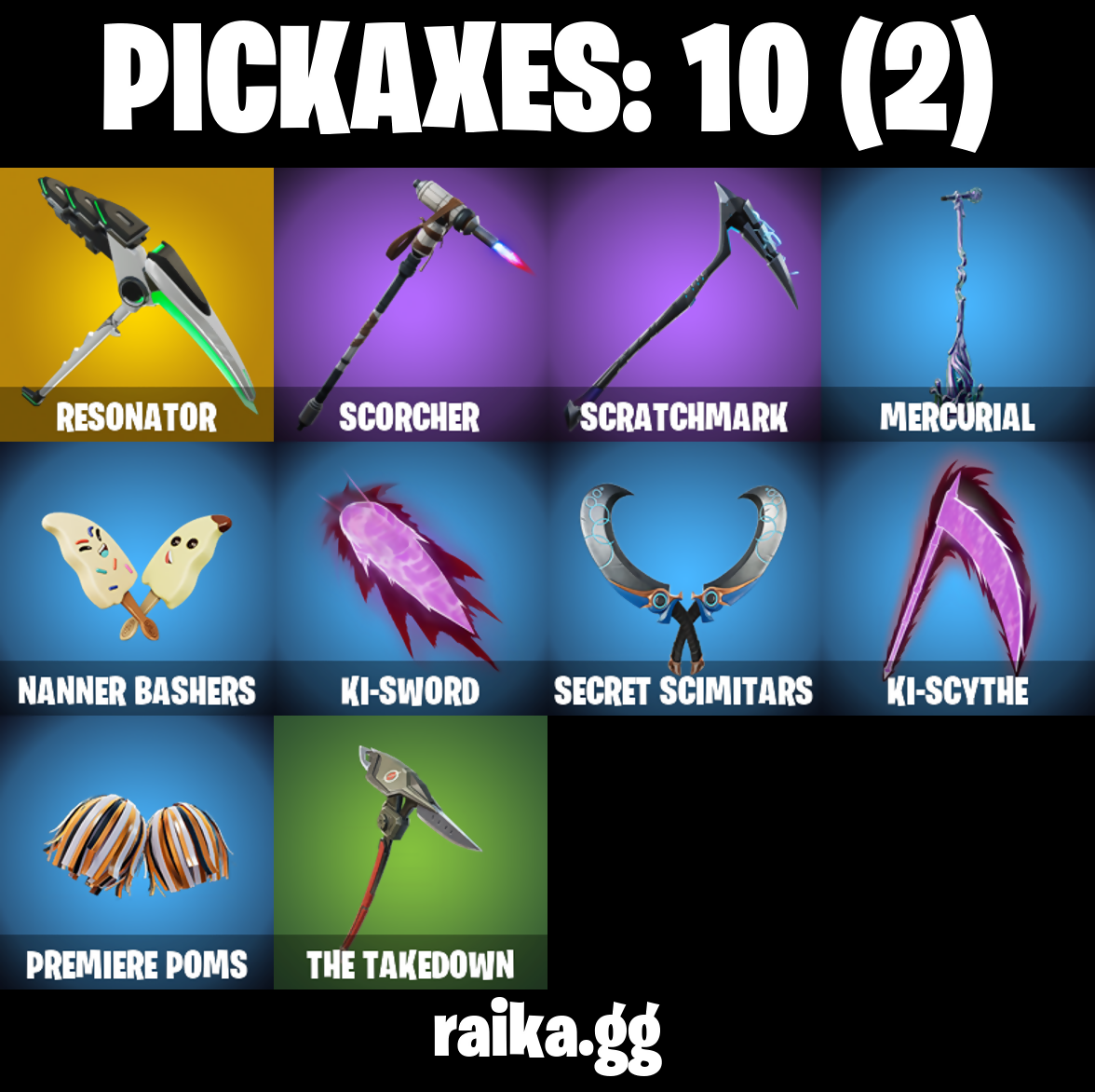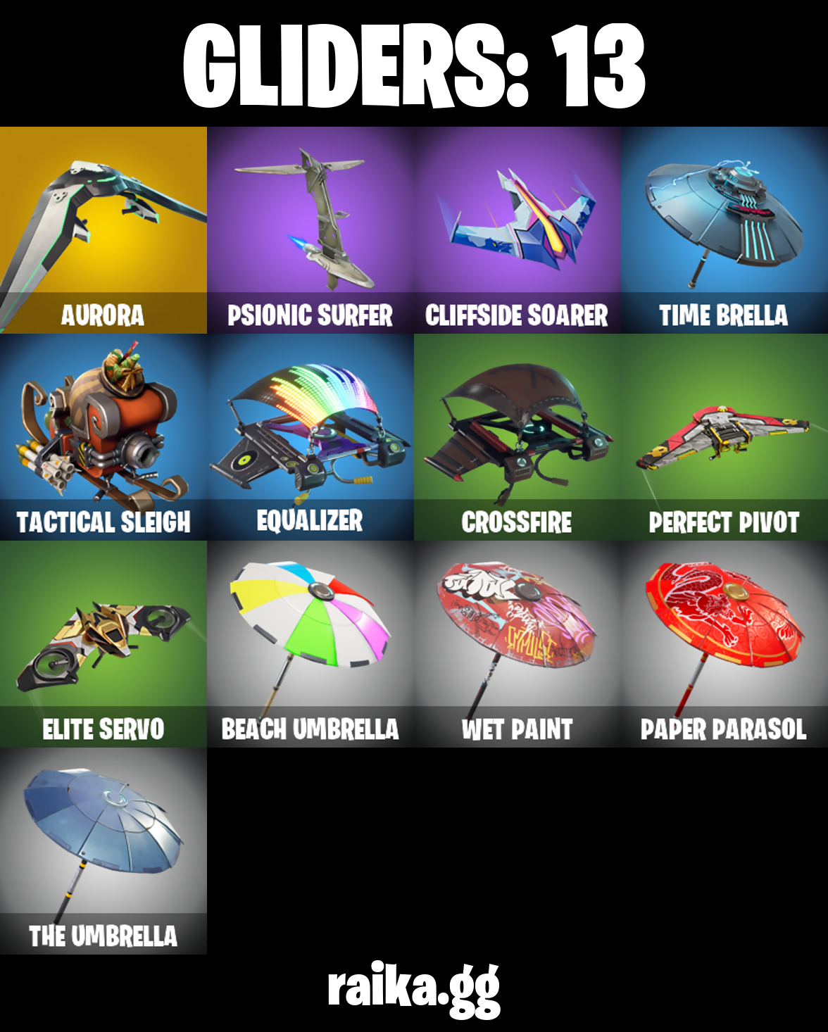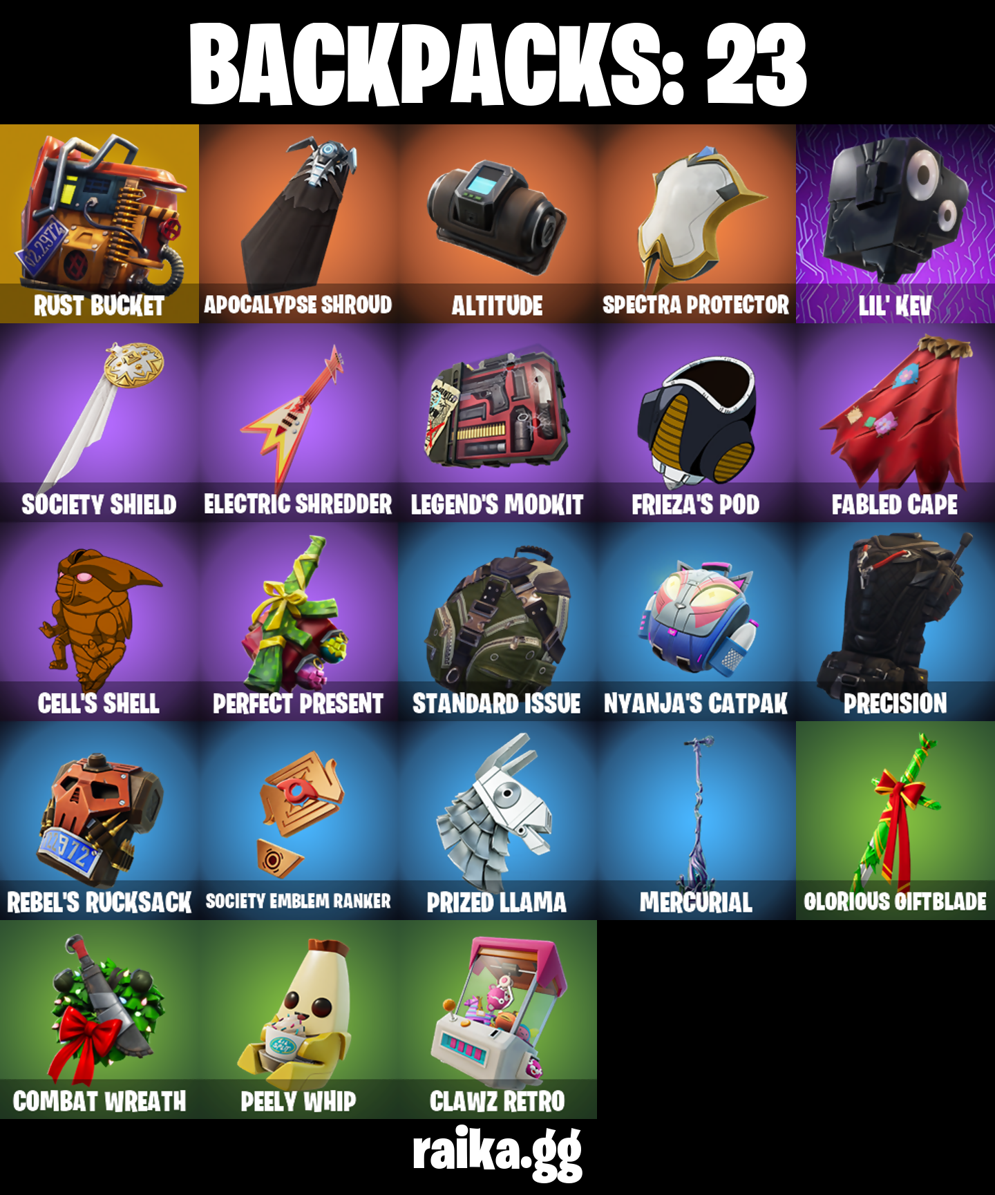 Altitude, Apocalypse Shroud, Aurora, Beach Umbrella, Boneless, Cat Flip, Cell, Cell's Shell, Clawz Retro, Cliffside Soarer, Combat Wreath, Crossfire, Crowning Achievement, Doze Dab, Electric Shredder, Elite Servo, Eon, Equalizer, Fabled Cape, Frieza, Frieza's Pod, Gentleman's Dab, Glorious Giftblade, Goku Black, Golf Clap, Holiday Boxy, Hot Marat, Ki-Scythe, Ki-Sword, Legend's Modkit, Lil' Key, Lynx, Lynx (Stage 4 - No Ponytail), Mercurial, Nanner Bashers, Nyanja's Catpak, Paper Parasol, Peely Whip, Perfect Pivot, Perfect Present, Precision, Premiere Poms, Prized Llama, Psionic Surfer, Rambunctious, Rebel's Rucksack, Regal Wave, Resonator, Ride The Pony, Rust Bucket, Salute, Scorcher, Scratchmark, Secret Scimitars, Snoop's Walk, Society Emblem Ranker, Society Shield, Spectra Protector, Standard Issue, T-Pose, Tactical Sleigh, The Takedown, The Umbrella, Time Brella, Wet Paint, Winterfest Bushranger, Zenith, Zenith (Stage 4)