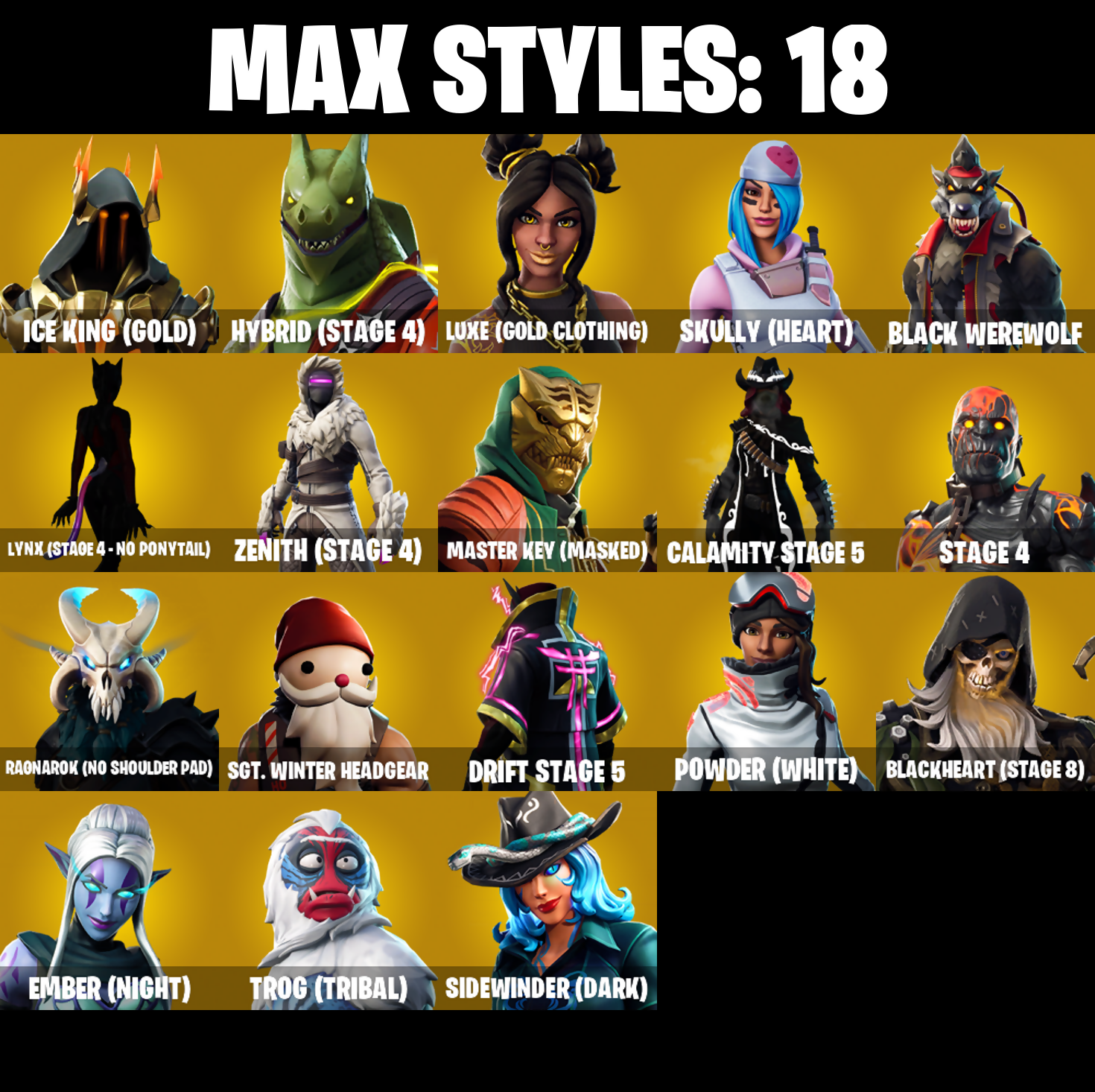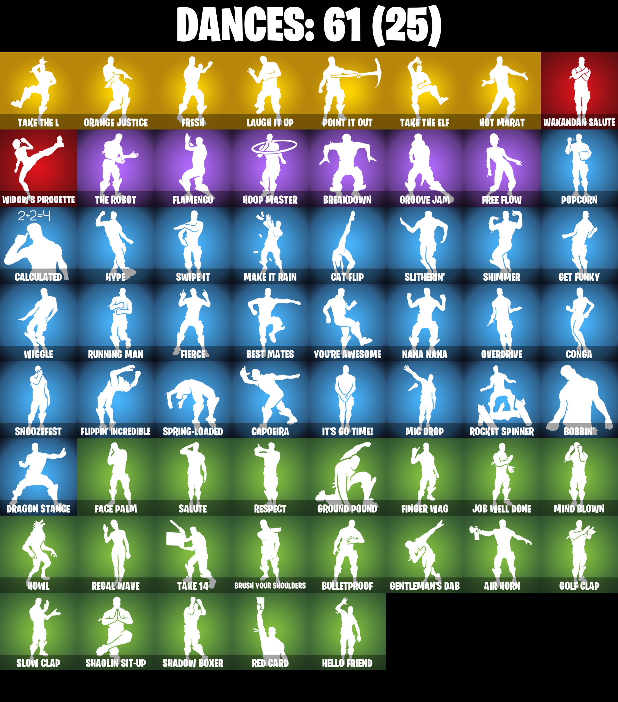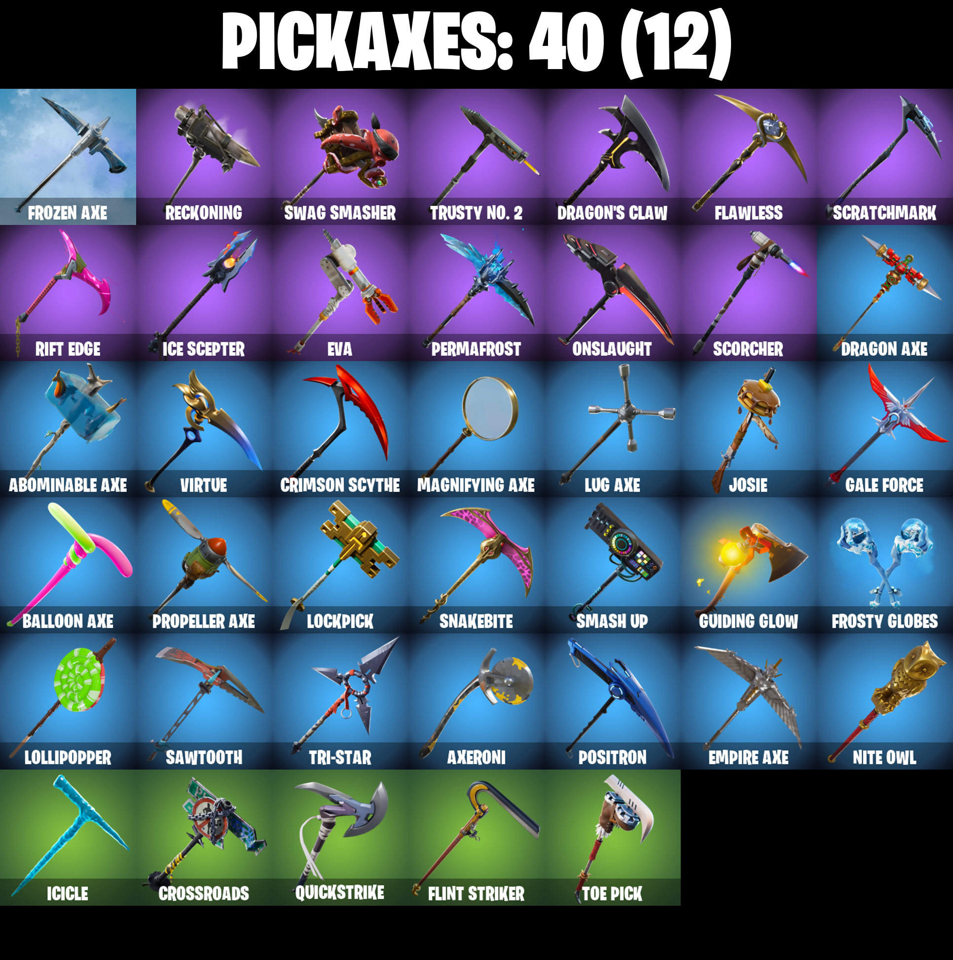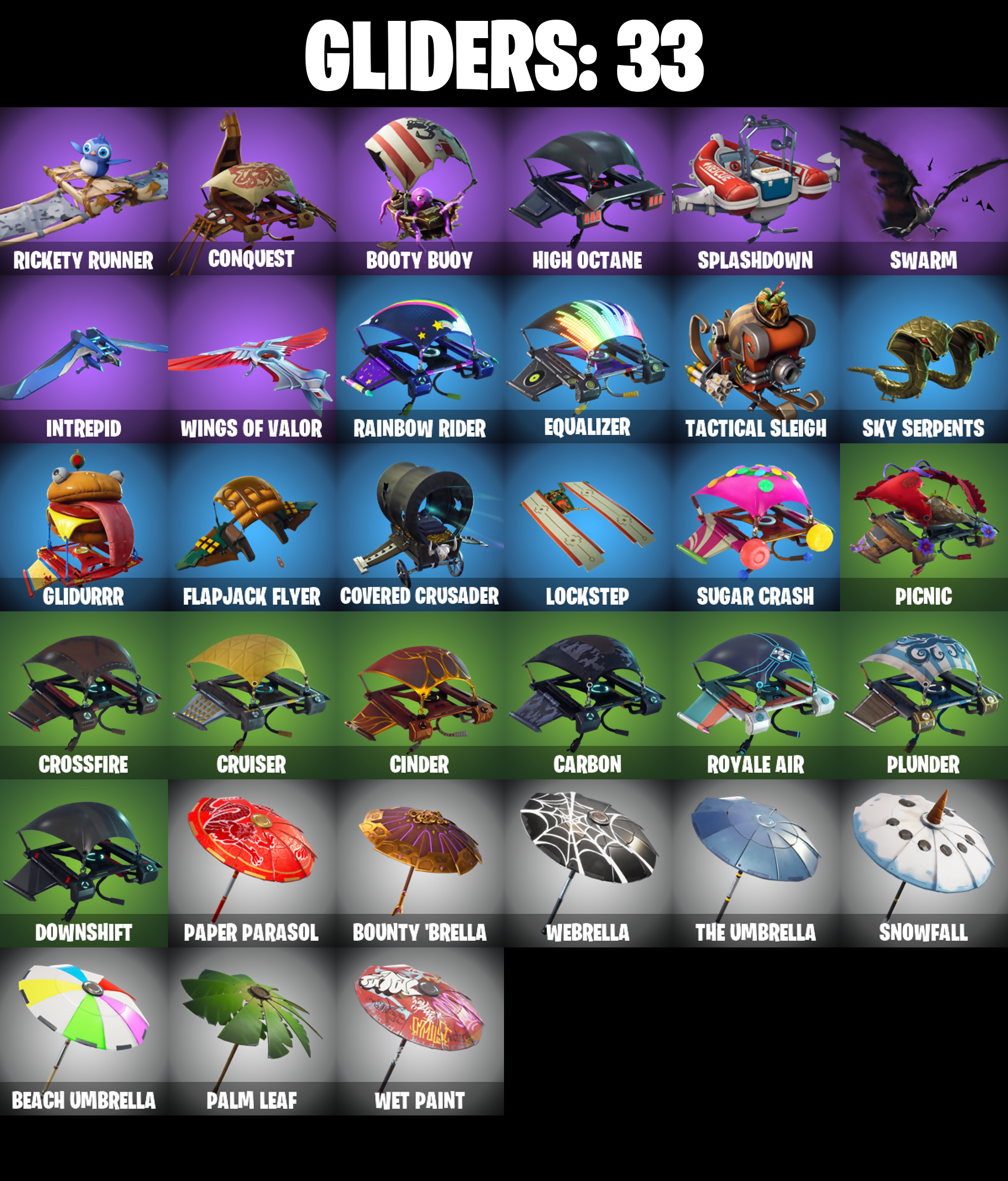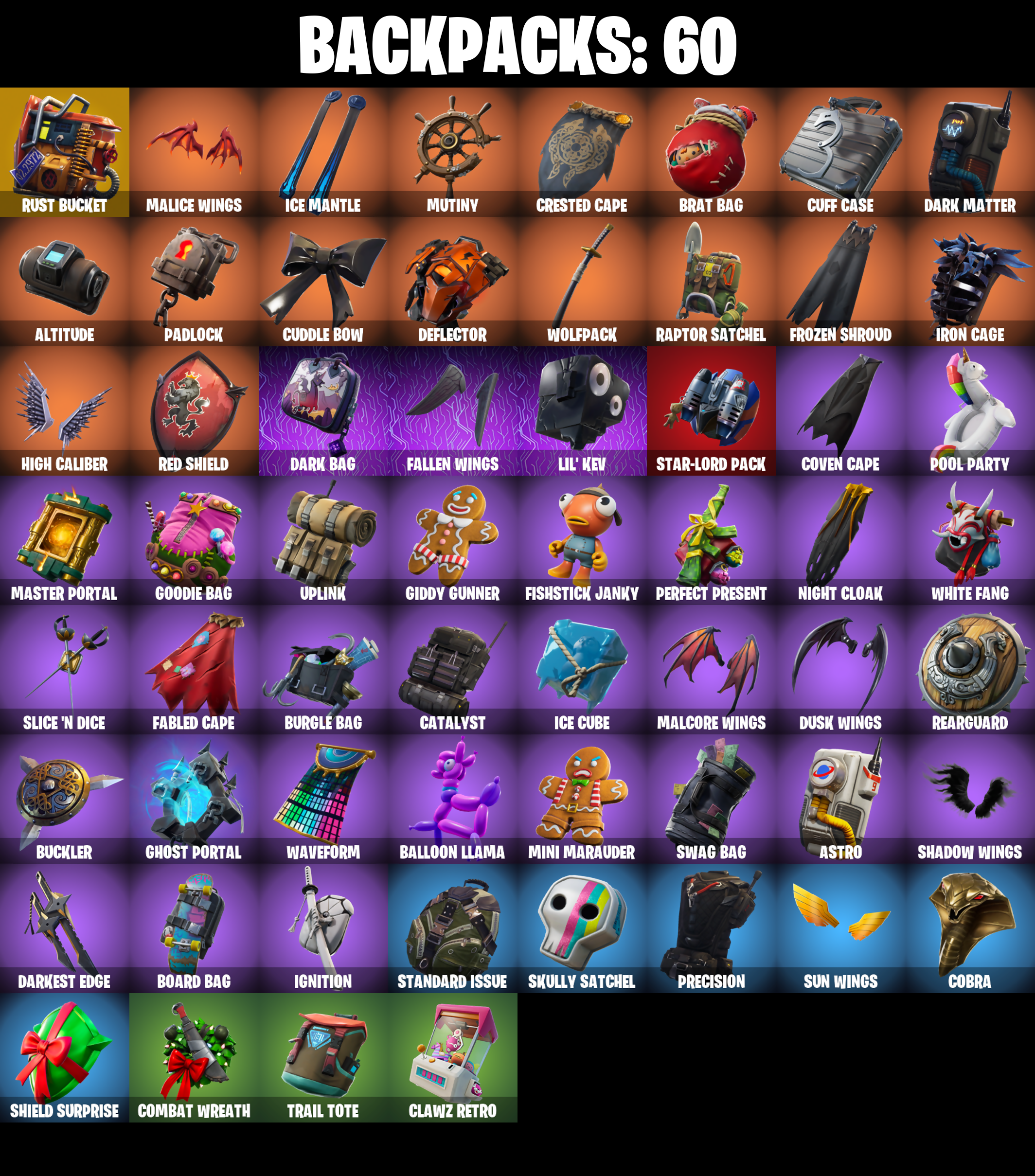 Abominable Axe, Air Horn, Altitude, Arctic Assassin, Astro, Axeroni, Balloon Axe, Balloon Llama, Bandolette, Battle Hound, Battlehawk, Beach Umbrella, Best Mates, Black Werewolf, Blackheart, Blackheart (Stage 8), Board Bag, Bobbin', Booty Buoy, Bounty 'Brella, Brat Bag, Breakdown, Brush Your Shoulders, Buckler, Bulletproof, Burgle Bag, Calamity, Calamity Stage 5, Calculated, Capoeira, Carbide, Carbon, Cat Flip, Catalyst, Cinder, Clawz Retro, Clinical Crosser, Cloaked Shadow, Cloaked Star, Cobra, Combat Wreath, Conga, Conquest, Coven Cape, Covered Crusader, Crested Cape, Crimson Scythe, Crossfire, Crossroads, Cruiser, Cuddle Bow, Cuddle Team Leader, Cuff Case, DJ Yonder, Daring Duelist, Dark Bag, Dark Bomber, Dark Matter, Dark Voyager, Darkest Edge, Deflector, Dire, Downshift, Dragon Axe, Dragon Stance, Dragon's Claw, Drift, Drift Stage 5, Dusk, Dusk Wings, Elite Agent, Ember, Ember (Night), Empire Axe, Equalizer, Eva, Fable, Fabled Cape, Face Palm, Fallen Love Ranger, Fallen Wings, Fierce, Finger Wag, Fishstick Janky, Flamenco, Flapjack Flyer, Flawless, Flint Striker, Flippin' Incredible, Free Flow, Fresh, Frosty Globes, Frozen Axe, Frozen Shroud, Gale Force, Gentleman's Dab, Get Funky, Ghost Portal, Giddy Gunner, Giddy-Up, Ginger Gunner, Glidurr, Golf Clap, Goodie Bag, Groove Jam, Ground Pound, Guiding Glow, Hello Friend, High Caliber, High Octane, Highland Warrior, Hoop Master, Hot Marat, Howl, Huntress, Hybrid, Hybrid (Stage 4), Hype, Ice Cube, Ice King (Gold), Ice Mantle, Ice Scepter, Icicle, Ignition, Inferno, Intrepid, Iron Cage, It's Go Time!, Job Well Done, Josie, Krampus, Laugh It Up, Lil' Kev, Lockpick, Lockstep, Lollipopper, Lug Axe, Luxe, Luxe (Gold Clothing), Lynx, Lynx (Stage 4 - No Ponytail), Magnifying Axe, Make It Rain, Malcore, Malcore Wings, Malice, Malice Wings, Master Key, Master Key (Masked), Master Portal, Merry Marauder, Mic Drop, Mind Blown, Mini Marauder, Mission Specialist, Moniker, Moonwalker, Mutiny, Nana Nana, Nara, Night Cloak, Nightshade, Nite Nite, Nite Owl, Nog Ops, Omega, Onesie, Onslaught, Orange Justice, Overdrive, Padlock, Palm Leaf, Paper Parasol, Peely, Perfect Present, Permafrost, Picnic, Plunder, Point It Out, Pool Party, Popcorn, Positron, Powder, Powder (White), Precision, Propeller Axe, Quickstrike, Ragnarok, Ragnarok (No Shoulder Pad), Rainbow Rider, Rapscallion, Raptor, Raptor Satchel, Raven, Rearguard, Reckoning, Red Card, Red Knight, Red Shield, Redline, Regal Wave, Respect, Revolt, Rickety Runner, Rift Edge, Rocket Spinner, Rogue Agent, Rook, Royale Air, Running Man, Rust Bucket, Rust Lord, Salute, Sanctum, Sawtooth, Scorcher, Scorpion, Scratchmark, Sgt. Winter, Sgt. Winter Headgear, Shadow Boxer, Shadow Wings, Shaolin Sit-Up, Shield Surprise, Shimmer, Sidewinder, Sidewinder (Dark), Skull Trooper, Skully, Skully (Heart), Skully Satchel, Sky Serpents, Sledgehammer, Slice 'N Dice, Slitherin', Slow Clap, Smash Up, Snakebite, Snoozefest, Snowfall, Splashdown, Spring-Loaded, Squad Leader, Stage 4, Standard Issue, Star-Lord Outfit, Star-Lord Pack, Sugar Crash, Sun Strider, Sun Wings, Sunbird, Swag Bag, Swag Smasher, Swarm, Swipe It, Tactical Sleigh, Take 14, Take The Elf, Take The L, Teknique, The Ace, The Ice King, The Prisoner, The Reaper, The Robot, The Umbrella, Toe Pick, Tower Recon Specialist, Trail Tote, Tri-Star, Trog, Trog (Tribal), Trusty No. 2, Uplink, Valor, Vertex, Virtue, Wakandan Salute, Waveform, Webrella, Wet Paint, White Fang, Whiteout, Widow's Pirouette, Wiggle, Wild Card, Wings Of Valor, Wolfpack, You're Awesome, Zenith, Zenith (Stage 4), Zoey