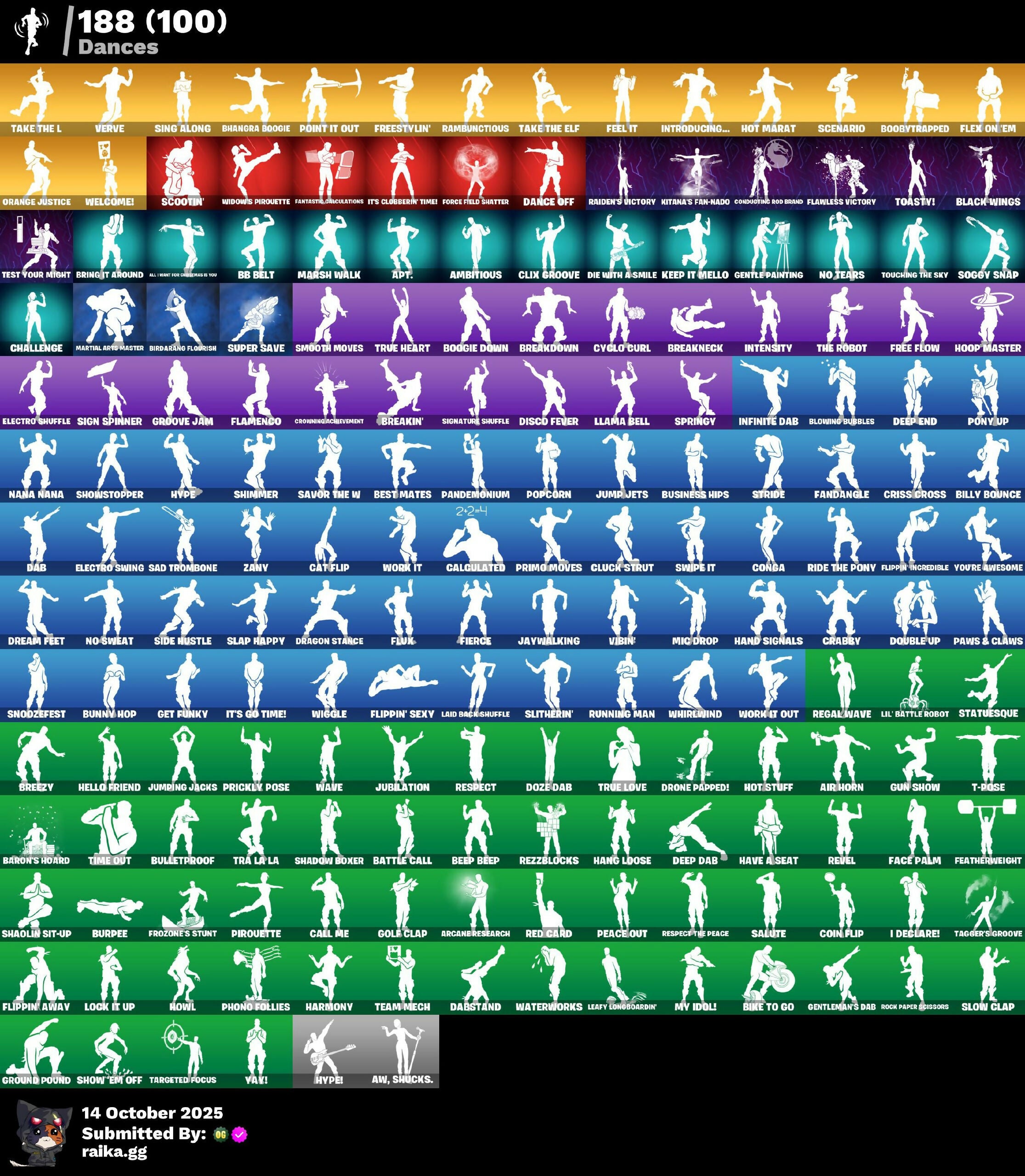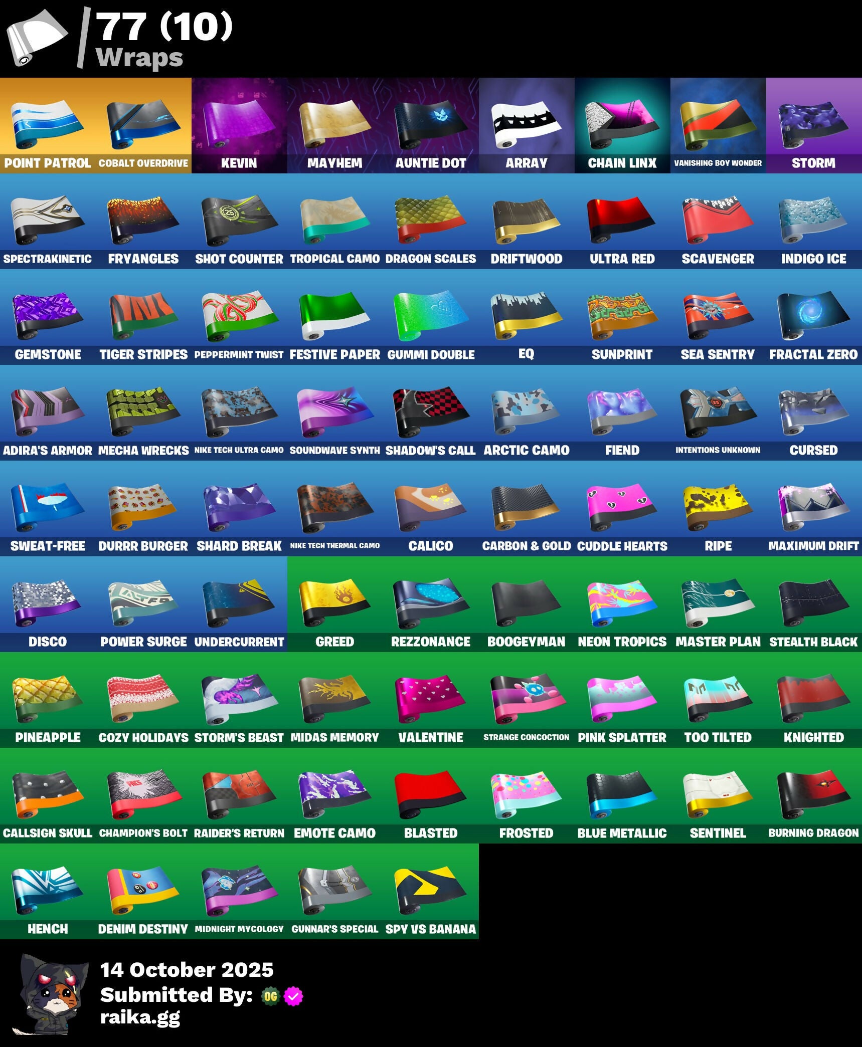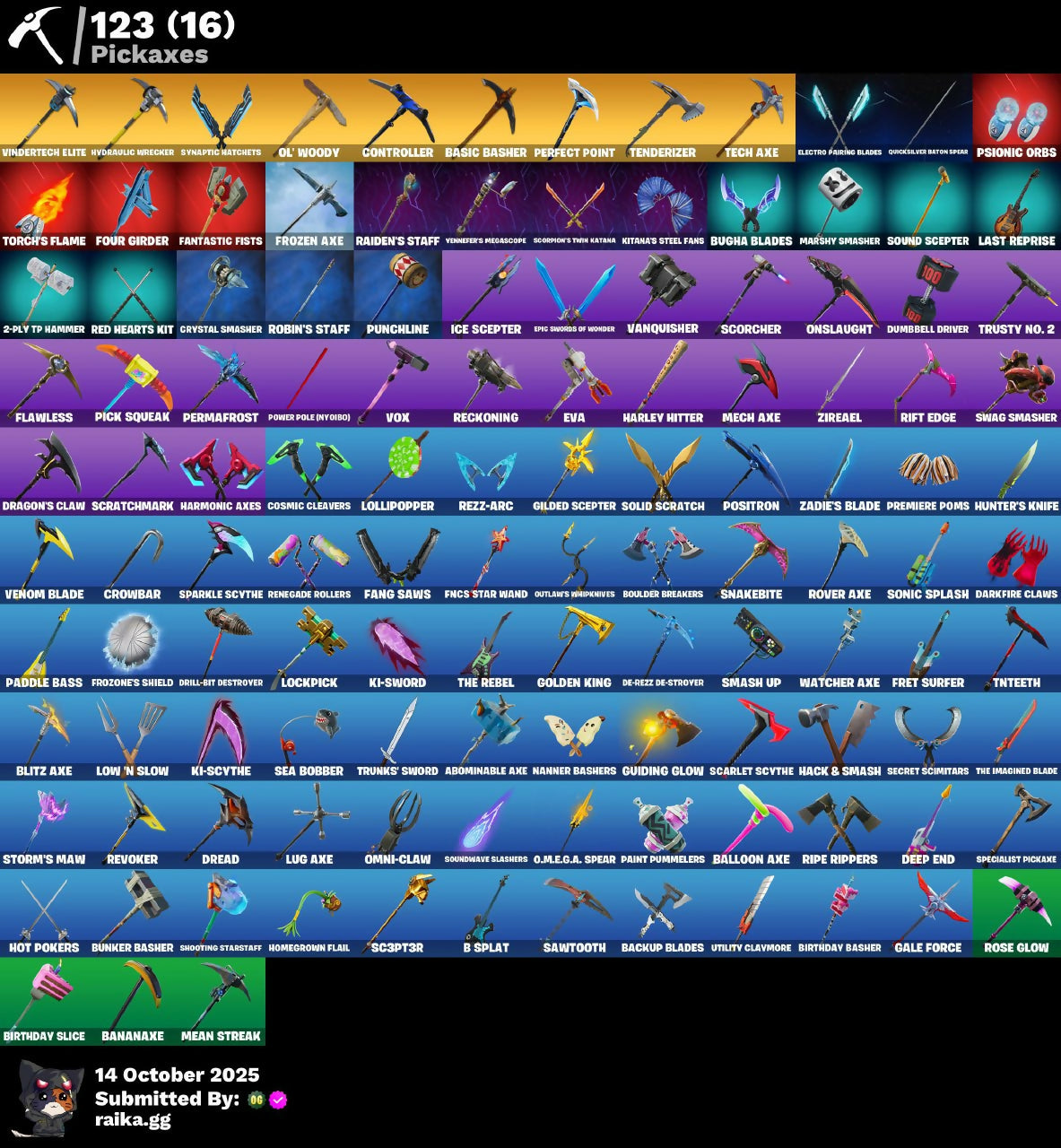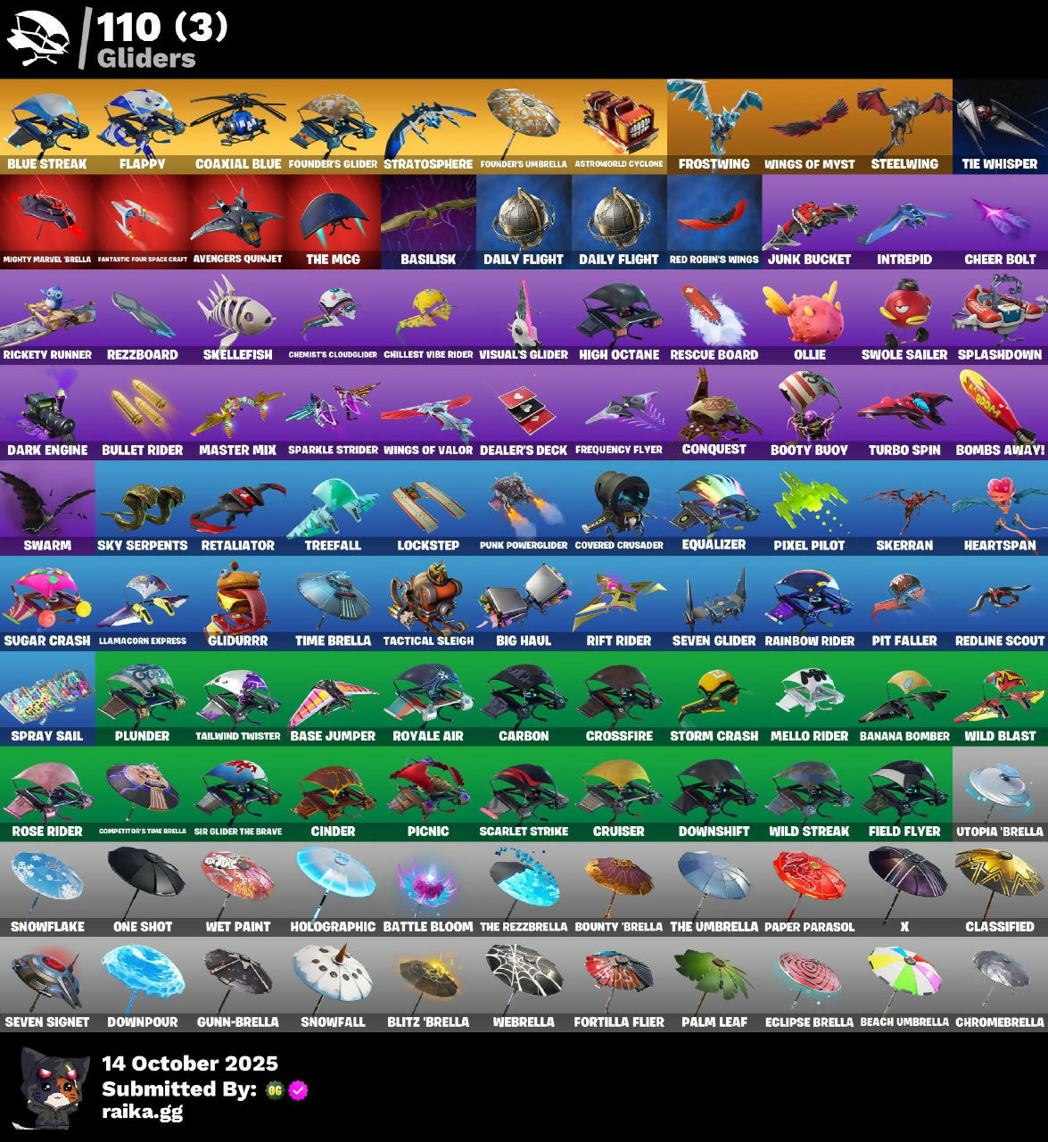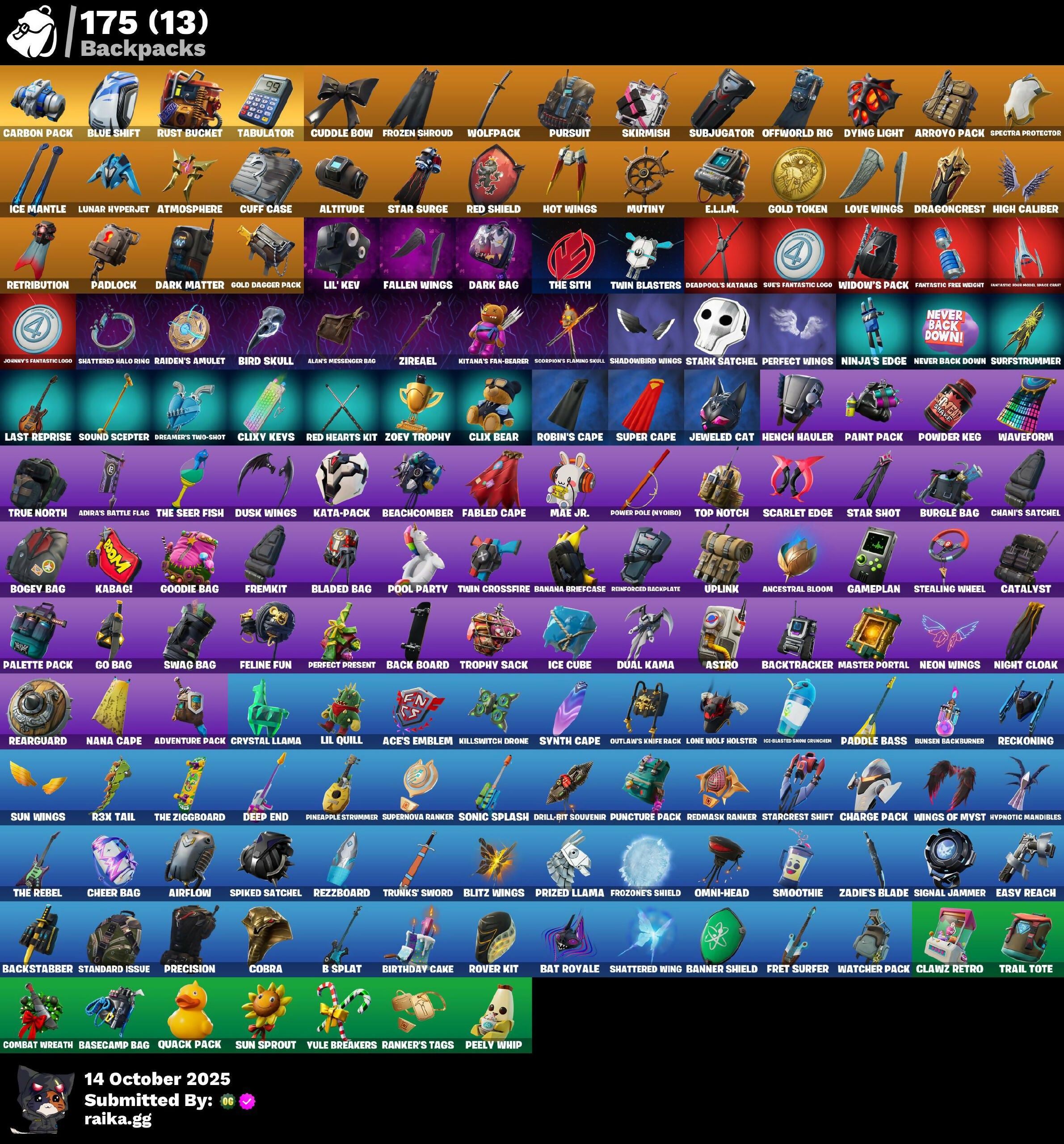 2-Ply TP Hammer, A.I.M., Abominable Axe, Ace's Emblem, Adira's Armor, Adira's Battle Flag, Adventure Pack, Agent Peely, Air Horn, Airflow, Airheart, Alan Wake, Alan's Messenger Bag, Altitude, Ambitious, Ancestral Bloom, Apt., Arcane Research, Arctic Camo, Array, Arroyo Pack, Astro, Astroworld Cyclone, Atmosphere, Auntie Dot, Aura, Avengers Quinjet, Aw, Shucks., B Splat, B.R.U.T.E. Gunner, Back Board, Backstabber, Backtracker, Backup Blades, Balloon Axe, Banana Bomber, Banana Briefcase, Bananaxe, Banner Shield, Baron's Hoard, Base Jumper, Basecamp Bag, Basic Basher, Basilisk, Bat Royale, Battle Bloom, Battle Call, Battlehawk, Bb Belt, Beach Umbrella, Beachcomber, Beep Beep, Beerus, Ben Grimm, Best Mates, Bhangra Boogie, Big Haul, Bike To Go, Billy Bounce, Bird Skull, Birdarang Flourish, Birdie, Birthday Basher, Birthday Cake, Birthday Slice, Black Widow Outfit, Black Wings, Blackheart, Bladed Bag, Blasted, Blitz 'Brella, Blitz Axe, Blitz Wings, Blowing Bubbles, Blue Metallic, Blue Shift, Blue Streak, Blue Striker, Blue Team Leader, Bogey Bag, Bombs Away!, Boobytrapped, Boogeyman, Boogie Down, Booty Buoy, Boulder Breakers, Bounty 'Brella, Breakdown, Breakin', Breakneck, Breakpoint, Breezy, Bring It Around, Bruno Mars, Bruno-San, Brutus, Bugha, Bugha Blades, Bullet Rider, Bulletproof, Bulma, Bunker Basher, Bunker Jonesy, Bunny Hop, Bunsen Backburner, Burgle Bag, Burning Dragon, Burpee, Business Hips, Calamity, Calculated, Calico, Call Me, Callsign Skull, Carbide, Carbon, Carbon & Gold, Carbon Commando, Carbon Pack, Catalyst, Catflip, Catwoman Comic Book Outfit, Chain Linx, Challenge, Champion Crystal, Champion's Bolt, Chani, Chani's Satchel, Charge Pack, Cheer Bag, Cheer Bolt, Chemist's Cloudglider, Chillest Vibe Rider, Chromebrella, Cinder, Ciri, Classified, Clawz Retro, Clix, Clix Bear, Clix Groove, Clixy Keys, Cluck Strut, Coaxial Blue, Cobalt, Cobalt Overdrive, Cobra, Coin Flip, Combat Wreath, Commando, Competitor's Time Brella, Conducing Rob Brand, Conga, Conquest, Constructor, Controller, Cosmic Cleavers, Covered Crusader, Cozy Commander, Cozy Holidays, Crabby, Criss Cross, Crossfire, Crowbar, Crowning Achievement, Cruiser, Crystal, Crystal Llama, Crystal Smasher, Cuddle Bow, Cuddle Hearts, Cuddle Team Leader, Cuff Case, Cursed, Cyclo Curl, DJ Yonder, Dab, Dabstand, Daily Flight, Dance Off, Dark Bag, Dark Bomber, Dark Engine, Dark Matter, Dark Voyager, Darkfire Claws, De-Rezz De-Stroyer, Deadpool, Deadpool's Katanas, Dealer's Deck, Deep Dab, Deep End, Demi, Denim Destiny, Die With A Smile, Die with a Smile Bruno, Dire, Disco, Disco Fever, Double Up, Downpour, Downshift, Doze Dab, Dragon Scales, Dragon Stance, Dragon's Claw, Dragoncrest, Dread, Dream, Dream Feet, Dreamer's Two-Shot, Drift, Driftwood, Drill-Bit Destroyer, Drill-Bit Souvenir, Drone Papped!, Dual Kama, Dumbbell Driver, Durrr Burger, Dusk, Dusk Knight, Dusk Wings, Dying Light, E.L.I.M., Easy Reach, Eclipse Brella, Electro Pairing Blades, Electro Shuffle, Electro Swing, Elite Agent, Ember, Emote Camo, Enforcer, Envoy, Epic Swords of Wonder, Eq, Equalizer, Eternal Voyager, Eva, FNCS Star Wand, Fable, Fabled Cape, Face Palm, Fallen Love Ranger, Fallen Wings, Fandangle, Fang Saws, Fantastic Circulations, Fantastic Fists, Fantastic Four Mobel Space Craft, Fantastic Four Space Craft, Fantastic Free Weight, Featherweight, Feel It, Feline Fun, Festive Paper, Field Flyer, Fiend, Fierce, Finesse Finisher, Firebrand, Fixer, Flamenco, Flappy, Flatfoot, Flawless, Flawless Victory, Flex On 'Em, Flippin' Away, Flippin' Incredible, Flippin' Sexy, Flux, Force Field Shatter, Fortilla Flier, Founder's Glider, Founder's Umbrella, Four Girder, Fractal Zero, Free Flow, Freestylin', Fremkit, Frequency Flyer, Fret Surfer, Frosted, Frostwing, Frozen Axe, Frozen Shroud, Frozone, Frozone's Shield, Frozone's Stunt, Frozones Shield, Fryangles, Gale Force, Gameplan, Gear Specialist Maya, Gemstone, Gentle Painting, Gentleman's Dab, Get Funky, Giddy-Up, Gilded Scepter, Glidurrr, Go Bag, Goku Black, Gold Dagger Pack, Gold Token, Golden King, Golf Clap, Goodie Bag, Greed, Groove Jam, Ground Pound, Guiding Glow, Gummi Double, Gun Show, Gunn-Brella, Gunnar's Special, Hack & Smash, Hand Signals, Hang Loose, Harley Hitter, Harley Quinn, Harmonic Axes, Harmony, Have A Seat, Haylee Skye, Heartspan, Hello Friend, Hench, Hench Hauler, High Caliber, High Octane, Holly Jammer, Holographic, Homegrown Flail, Hoop Master, Horde Desert 1, Hot Marat, Hot Pokers, Hot Stuff, Hot Wings, Howl, Hunter's Knife, Huntress, Hybrid, Hydraulic Wrecker, Hype, Hype!, Hypnotic Mandibles, I Declare!, Ice Cube, Ice Mantle, Ice Scepter, Ice-Blasted Snow Crunchen, Ikonik, Indigo Ice, Infinite Dab, Intensity, Intentions Unknown, Intrepid, Introducing..., It's Clobberin' Time!, It's Go Time!, Jaywalking, Jeweled Cat, Johnny Storm, Johnny's Fantastic Logo, Jolly Jammer, Jubilation, Jump Jets, Jumping Jacks, Junk Bucket, Kabag!, Kata-Pack, Keep It Mello, Kevin, Ki-Scythe, Ki-Sword, Killswitch, Killswitch Drone, Kitana (MK3), Kitana's Fan-Bearer, Kitana's Fan-Nado, Kitana's Steel Fans, Knighted, Kuno, Laguna, Laid Back Shuffle, Last Reprise, Leafy Longboardin', Lightrider, Lil Quill, Lil' Battle Robot, Lil' Kev, Llama Bell, Llamacorn Express, Lock It Up, Lockpick, Lockstep, Lollipopopper, Lone Wolf Holster, Love Ranger, Love Wings, Low 'N Slow, Lug Axe, Luminary Hypatia, Lunar Hyperjet, Luxe, Lynx, Mae Jr., Marsh Walk, Marshmello, Marshy Smasher, Martial Arts Master, Master Key, Master Mix, Master Plan, Master Portal, Maximum Drift, Mayhem, Mean Streak, Mech Axe, Mecha Team Banner, Mecha Wrecks, Mello Rider, Meowscles, Mic Drop, Midas, Midas Memory, Midnight Mycology, Mighty Marvel 'Brella, Mission Specialist, Miyako, Monster Team Banner, Moonwalker, Morgan Myst, Mr. Incredible, Mrs. Incredible, Mutiny, My Idol, Nana Cape, Nana Dance, Nana Nana, Nanner Bashers, Neon Tropics, Neon Wings, Never Back Down, Nick Eh 30, Night Cloak, Nightshade, Nike Tech Thermal Camo, Nike Tech Ultra Camo, Ninja, N