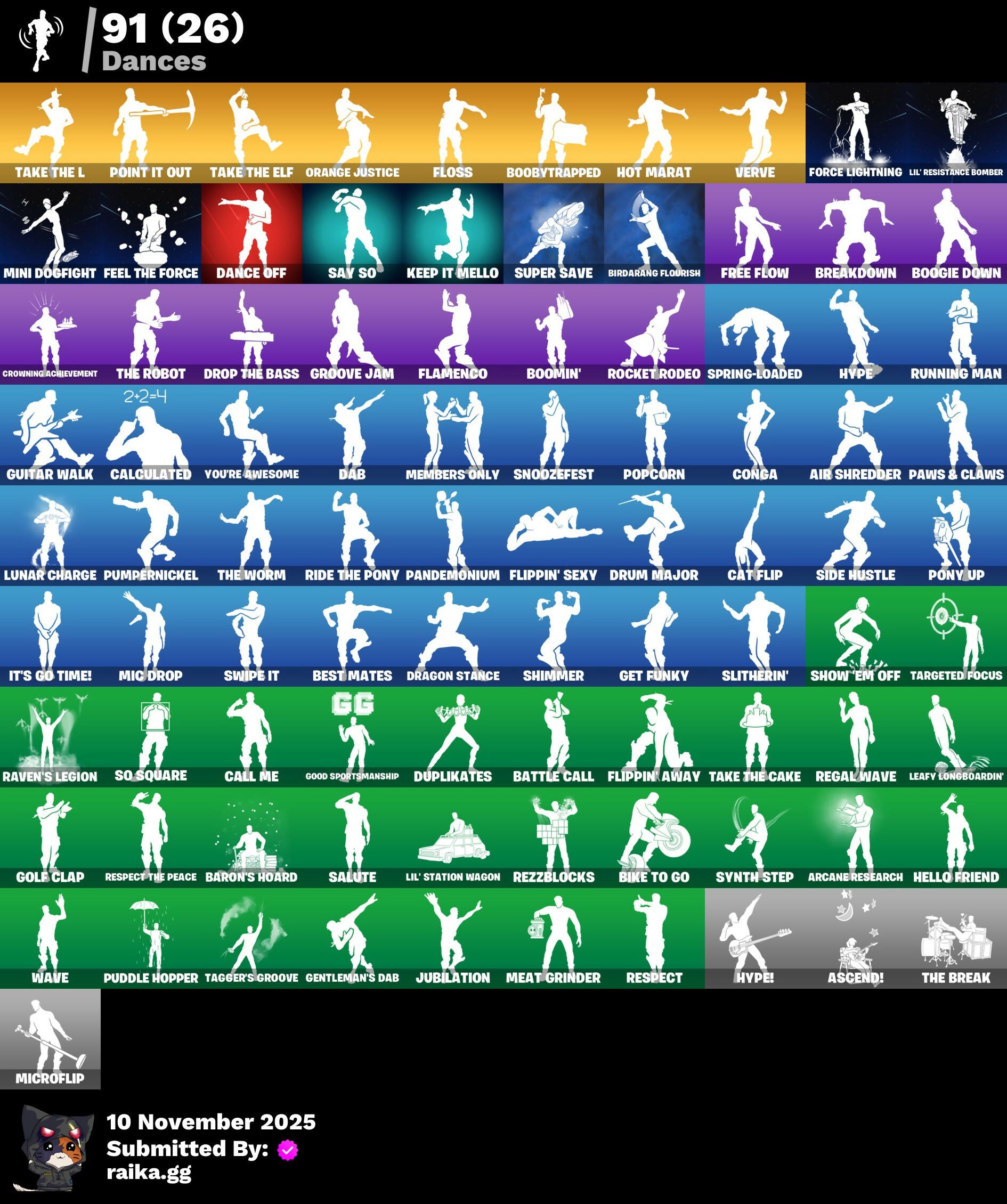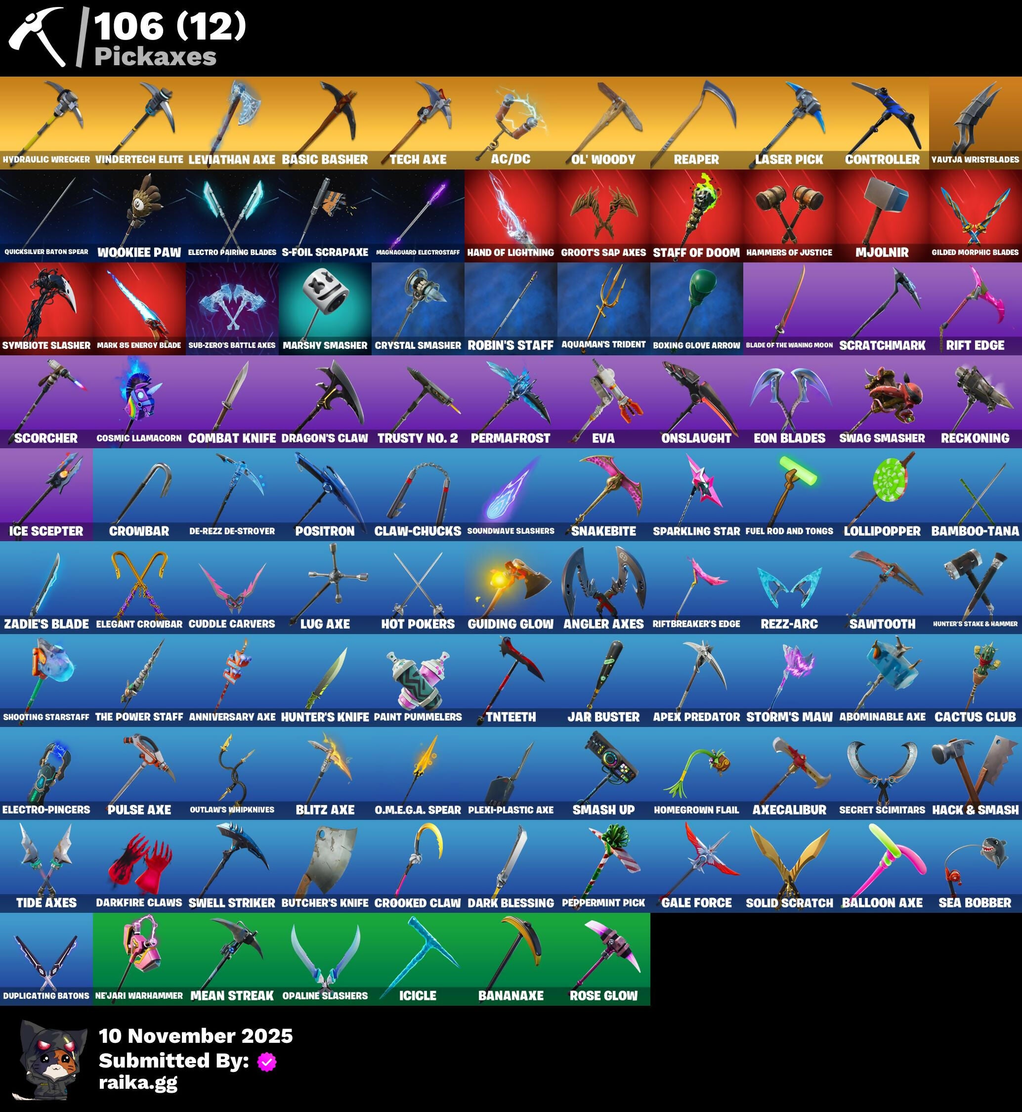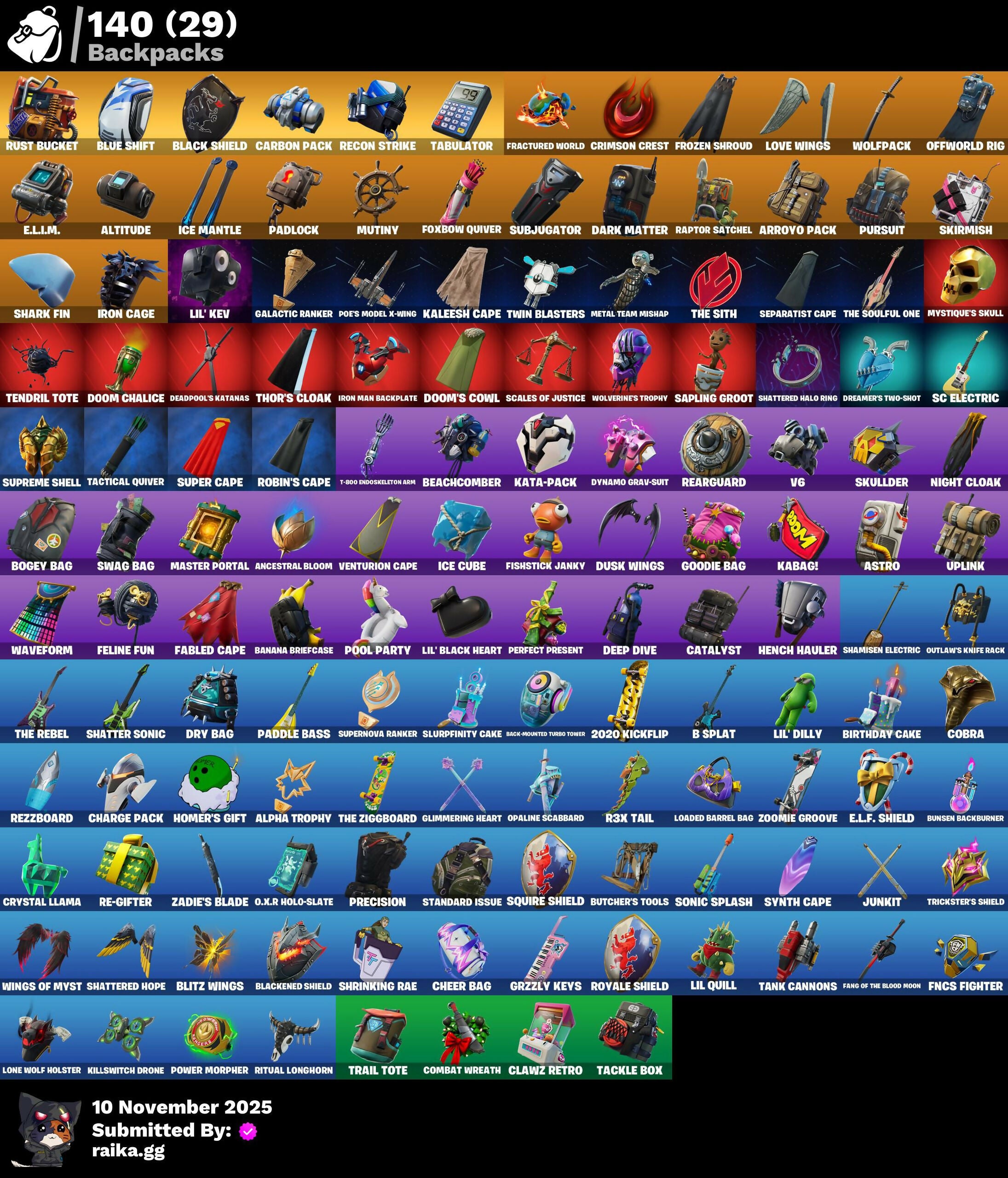 2020 Kickflip, A.I.M., AC/DC, Abominable Axe, Absolute Zero, Agent Jones, Agent Peely, Air Shredder, Alpha Trophy, Altitude, Ancestral Bloom, Angler Axes, Anniversary Axe, Apex Predator, Apprentice Evie, Aquaman, Aquaman's Trident, Arcane Energy Glider, Arcane Research, Arroyo Pack, Ascend!, Astro, Astroworld Cyclone, Axecalibur, B Splat, Back-Mounted Turbo Tower, Balloon Axe, Bamboo-Tana, Banana Briefcase, Bananaxe, Baron's Hoard, Basic Basher, Battle Call, Battlehawk, Beach Umbrella, Beachcomber, Beastmode, Best Mates, Big Haul, Bike To Go, Birdarang Flourish, Birthday Cake, Black Knight, Black One X-Wing, Black Shield, Blackened Shield, Blackheart, Blade Of The Waning Moon, Blitz 'Brella, Blitz Axe, Blitz Wings, Blue Shift, Blue Squire, Blue Streak, Blue Striker, Blue Team Leader, Bogey Bag, Bombs Away!, Boobytrapped, Boogie Down, Boomin', Boxing Glove Arrow, Breakdown, Brella, Brutus, Bullet Rider, Bunsen Backburner, Butcher's Knife, Butcher's Tools, Cactus Club, Calamity, Calculated, Call Me, Carbide, Carbon, Carbon Commando, Carbon Pack, Cat Flip, Catalyst, Charge Pack, Cheer Bag, Cheer Bolt, Chemist's Cloudglider, Chillest Vibe Rider, Chomp Sr., Cinder, Classified, Claw-Chucks, Clawz Retro, Coaxial Blue, Cobra, Codename E.L.F., Combat Knife, Combat Wreath, Conga, Conquest, Controller, Convergence, Cosmic Llamacorn, Covered Crusader, Crimson Crest, Crooked Claw, Crossfire, Crowbar, Crowning Achievement, Cruiser, Crystal Llama, Crystal Smasher, Cuddle Carvers, D'Ark, DJ Yonder, Dab, Daily Flight, Dance Off, Dark Blessing, Dark Charger, Dark Matter, Dark Voyager, Darkfire Claws, De-Rezz De-Stroyer, Deadpool, Deadpool's Katanas, Dealer's Deck, Death Star 'Brella, Deep Dive, Dire, Dire Flyer, Doctor Doom, Doom Chalice, Doom's Cowl, Downpour, Downshift, Dragon Stance, Dragon's Claw, Dreamer's Two-Shot, Drift, Drop The Bass, Drum Major, Dry Bag, Dupli-Kate, Duplicating Batons, Duplikates, Dusk, Dusk Knight, Dusk Wings, Dynamo Grav-Suit, E.L.F. Shield, E.L.I.M., Electro Pairing Blades, Electro-Pincers, Elegant Crowbar, Elite Agent, Enchanted Lifebloom, Enforcer, Eon Blades, Equalizer, Eva, FNCS Fighter, Fable, Fabled Cape, Fade, Fang of the Blood Moon, Feel The Force, Feline Fun, Fishstick Janky, Flamenco, Flappy, Flippin' Away, Flippin' Sexy, Floss, Force Lightning, Fortilla Flier, Founder's Glider, Founder's Umbrella, Fox Drifter, Foxbow Quiver, Fractured World, Free Flow, Frequency Flyer, Frozen Shroud, Fuel Rod And Tongs, Galactic Ranker, Galaxia, Gale Force, Gathering Storm, Gear Specialist Maya, General Grievous, Gentleman's Dab, Get Down!, Get Funky, Giddy-Up, Gilded Morphic Blades, Gli-Dar 3000, Glidurrr, Glimmering Heart, Golf Clap, Good Sportsmanship, Goodie Bag, Green Arrow, Grizzly Keys, Groot, Groot's Sap Axes, Groove Jam, Guff Gringle, Guiding Glow, Guild, Guitar Walk, Hack & Smash, Hammers Of Justice, Hand Of Lightning, Har-Har-Har!, Haylee Skye, Hello Friend, Hench Hauler, High Octane, Homegrown Flail, Homer's Gift, Hot Marat, Hot Pokers, Hunter's Knife, Hunter's Skyblade, Hunter's Stake & Hammer, Huntress, Hybrid, Hydraulic Wrecker, Hype, Hype!, Ice Cube, Ice Mantle, Ice Scepter, Icicle, Impact 'Brella, Intrepid, Iron Cage, Iron Man Backplate, It's Go Time!, Jar Buster, Jennifer Walters, Journey Vs Hazard, Jubilation, Junkit, Kabag!, Kaleesh Cape, Kata-Pack, Keep It Mello, Killswitch, Killswitch Drone, Klassic Kombat Crasher, Laser Pick, Leafy Longboardin', Leviathan Axe, Lightrider, Lil Quill, Lil' Black Heart, Lil' Dilly, Lil' Kev, Lil' Resistance Bomber, Lil' Station Wagon, Loaded Barrel Bag, Lockstep, Lollipopper, Lone Wolf Holster, Love Ranger, Love Wings, Lt. Evergreen, Lug Axe, Lunar Charge, Lynx, Magnaguard Electrostaff, Mako, Mandalorian, Mark 85 Energy Blade, Mark 90 Flight Pack, Marshy Smasher, Master Portal, Mean Streak, Meat Grinder, Members Only, Meowscles, Metal Team Mishap, Mic Drop, Microflip, Mighty Marvel 'Brella, Millennium Falcon, Mini Dogfight, Mission Specialist, Mjolnir, Mjolnir's Path, Moonwalker, Morgan Myst, Mutiny, Mystique, Mystique's Skull, Ne'jari Warhammer, Night Cloak, Nightshade, Nog Ops, O.M.E.G.A. Spear, O.X.R Holo-Slate, Ocean, Offworld Rig, Ol' Woody, Omega, Onesie, Onslaught, Opaline Scabbard, Opaline Slashers, Orange Justice, Outlaw's Knife Rack, Outlaw's Whipknives, Paddle Bass, Padlock, Paint Pummelers, Palm Leaf, Panda Parade, Pandemonium, Paper Parasol, Paws & Claws, Peely, Peppermint Pick, Perfect Present, Permafrost, Picnic, Pig The Butcher, Plexi-Plastic Axe, Plunder, Poe Dameron, Poe's Model X-Wing, Point It Out, Point Patroller, Pony Up, Pool Party, Popcorn, Positron, Powder, Power Morpher, Precision, Predator, Prodigy, Puddle Hopper, Pulse Axe, Pumpernickel, Punk Powerglider, Pursuit, Quicksilver Baton Spear, R3X Tail, Ragnarok, Rainbow Rider, Ranker's Vaultbrella, Raptor, Raptor Satchel, Raven, Raven's Legion, Razor Crest, Re-Gifter, Reaper, Rearguard, Rebel Wookiee Lander, Reckoning, Recon Strike, Red Robin's Wings, Redline, Redline Scout, Reese, Regal Wave, Rescue Board, Respect, Respect The Peace, Rezz-Arc, Rezzblocks, Rezzboard, Rickety Runner, Ride The Pony, Rift Edge, Riftbreaker's Edge, Ritual Longhorn, Robin, Robin's Cape, Robin's Staff, Rocket Rodeo, Rogue Agent, Ronin, Rook, Root Wing, Rose Glow, Rose Rider, Rose Team Leader, Royale Air, Royale Knight, Royale Shield, Royale X, Running Man, Rust Bucket, Rust Lord, S-Foil Scrapaxe, SC Electric, Salute, Sapling Groot, Sarah Connor, Sawtooth, Say So, Scales of Justice, Scorcher, Scratchmark, Scuba Jonesy, Sea Bobber, Secret Scimitars, Separatist Cape, Seven Glider, Seven Signet, Sgt. Winter, Shamisen Electric, Shanta, Shark Fin, Shatter Sonic, Shattered Halo Ring, Shattered Hope, Shimmer, Shooting Starstaff, Show 'Em Off, Shrinking Rae, Side Hustle, Sidewinder, Sir Glider The Brave, Skellefish, Skirmish, Skullder, Sky Serpents, Sky Trawler, Sledgehammer, Slitherin', Slurpfinity Cake, Smash Up, Snakebite, Snoozefest, Snowfall, Snowflake, So Square, Solid Scratch, Son