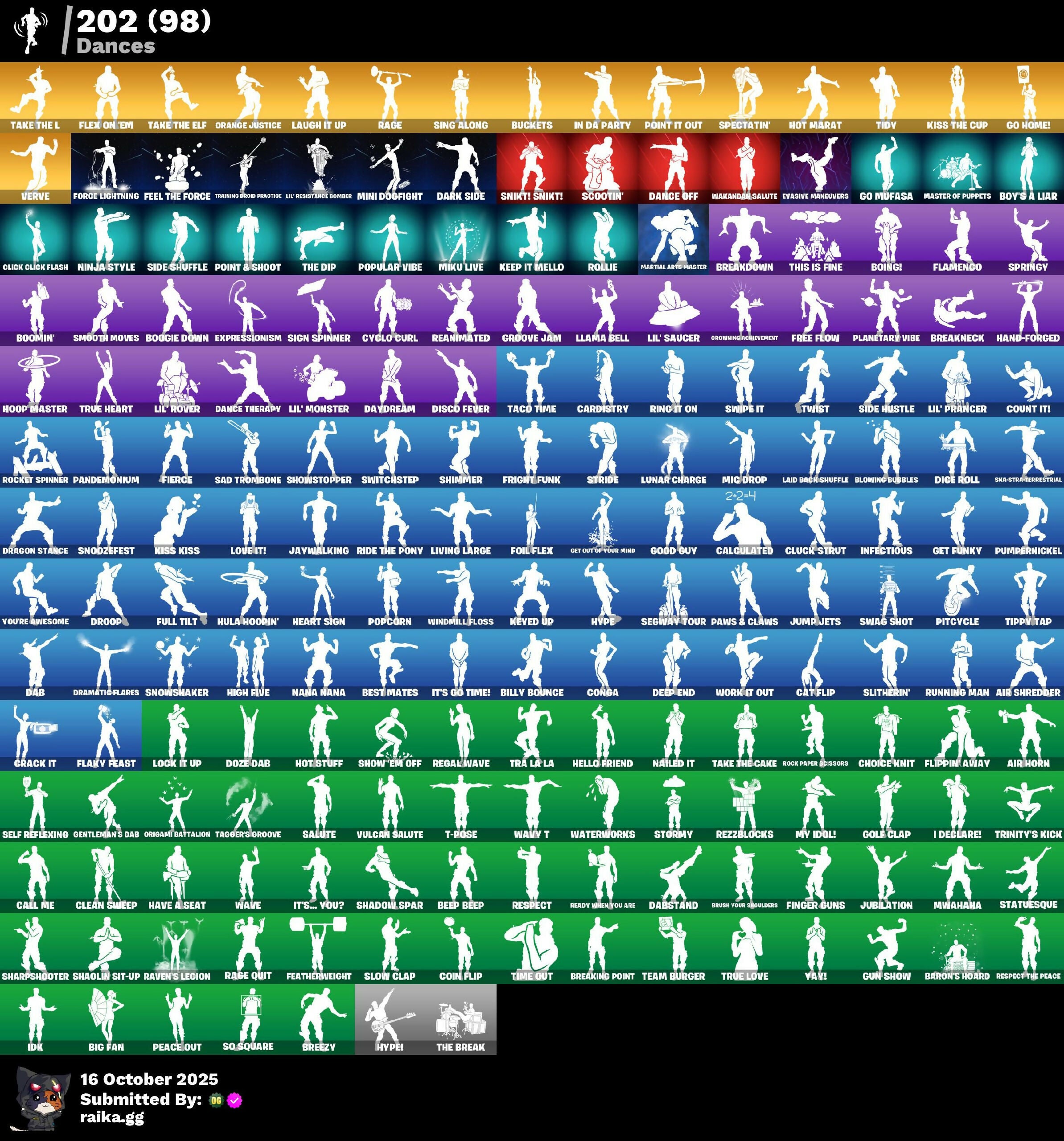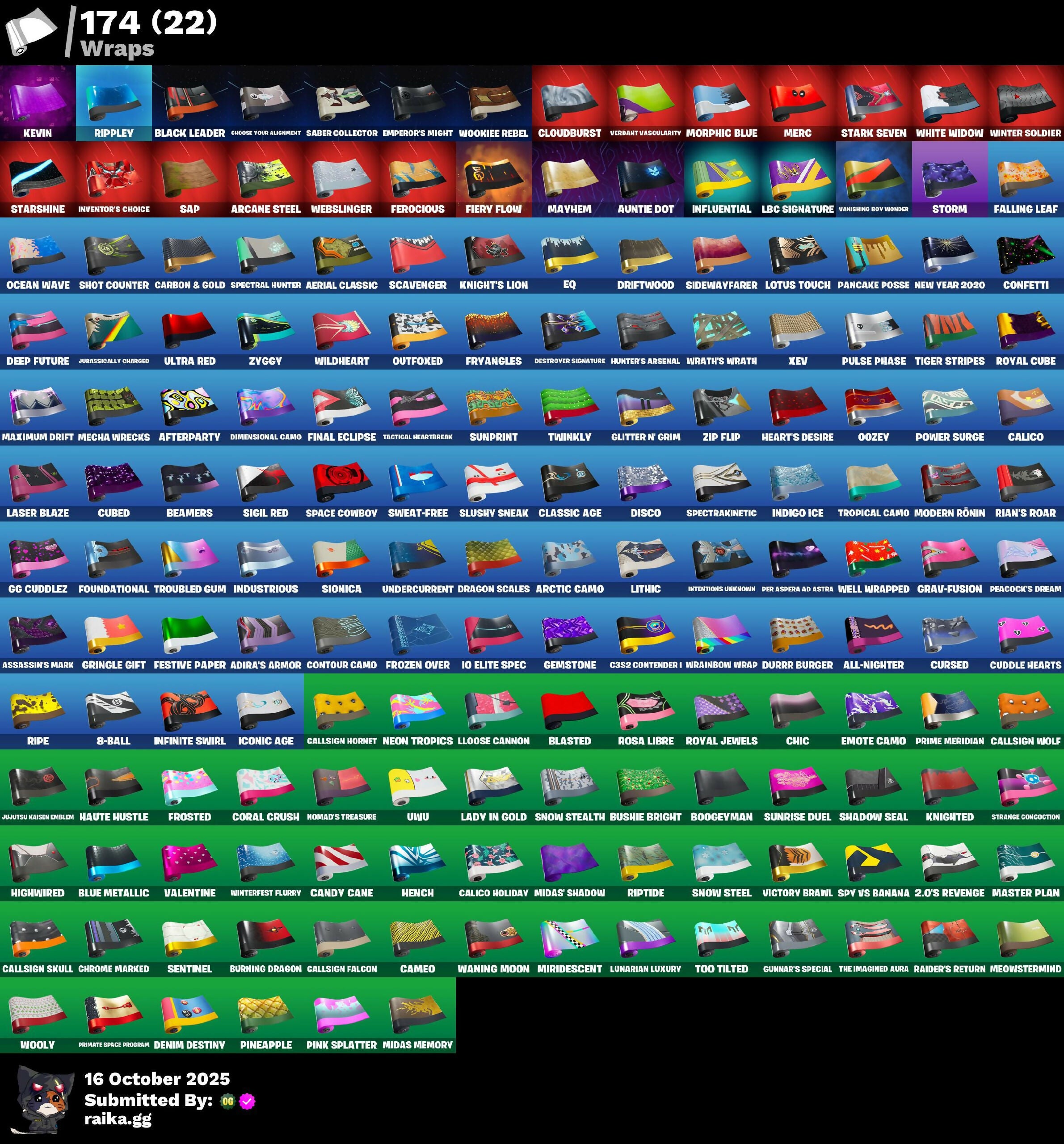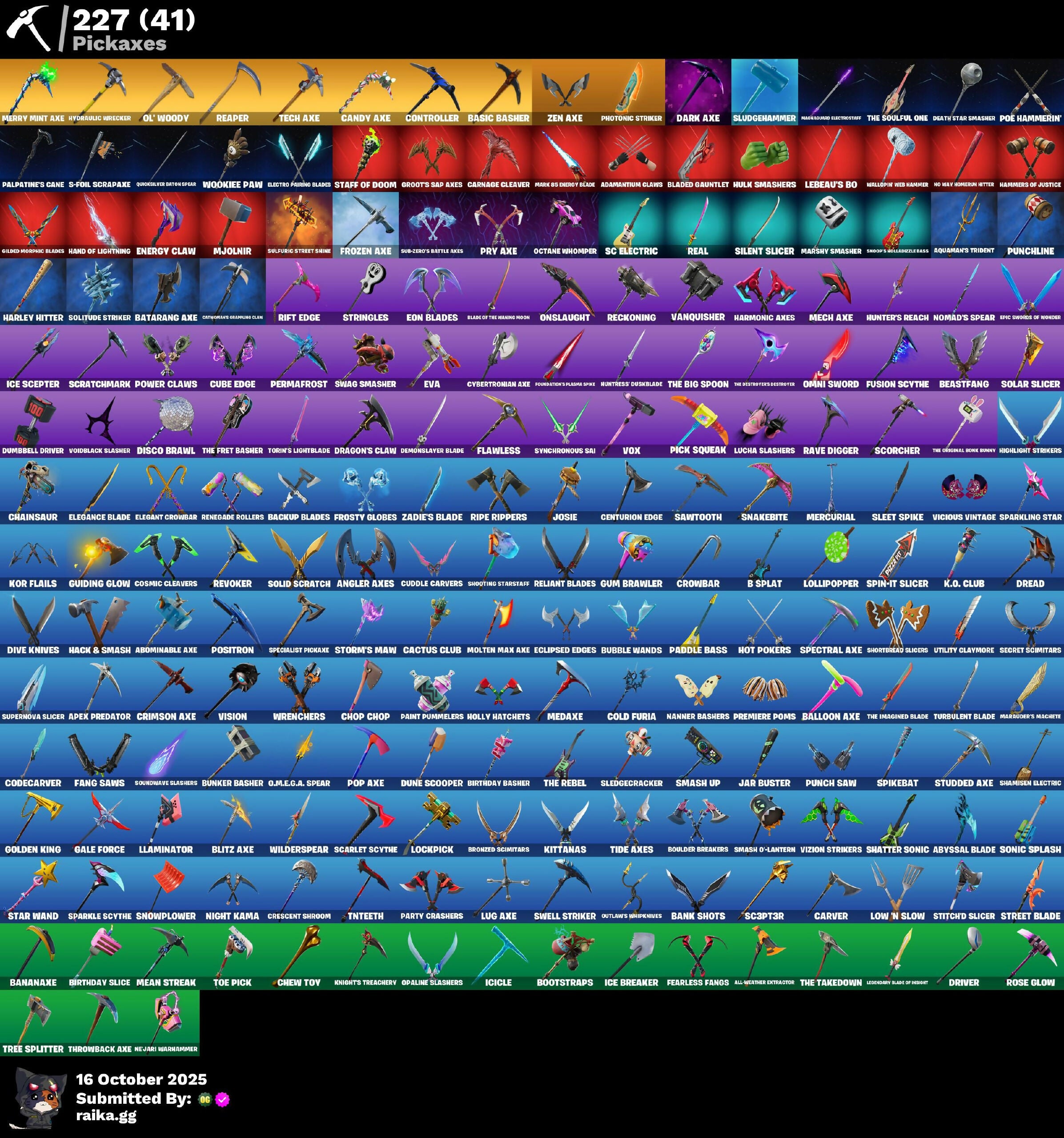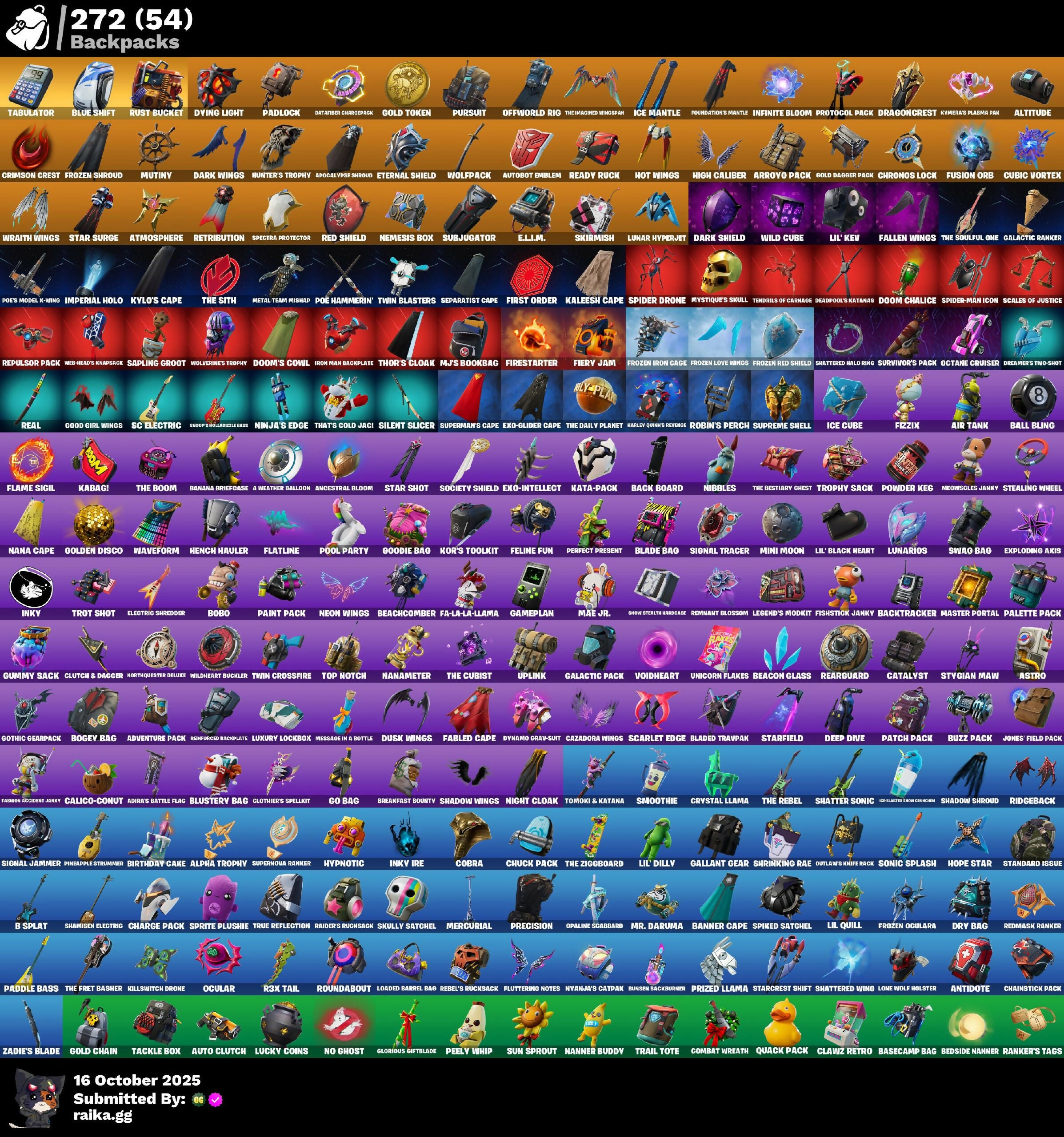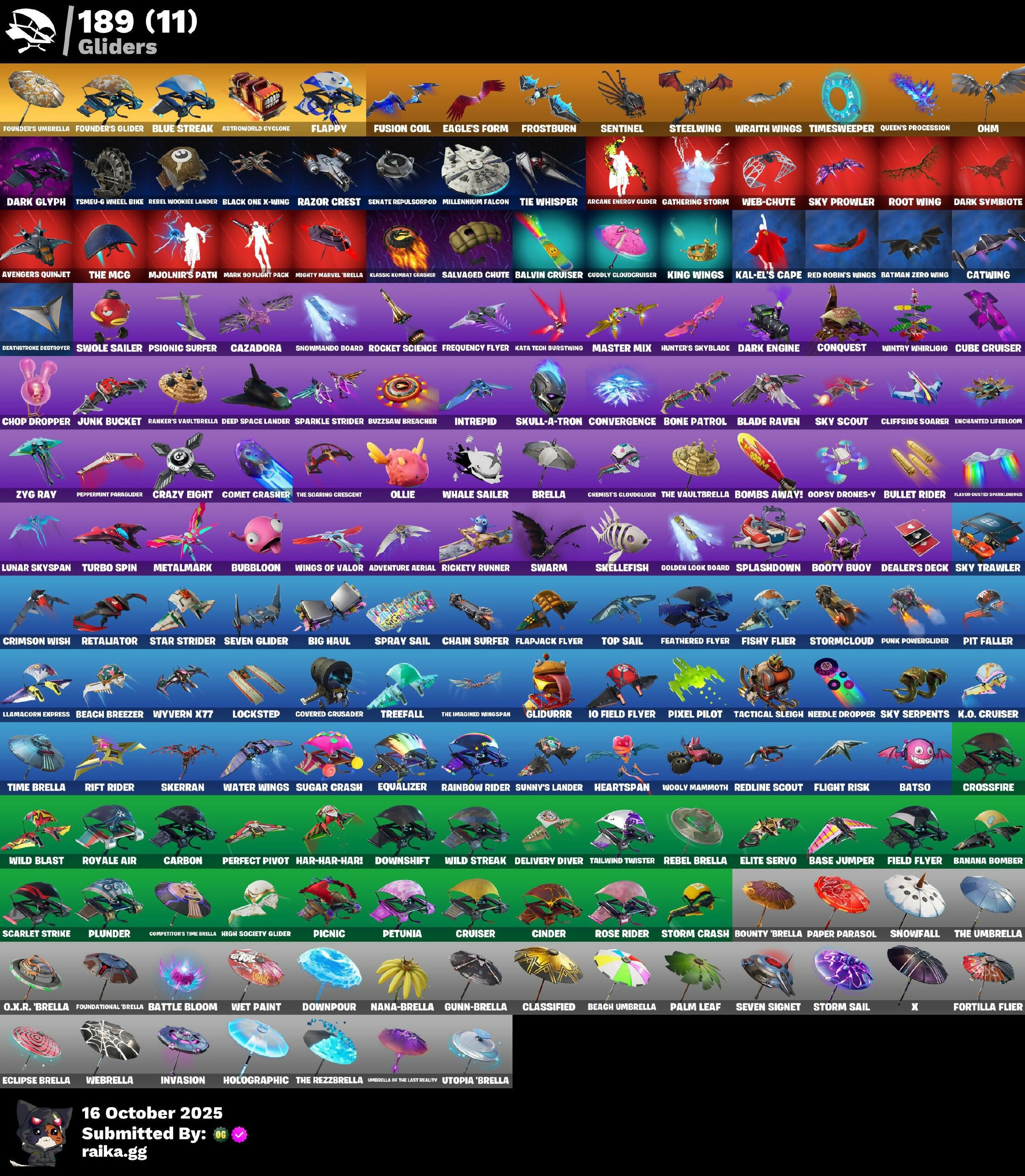 10 Elite Spec, 2.0's Revenge, 8-Ball, 8-Ball Vs Scratch, A Weather Balloon, A.I.M., Abominable Axe, Absenz, Abyssal Blade, Adamantium Claws, Adira's Armor, Adira's Battle Flag, Adventure Aerial, Adventure Pack, Aerial Classic, Aftermath, Afterparty, Agent Jones, Agent Peely, Air Horn, Air Shredder, Air Tank, All-Nighter, All-weather Extractor, Alpha Trophy, Altitude, Ancestral Bloom, Angler Axes, Aniyah, Antidote, Antonia, Apex Predator, Apocalypse Shroud, Apprentice Evie, Aquaman, Aquaman's Trident, Arcane Energy Glider, Arcane Steel, Arctic Adeline, Arctic Camo, Armored Batman Zero, Arrrovo Pack, Asmodeus, Assassin's Mark, Astrea, Astro, Astro Antidote, Astro Jack, Astroworld Cyclone, Atmosphere, Auntie Dot, Aura, Aura Analyzer, Auto Clutch, Autobot Emblem, Avengers Quinjet, B Splat, Back Board, Backtracker, Backup Blades, Ball Bling, Balloon Axe, Balvin Cruiser, Banana Bomber, Banana Briefcase, Bananaxe, Bank Shots, Banner Cape, Baron's Hoard, Base Jumper, Basecamp Bag, Basic Basher, Batarang Axe, Batman Zero Wing, Batso, Battle Bloom, Battle Bus, Battlehawk, Beach Breezer, Beach Umbrella, Beachcomber, Beacon Glass, Beamers, Beastfang, Bedside Nanner, Beep Beep, Best Mates, Big Fan, Big Haul, Billy Bounce, Birdie, Birthday Basher, Birthday Cake, Birthday Slice, Black Leader, Black One X-wing, Blackheart, Blade Bag, Blade Raven, Blade of the Waning Moon, Bladed Gauntlet, Bladed Travpak, Blasted, Blaze, Blitz Axe, Blizzabelle, Blowing Bubbles, Blue Metallic, Blue Shift, Blue Streak, Blue Striker, Blue Team Leader, Blustery Bag, Bobo, Bogey Bag, Boing!, Bombs Away!, Bone Patrol, Boogeyman, Boogie Down, Boomin', Bootstraps, Booty Buoy, Boulder Breakers, Bounty 'Brella, Boy's A Liar, Breakdown, Breakfast Bounty, Breaking Point, Breakneck, Breakpoint, Breezabelle, Breezy, Brella, Bronzed Scimitars, Brush Your Shoulders, Bubble Wands, Bubbloon, Buckets, Bullet Rider, Bunker Basher, Bunker Jonesy, Bunsen Backburner, Burning Dragon, Bushie Bright, Buzz Pack, Buzzsaw Breacher, C3S2 Contender I, Cactus Club, Calamity, Calculated, Calico, Calico Holiday, Calico-Conut, Call Me, Callsign Falcon, Callsign Hornet, Callsign Skull, Callsign Wolf, Cameo, Cameo Vs Chic, Candy Axe, Candy Cane, Caper, Carbide, Carbon, Carbon & Gold, Cardistry, Carnage, Carnage Cleaver, Carver, Cat Flip, Catalyst, Catwing, Catwoman Zero, Cazadora, Cazadora Wings, Centurion, Centurion Edge, Chain Surfer, Chainsaur, Chainstick Pack, Charge Pack, Charlotte, Chemist's Cloudglider, Chew Tov, Chic, Choice Knit, Chop Chop, Chop Dropper, Chrome Marked, Chronos Lock, Chuck Pack, Cinder, Clark Kent, Classic Age, Classified, Clawz Retro, Clean Sweep, Click Click Flash, Cliffside Soarer, Cloaked Shadow, Clothier's Spellkit, Cloudburst, Cluck Strut, Clutch & Dagger, Cobalt, Cobra, Codecarver, Coin Flip, Cold Furia, Combat Wreath, Comet Crasher, Commando, Competitor's Time Brella, Confetti, Conga, Conquest, Constructor, Contour Camo, Controller, Convergence, Coral Crush, Cosmic Cleavers, Count It!, Covered Crusader, Crack It, Crazy Eight, Crescent Shroom, Crimson Axe, Crimson Crest, Crimson Wish, Crossfire, Crowbar, Crowning Achievement, Cruiser, Cryptokev's Climbing Claw, Crystal Llama, Cube Assassin, Cube Cruiser, Cube Edge, Cubed, Cubic Vortex, Cuddle Carvers, Cuddle Hearts, Cuddly Cloudcruiser, Cursed, Cybertronian Axe, Cyclo Curl, Dab, Dabstand, Dahlia, Dance Off, Dance Therapy, Dark Axe, Dark Engine, Dark Glyph, Dark Jonesy, Dark Red Knight, Dark Shield, Dark Side, Dark Symbiote, Dark Wild Card, Dark Wings, Databiter Chargedgun, Daydream, Dazzle, Deadpool, Deadpool's Katanas, Dealer's Deck, Death Star Smasher, Deathstroke Destroyer, Deep Dive, Deep End, Deep Future, Deep Space Lander, Delivery Diver, Demi, Demonslayer Blade, Denim Destiny, Destroyer Signature, Dice Roll, Dimensional Camo, Dire, Disco, Disco Brawl, Disco Fever, Dive Knives, Dj Yonder, Doctor Doom, Dominion, Doom Chalice, Doom's Cowl, Downpour, Downshift, Doze Dab, Dragon Scales, Dragon Stance, Dragon's Claw, Dragoncrest, Dramatic Flares, Dread, Dream, Dreamer's Two-Shot, Drift, Driftwood, Driver, Droop, Dry Bag, Dumbbell Driver, Dune Scooper, Durrr Burger, Dusk, Dusk Knight, Dusk Wings, Dying Light, Dynamo, Dynamo Grav-Suit, E.L.I.M., EQ, EVA, EXO-Glider Cape, EXO-Intellect, Eagle's Form, Echo, Eclipse Brella, Eclipsed Edges, Electric Shredder, Electro Pairing Blades, Elegance Blade, Elegant Crowbar, Elite Servo, Ember, Emote Camo, Emperor Palpatine, Emperor's Might, Enchanted Lifebloom, Energy Claw, Enforcer, Envoy, Eon Blades, Epic Swords of Wonder, Equalizer, Era, Eternal Knight, Eternal Shield, Eternal Voyager, Evasive Maneuvers, Exploding Axis, Expressionism, Fa-La-La-Llama, Fabio Sparklemane, Fable, Fabled Cape, Fade, Fallen Love Ranger, Fallen Wings, Falling Leaf, Fang Saws, Fearless Fangs, Feathered Flyer, Featherweight, Feel The Force, Feline Fun, Ferocious, Festive Paper, Field Flyer, Fierce, Fiery Flow, Fiery Jam, Final Eclipse, Finger Guns, Firestarter, First Order, Fish Thicc, Fishstick Janky, Fishy Flier, Fizzix, Flaky Feast, Flame Sigil, Flamenco, Flapjack Flyer, Flapjackie, Flappy, Flatline, Flavor-Boosted Sparklingwing, Flawless, Flex On 'Em, Flight Risk, Flippin Away, Fluttering Notes, Focus, Foil Flex, Force Lightning, Fortilla Flier, Foundation's Mantle, Foundation's Plasma Spike, Foundational, Foundational 'Brella, Founder's Glider, Founder's Umbrella, Free Flow, Frequency Flyer, Fright Funk, Frostburn, Frosted, Frosty Globes, Frozen Axe, Frozen Iron Cage, Frozen Love Ranger, Frozen Love Wings, Frozen Oculara, Frozen Over, Frozen Raven, Frozen Red Knight, Frozen Red Shield, Frozen Shroud, Fry Angles, Full Tilt, Funk Ops, Fusion, Fusion Coil, Fusion Orb, Fusion Scythe, GG Cuddlez, Galactic Pack, Galactic Ranker, Gale Force, Gallant Gear, Gameplan, Gathering Storm, Gear Specialist Maya, Gemstone, General Grievous, Gentleman's Dab, Get Funky, Get Out Of Your Mind, Giddy-Up, Gilded Morphic Blades, Glidurrr, Glitter N' Grim, Glorious Giftblade, Go Ba