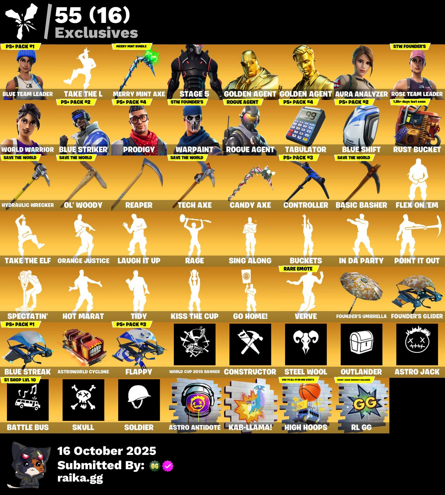 [PC/XBOX] 254 skins | OG STW | Take The L | STAGE 5 | Merry Mint Axe | GOLDEN AGENT | Blue Team Leader | GOLDEN AGENT | Aura Analyzer | World Warrior | Blue Striker | Prodigy | 50 VB
