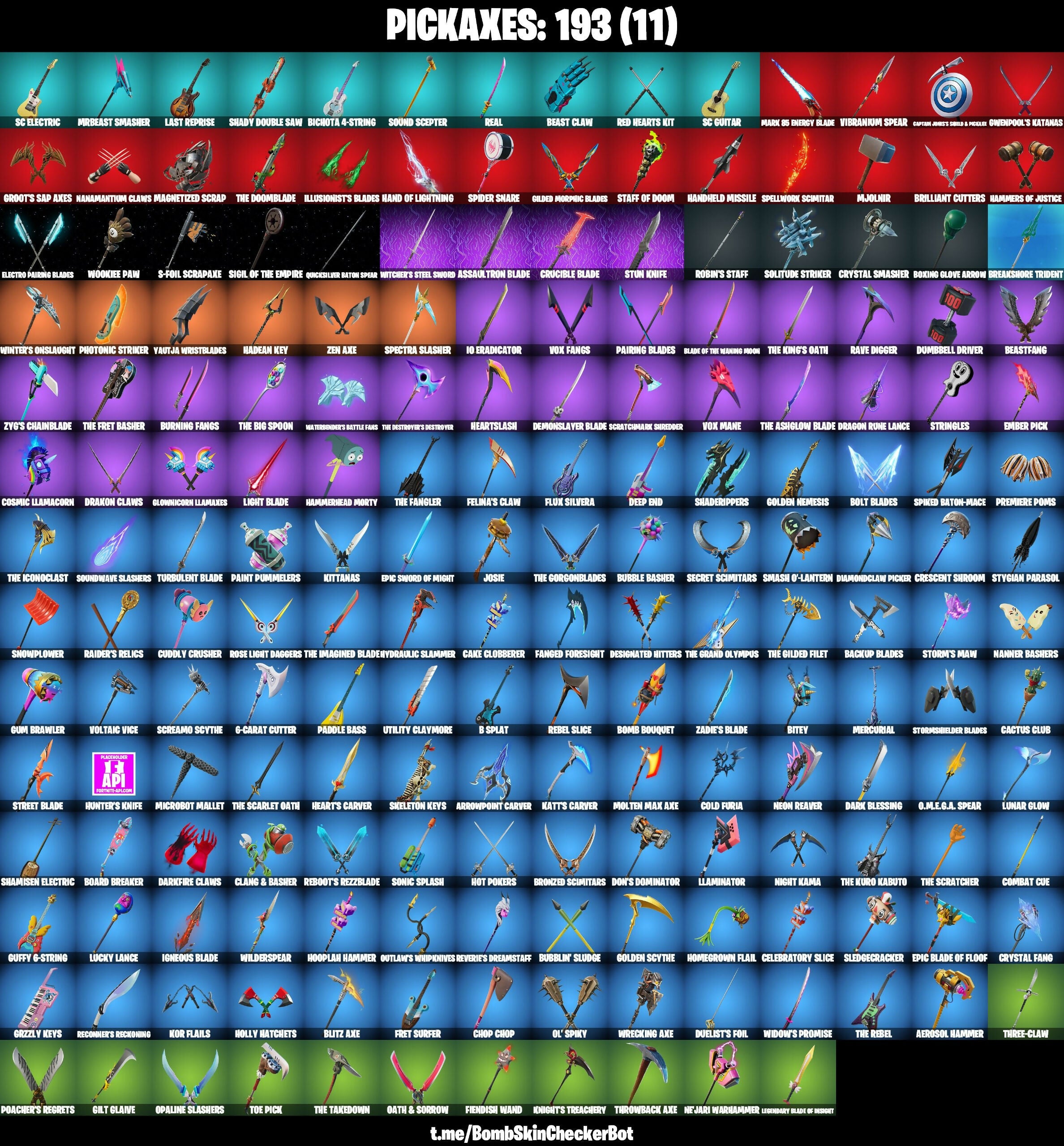 (Shift!), 1-Ball, 6-Carat Cutter, Adira, Aerosol Hammer, Aftermath, Alley Hangout, Aphrodite, Arrowpoint Carver, Asmr Keys, Assaultron Blade, Avatar's Flourish, Aw, Shucks., Ayla Winn, B Splat, Backup Blades, Balance Board, Ballsy, Beast Claw, Beastfang, Bichota 4-String, Bike To Go, Birdarang Flourish, Bitey, Blade Of The Waning Moon, Blitz Axe, Blitz Knight, Blowin' Up, Board Breaker, Bolt Blades, Bomb Bouquet, Bonde Do Brunão, Bonejamin, Boogie Down, Boomin', Bow Go, Boxing Glove Arrow, Breakpoint, Breakshore Trident, Brilliant Cutters, Brite Moves, Brite Raider, Bronzed Scimitars, Bruno Mars, Bubble Basher, Bubblin' Sludge, Burning Fangs, Cactus Club, Cake Clobberer, California Love, Captain Clamerica, Captain Jones, Card Drop, Cauldron Chill, Celebratory Slice, Cerberus, Chaos Director, Charlotte, Choice Knit, Chop Chop, Chrome Punk, Clang & Basher, Clark Kent, Clean Sweep, Codsworth's Cleanop, Cold Furia, Combat Cue, Conch Call, Controller Crew, Cosmic Llamacorn, Crescent Shroom, Crowning Achievement, Crucible Blade, Crystal Fang, Crystal Smasher, Cuddly Crusher, Curling Iron, Cyclo Curl, Dagger Dance, Dali, Dare, Dark Blessing, Darkfire Claws, Darth Vader, Deep End, Demonslayer Blade, Designated Hitters, Diamond Diva, Diamond Throne, Diamondclaw Picker, Die With A Smile Bruno, Disassemble, Dizzie, Do The 'Split, Doctor Doom, Doctor Slone, Don's Dominator, Doom, Doom Slayer, Doom's Domain, Doze Dab, Dragon Rune Lance, Drakon Claws, Drakon Steel Hybrid, Dude, Duelist's Foil, Dumbbell Driver, Dusty, Dynamo Tntina, D’Ark, Electro Pairing Blades, Ember Pick, Emma Frost, Epic Blade Of Floof, Epic Sword Of Might, Evie, Evil Plan, Fabio Sparklemane, Fanged Foresight, Felina, Felina's Claw, Festival Phaedra, Fiendish Wand, Fire Show, Fireworks Salvo, Fist Bump, Flashback Breakdown, Flux Silvera, Focused, Foil Flex, Fret Surfer, Frozone's Stunt, Galaxia, Galaxian, Geralt Of Rivia, Get Schwifty, Gilded Morphic Blades, Gildhart, Gilt Glaive, Gloss, Glownicorn Llamaxes, Golden Nemesis, Golden Scythe, Good Game, Well Played, Good Guy, Green Arrow, Grizzly Keys, Groot, Groots Sap Axes, Guffy 6-String, Guggimon, Guild, Gum Brawler, Gumbo, Gun Show, Gwen-Step, Gwenpool, Gwenpool's Katanas, Hadean Key, Hammerhead Morty, Hammers Of Justice, Hand Of Lightning, Handheld Missile, Haven, Haylee Skye, Heart Sign, Heart's Carver, Heartburst, Heartslash, Hellfire Dance, Holiday Boxy, Holly Hatchets, Homegrown Flail, Hooplah Hammer, Hope, Hot Pokers, Hunter's Knife, Hydraulic Slammer, Hype!, Hypnot-Eyes, I'm A Mystery, Igneous Blade, Igni Sign, Illusionist's Blades, Imperial March, In Da Party, Indiana Jones, Io Eradicator, It Is Finished, J Balvin, Jennifer Walters, Jet Signals, Joey, Jonesy The First, Joni The Red, Josie, Juri Slide, Katt, Keri Commander, Kick Back, Killswitch, Kittanas, Knife Sharpener, Knight's Treachery, Kondor, Kor, Kor Flails, Korra, Krisabelle, Kymera, Lana Llane, Last Reprise, Leafy Longboardin', Legendary Blade Of Insight, Light Blade, Lightrider, Lil Split, Lil' Longboat, Lil' Monster, Lil' Prancer, Lil' Saucer, Lil' Warthog, Limber Up, Llaminator, Love It!, Lt. John Llama, Lucky Lance, Lunar Charge, Lunar Glow, Lunar Party, Magnetized Scrap, Make A Seat, Malik, Mancake, Mandalorian, Marika, Mark 85 Energy Blade, Massai, Mave, Mecha Strike Commander, Medusa, Megalo Don, Members Only, Meowdas, Mercurial, Mezmer, Microbot Mallet, Mini Doofight, Mini Slayer Fistbump, Mjolnir, Molten Max Axe, Montague, MrBeast6000, Mrbeast Smasher, Mwahaha, Mysterio, Mysterious Magic Trick, Mystique, Nailed It, Nanner Bashers, Nanomantium Claws, Nefari Warhammer, Neon Reaver, Never Gonna, Nezumi, Night Kama, Ninja Stance: Donnie, Ninja Stance: Leo, Ninja Stance: Mikey, Ninja Stance: Raph, Nisha, Nitro Fueled, O.M.E.G.A. Diagnostic, O.M.E.G.A. Spear, O.M.E.G.A. Suit Alpha, Oath & Sorrow, Ol' Spiky, Omegarok, Opaline Slashers, Oscar, Out West, Outlaw's Whipknives, Paddle Bass, Paint Pummelers, Pairing Blades, Parade Riffs, Party Hips, Pea Part Harmony, Peabody, Peel Out, Peelverine, Peter Griffin, Phaedra, Photonic Striker, Pizza Party, Poacher's Regrets, Pokey-Tar, Polar Peely, Polus, Popular Vibe, Poseidon, Predator, Premiere Poms, Pump Up The Jam, Purr-Demonium, Quicksilver Baton Spear, Raiders Relics, Rap Boy, Rave Digger, Raven's Legion, Real, Real Slim Shady, Rebel Slice, Reboot Man, Reboot's Rzzblade, Reconner's Reconning, Red Hearts Kit, Reese, Renegade Lynx, Reverie, Reverie's Dreamstaff, Rezzblocks, Rhythm Of Chaos, Rick Sanchez, Ringmaster Scarr, Robin, Robin's Staff, Rock Paper Scissors, Rogue Spider Knight, Ronin, Rose Light Daggers, Runway Racer, Rushin' Around, Rust, S-Foil Scravase, Sabina, Sabrina Carpenter, Sc Electric, Sc Guitar, Scratchmark Shredder, Screamo Scythe, Secret Scimitars, Seeker, Selene, Serpentine Summoning, Sgt. Green Clover, Shadebox, Shaderippers, Shady Double Saw, Shamisen Electric, Shanta, Shaolin Sit-Up, Shuri, Shuriken Spinner, Sigil Of The Empire, Sing Along, Ska-Stra-Terrestrial, Skatemonster, Skeleton Keys, Skull Scout, Sledgecracker, Slim Shady, Smash O'-Lantern, Snackin', Snap, Snowplover, Solid Snake, Solitude Striker, Sonia, Sonic Splash, Sonor, Sound Scepter, Soundwave Slashers, Spectra Knight, Spectra Slasher, Spellwork Scimitar, Spider Snare, Spiked Baton-Mace, Staff Of Doom, Stand Surfer, Standing Bow, Starlit, Steady, Storm, Storm's Maw, Stormfarer, Stormshielder Blades, Street Blade, Street Wave Teknique, Stringles, Stun Knife, Stygian Parasol, Summer Skye, Sunny, Surfin' Bird, Sweet Swing, Symbol Of Peace, Synth Step, Synthwave, T-60 Power Armor, Tagger's Groove, Take A Bow, Targeted Focus, Tempest Flight, Tess, The Ashglow Blade, The Big Spoon, The Brat, The Break, The Break Shot, The Burning Wolf, The Destroyer's Destroyer, The Dip, The Doomblade, The Fangler, The Fret Basher, The Gilded Filet, The Gorgonblades, The Grand Olympus, The Iconoclast, The Imagined Blade, The King's Oath, The Kuro Kabuto, The Machinist, The Rebel, The Rick Dance, The